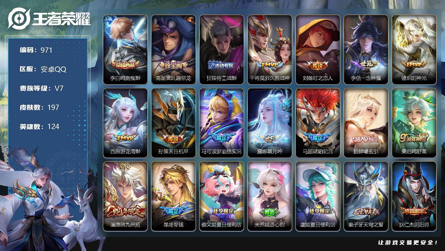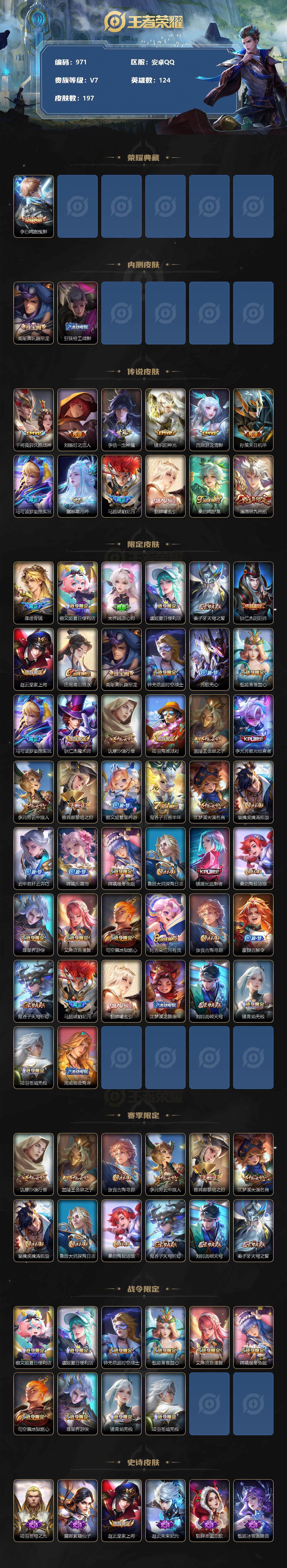 [10960119]【商品标题】:安卓Q-V7-永恒钻石IV段位-124英雄-197皮肤-1典藏-0珍品无双-0无双-0珍品传说-12传说-56史诗