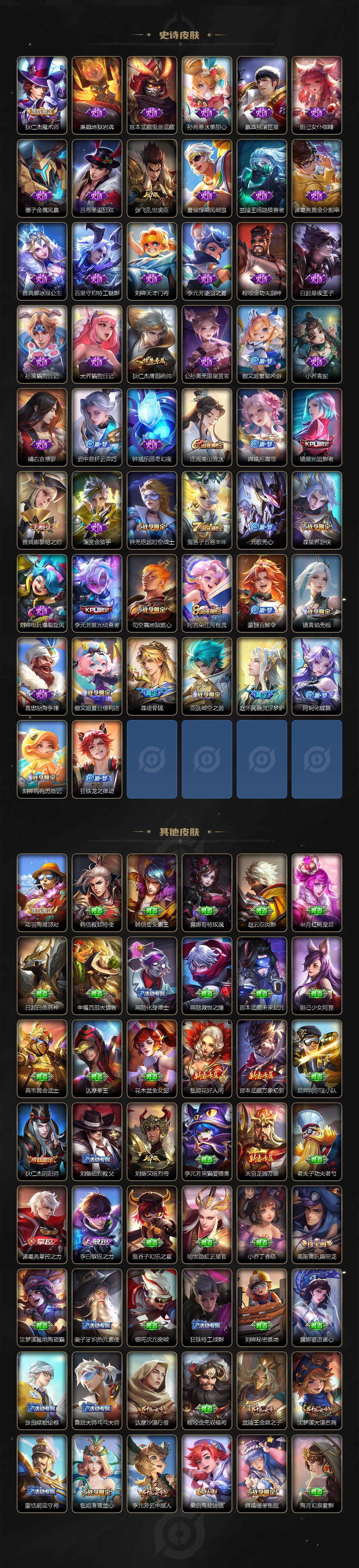 【史诗皮肤】:项羽苍穹之光,露娜紫霞仙子,赵云皇家上将,赵云未来纪元,貂蝉圣诞恋歌,甄姬冰雪圆舞曲,狄仁杰魔术师,廉颇地狱岩魂,宫本武藏鬼剑武藏,孙尚香水果甜心,嬴政摇滚巨星,妲己女仆咖啡,墨子金属风暴,吕布圣诞狂欢,张飞乱世虎臣,夏侯惇乘风破浪,兰陵王暗隐猎兽者,诸葛亮黄金分割率,雅典娜冰冠公主,百里守约特工魅影,刘禅天才门将,李元芳逐浪之夏,程咬金功夫厨神,白起星夜王子,孙策猫狗日记,大乔猫狗日记,狄仁杰鹰眼统帅,公孙离无限星赏官,蔡文姬繁星吟游,小乔青蛇,橘右京修罗,云中君纤云弄巧,钟馗乐园奇幻夜,庄周高山流水,嫦娥拒霜思,镜匿光追影者,雅典娜黎明之约,澜赏金猎手,钟无艳超时空