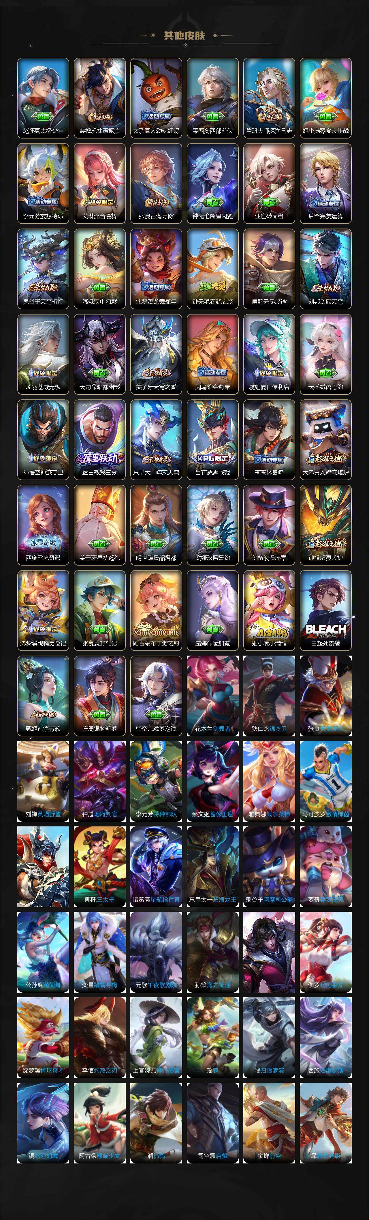 小乔青蛇,李元芳逐浪之夏,公孙离无限星赏官,大乔猫狗日记,孙策猫狗日记,露娜紫霞仙子,诸葛亮黄金分割率,项羽苍穹之光,雅典娜冰冠公主,橘右京修罗,嬴政摇滚巨星,刘禅天才门将,白起星夜王子,程咬金功夫厨神,兰陵王暗隐猎兽者,宫本武藏鬼剑武藏,钟馗乐园奇幻夜,廉颇地狱岩魂,夏侯惇乘风破浪,墨子金属风暴,吕布圣诞狂欢,貂蝉圣诞恋歌,百里守约特工魅影,嫦娥拒霜思,雅典娜黎明之约,澜赏金猎手,刘禅电玩·爆裂旋风,李元芳匿光侦查者,蒙犽百解令,赵怀真器灵·浮梦炉