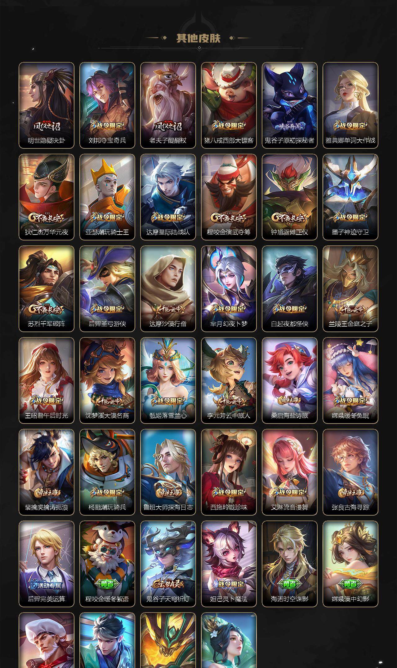 扁鹊炼金王,虞姬凯尔特女王,白起狰,太乙真人饕餮,曹操烛龙,芈月重明,典韦穷奇,狂铁御狮,米莱狄御霄,牛魔御旌,盾山御銮,夏侯惇朔风刀,明世隐疑决卦,老夫子醍醐杖,鬼谷子原初探秘者,狄仁杰万华元夜,程咬金演武夺筹,钟馗驱傩正仪,苏烈千军破阵,吕布猎兽之王,嬴政白昼王子,女娲朔望之晖,典韦蓝屏警告,沈梦溪星空之诺,李元芳银河之约,刘邦夺宝奇兵,马可波罗暗影游猎,蒙犽狂想玩偶喵,元歌云间偶戏,弈星混沌棋,达摩沙漠行僧,兰陵王金庭之子,沈梦溪大漠名商,李元芳云中旅人,桑启海盐诗旅,裴擒虎擒涛扼浪,鲁班大师探海日志,张良古海寻踪