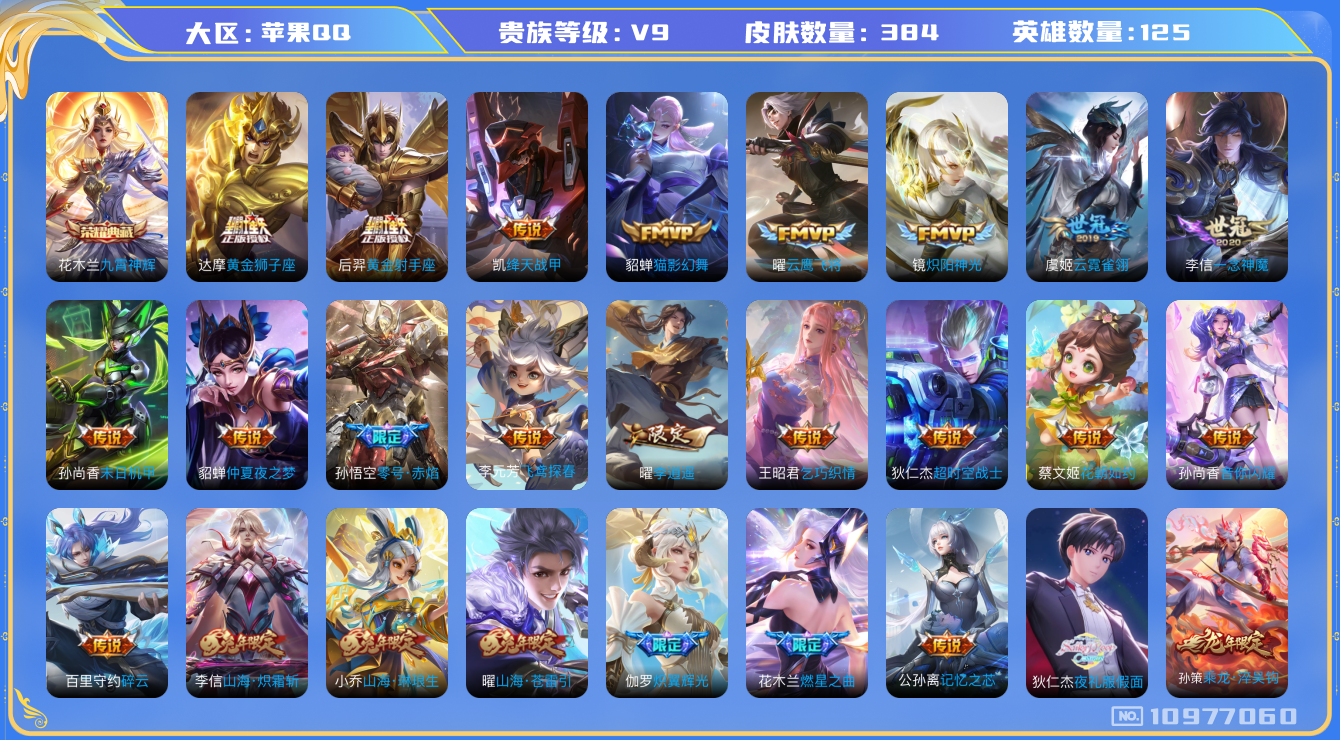 [10977060]【商品标题】:苹果Q-V9-最强王者段位-125英雄-384皮肤-1典藏-0珍品无双-0无双-0珍品传说-39传说-124史诗