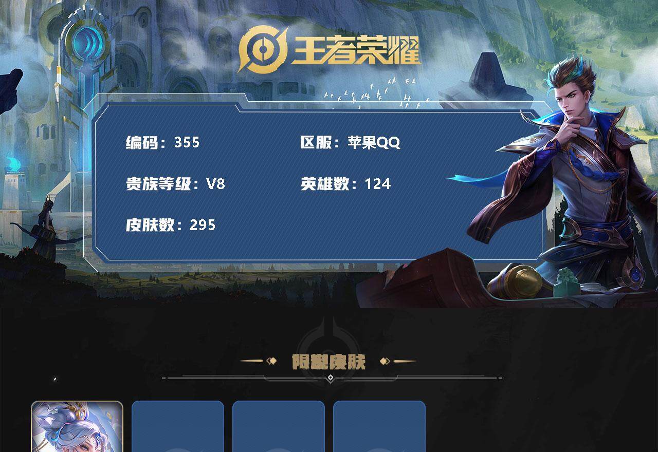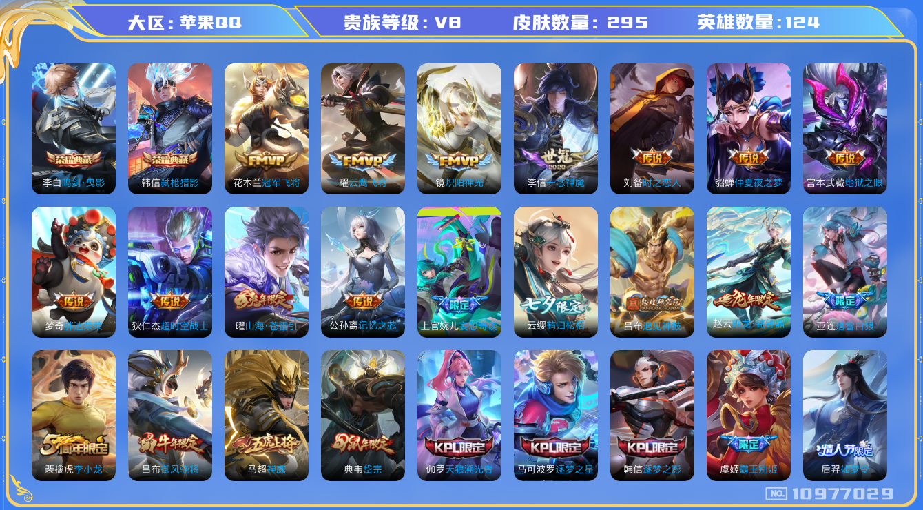 [10977029]【商品标题】:苹果Q-V8-最强王者段位-124英雄-295皮肤-2典藏-0珍品无双-0无双-0珍品传说-24传说-97史诗