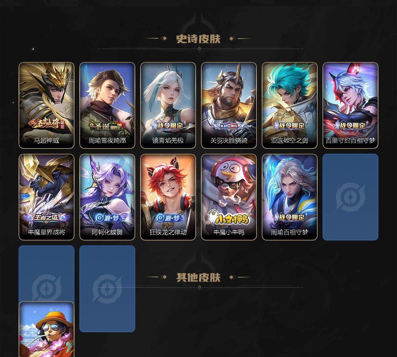 牛魔御旌,盾山御銮,夏侯惇朔风刀,明世隐疑决卦,老夫子醍醐杖,鬼谷子原初探秘者,狄仁杰万华元夜,程咬金演武夺筹,钟馗驱傩正仪,苏烈千军破阵,刘邦夺宝奇兵,马可波罗暗影游猎,蒙犽狂想玩偶喵,元歌云间偶戏,达摩沙漠行僧,兰陵王金庭之子,李元芳云中旅人,桑启海盐诗旅,裴擒虎擒涛扼浪,鲁班大师探海日志,张良古海寻踪,项羽苍威无极,镜青焰无极