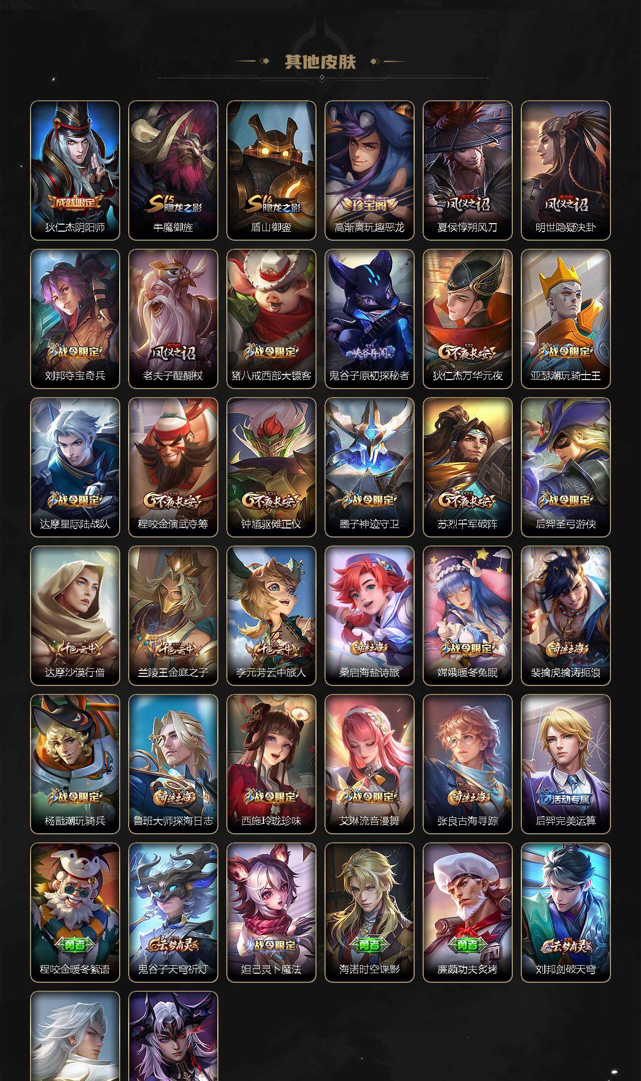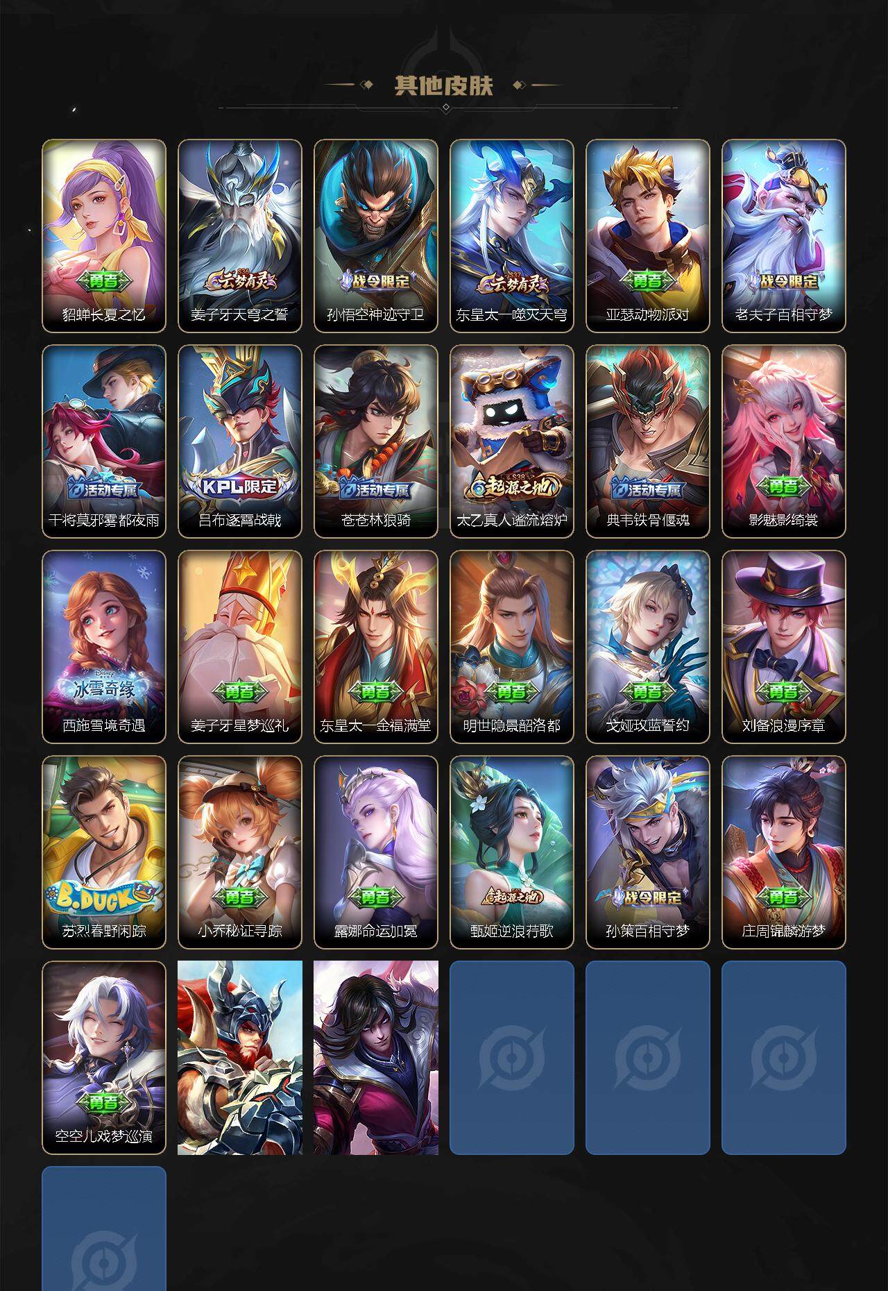 【限定皮肤】:夏侯惇霜北刀,姜子牙天穹之誓,杨戬破阵退雄兵,狄仁杰阴阳师,赵云皇家上将,墨子神迹守卫,孙尚香异界灵契,高渐离玩趣恶龙,阿轲迷踪丽影,钟无艳超时空战士,扁鹊奇幻香踪,芈月白晶晶,吕布御风骁将,吕布遇见神鼓,元歌云间偶戏,夏侯惇朔风刀,典韦岱宗,马可波罗逐梦之星,马可波罗暗影游猎,狄仁杰魔术师,狄仁杰万华元夜,达摩星际陆战队,达摩沙漠行僧,项羽海滩派对,老夫子醍醐杖,老夫子航海奇遇记,程咬金演武夺筹,刘邦夺宝奇兵,韩信逐梦之影,兰陵王影龙天霄,兰陵王金庭之子,娜可露露前尘镜,亚瑟潮玩骑士王,孙悟空至尊宝,牛魔御旌,后羿如梦令,后羿圣弓游侠,李元芳匿光侦查者,李元芳云中旅人,虞姬霸王别姬,虞姬启明星使,钟馗驱傩正仪,杨戬潮玩骑兵,干将莫邪真爱魔法,雅典娜黎明之约,鬼谷子原初探秘者,黄忠火炮绅士,苏烈千军破阵,百里玄策原初追逐者,梦奇顽趣,明世隐疑决卦,裴擒虎李小龙,裴擒虎擒涛扼浪,米莱狄胡桃异想国,云中君纤云弄巧,伽罗天狼溯光者,盾山御銮,猪八戒西部大镖客,上官婉儿妄想奇谈,嫦娥拒霜思,嫦娥暖冬兔眠,曜山海苍雷引,西施玲珑珍味,蒙犽狂想玩偶喵,鲁班大师探海日志,桑启海盐诗旅,暃星界游侠,戈娅驭风魔法,艾琳流音漫舞,赵怀真鹤归松栖,云缨鹤归松栖,司空震地狱燃心,阿古朵江河有灵,张良古海寻踪,蒙犽百解令,蒙恬荣光圣徽,高渐离燃音魔法,妲己灵卜魔法,鬼谷子天穹祈灯,姬小满妄想食味,赵云乘龙铭钟鼎,亚连落雪白狼,沈梦溪龙舞盛年,鲁班七号蔬乡物语,李元芳蔬乡物语,刘邦剑破天穹,程咬金群星魔术团,关羽决胜骁骑,镜青焰无极,项羽苍威无极,刘备异域游侠,周瑜熔金海岸