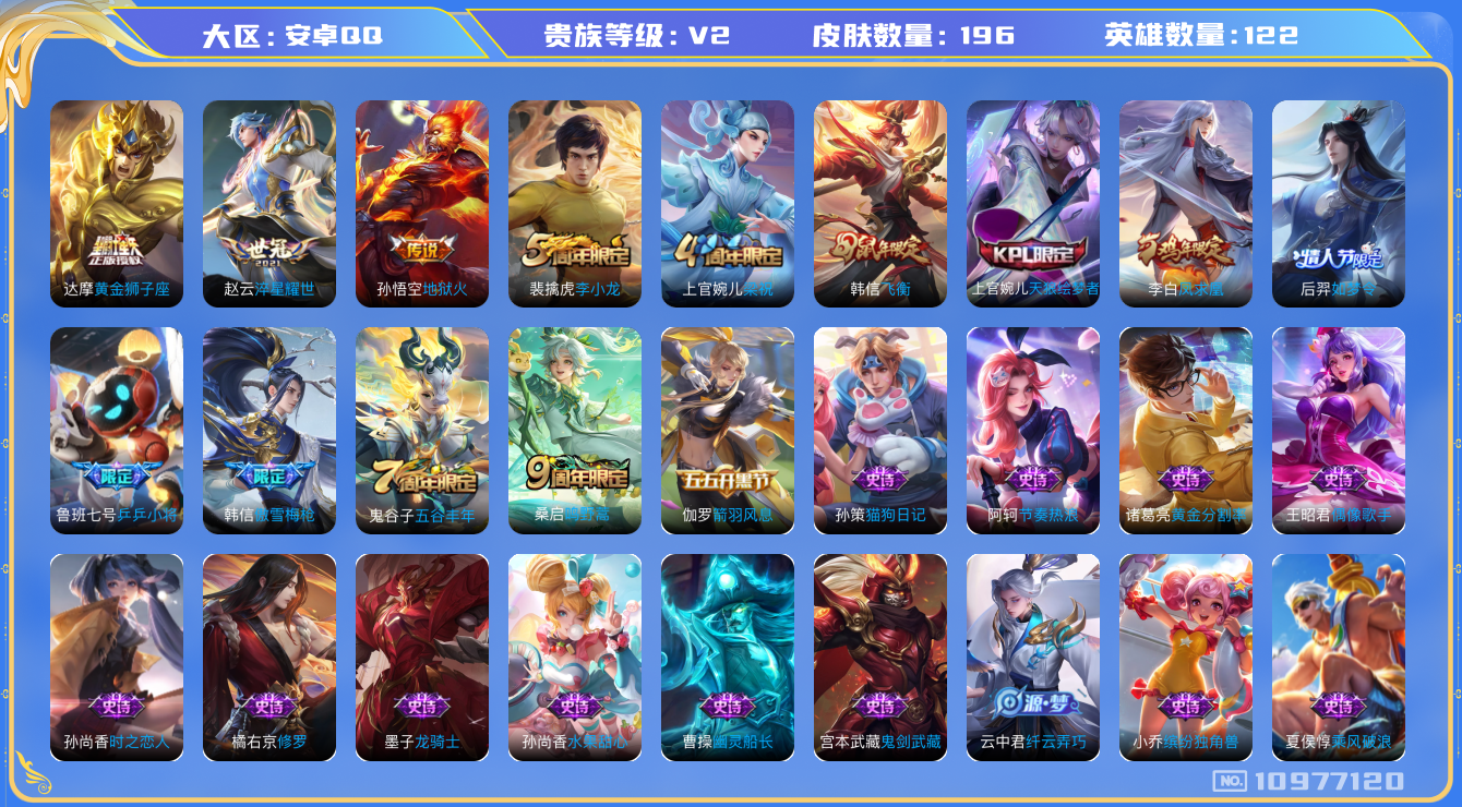 [10977120]【商品标题】:安卓Q-V2-永恒钻石I段位-122英雄-196皮肤-0典藏-0珍品无双-0无双-0珍品传说-5传说-49史诗