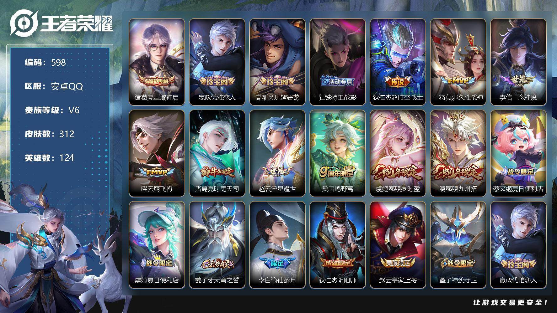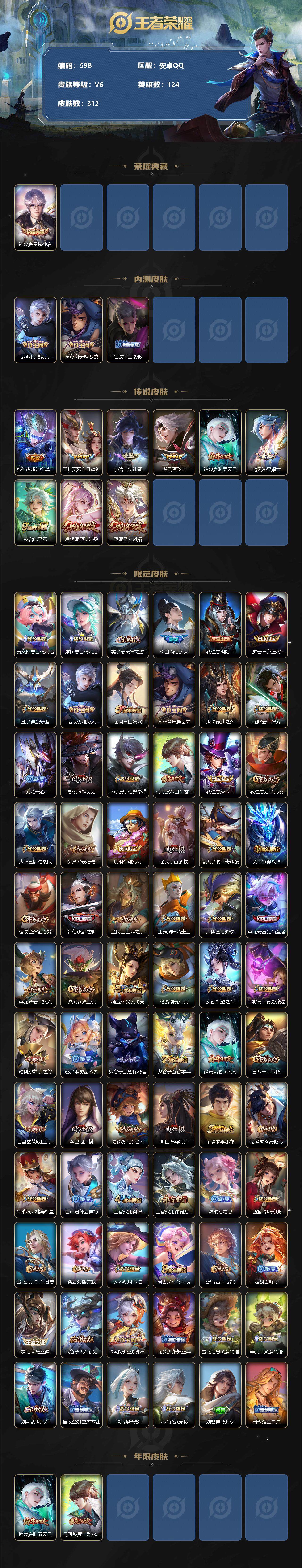[10977259]【商品标题】:安卓Q-V6-最强王者段位-124英雄-312皮肤-1典藏-0珍品无双-0无双-0珍品传说-9传说-93史诗