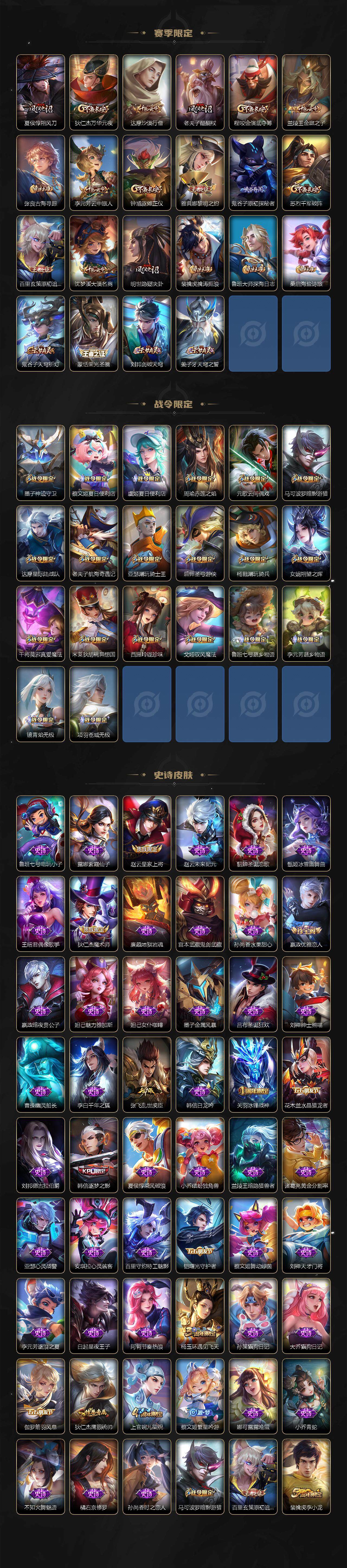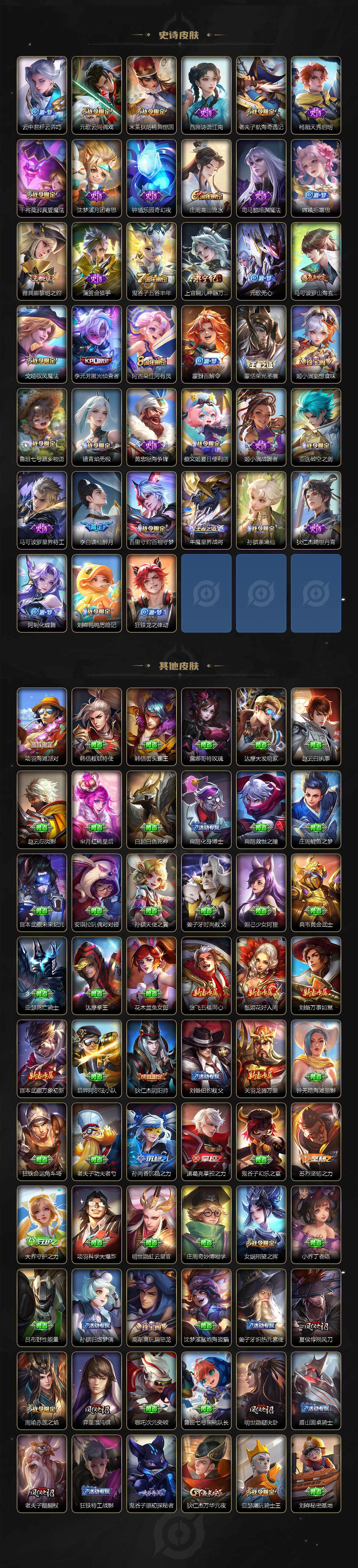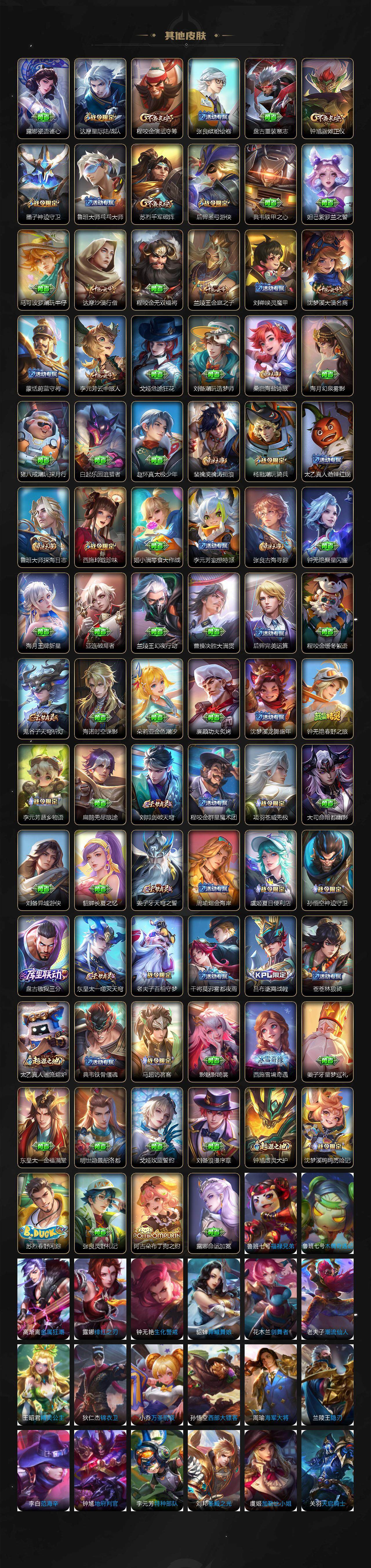 【限定皮肤】:蔡文姬夏日便利店,虞姬夏日便利店,姜子牙天穹之誓,李白谪仙醉月,狄仁杰阴阳师,赵云皇家上将,墨子神迹守卫,嬴政优雅恋人,庄周高山流水,高渐离玩趣恶龙,周瑜赤莲之焰,元歌云间偶戏,元歌无心,夏侯惇朔风刀,马可波罗暗影游猎,马可波罗山海玄木吟,狄仁杰魔术师,狄仁杰万华元夜,达摩星际陆战队,达摩沙漠行僧,项羽海滩派对,老夫子醍醐杖,老夫子航海奇遇记,关羽冰锋战神,程咬金演武夺筹,韩信逐梦之影,兰陵王金庭之子,亚瑟潮玩骑士王,后羿圣弓游侠,李元芳匿光侦查者,李元芳云中旅人,钟馗驱傩正仪,杨玉环遇见飞天,杨戬潮玩骑兵,女娲朔望之晖,干将莫邪真爱魔法,雅典娜黎明之约,蔡文姬繁星吟游,鬼谷子原初探秘者,鬼谷子五谷丰年,诸葛亮时雨天司,苏烈千军破阵,百里玄策原初追逐者,弈星混沌棋,沈梦溪大漠名商,明世隐疑决卦,裴擒虎李小龙,裴擒虎擒涛扼浪,米莱狄胡桃异想国,云中君纤云弄巧,上官婉儿梁祝,上官婉儿神器万象笔,嫦娥拒霜思,西施玲珑珍味,鲁班大师探海日志,桑启海盐诗旅,戈娅驭风魔法,阿古朵江河有灵,张良古海寻踪,蒙犽百解令,蒙恬荣光圣徽,鬼谷子天穹祈灯,姬小满妄想食味,沈梦溪龙舞盛年,鲁班七号蔬乡物语,李元芳蔬乡物语,刘邦剑破天穹,程咬金群星魔术团,镜青焰无极,项羽苍威无极,刘备异域游侠,周瑜熔金海岸