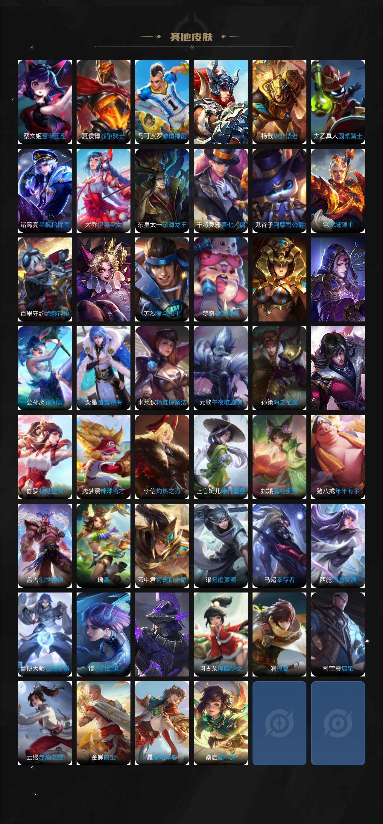 小乔青蛇,娜可露露晚萤,伽罗箭羽风息,李元芳逐浪之夏,不知火舞魅语,大乔猫狗日记,孙策猫狗日记,阿轲节奏热浪,露娜紫霞仙子,诸葛亮黄金分割率,王昭君偶像歌手,韩信白龙吟,孙尚香时之恋人,鲁班七号电玩小子,橘右京修罗,刘禅绅士熊喵,刘禅天才门将,白起星夜王子,安琪拉心灵骇客,刘邦德古拉伯爵,兰陵王暗隐猎兽者,曹操幽灵船长,宫本武藏鬼剑武藏,司马懿暗渊魔法,亚瑟心灵战警,钟馗乐园奇幻夜,杨戬天秀·启明,蔡文姬舞动绿茵,廉颇地狱岩魂,西施诗语江南,小乔缤纷独角兽,夏侯惇乘风破浪,花木兰水晶猎龙者,铠曙光守护者,墨子金属风暴,百里玄策原初追逐者,吕布圣诞狂欢,貂蝉圣诞恋歌,百里守约特工魅影,嬴政暗夜贵公子,嫦娥拒霜思,雅典娜黎明之约,李白千年之狐,澜赏金猎手,李元芳匿光侦查者,蒙犽百解令,李白谪仙醉月,狄仁杰绮世丹青
