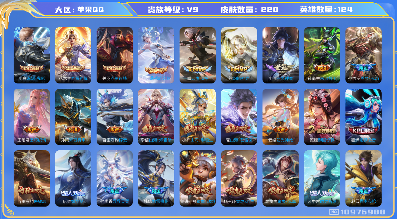 [10976988]【商品标题】:苹果Q-V9-至尊星耀II段位-124英雄-220皮肤-4典藏-0珍品无双-0无双-0珍品传说-23传说-67史诗