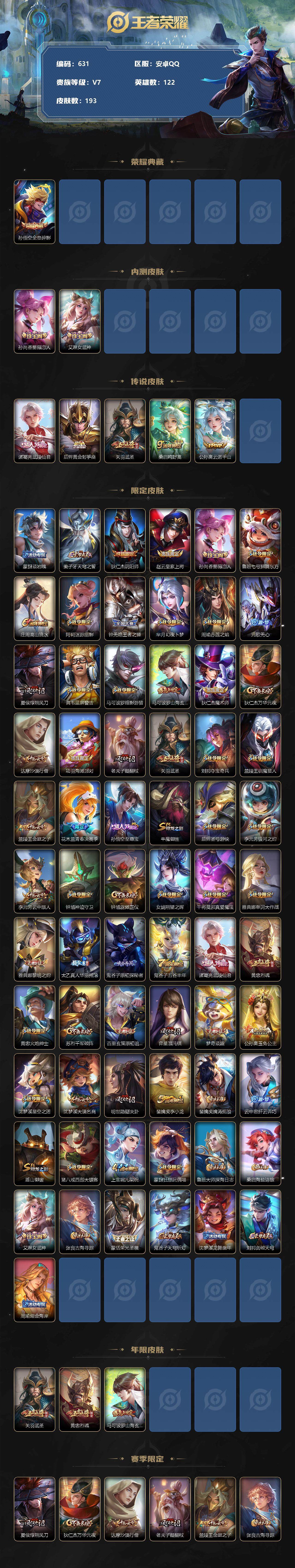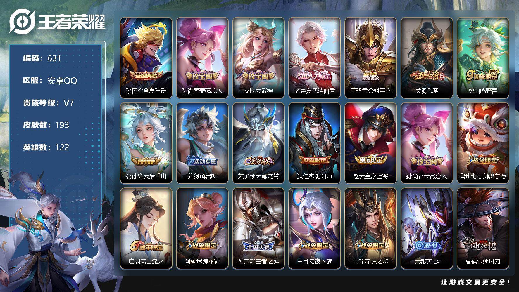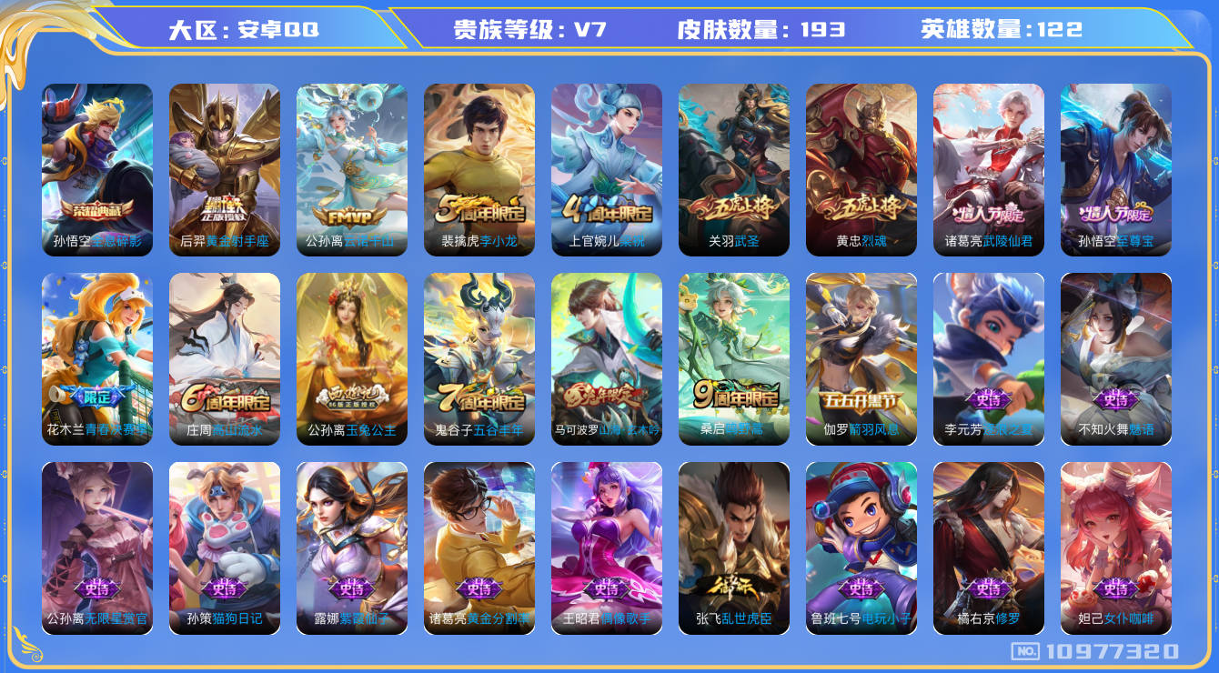 [10977320]【商品标题】:安卓Q-V7-最强王者段位-122英雄-193皮肤-1典藏-0珍品无双-0无双-0珍品传说-5传说-62史诗