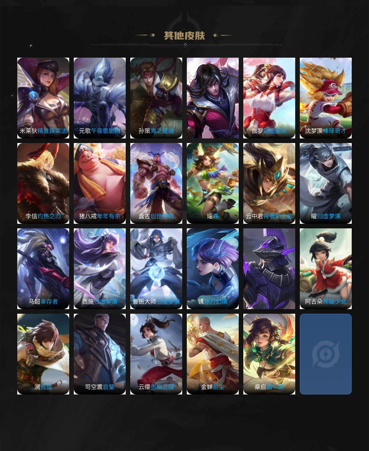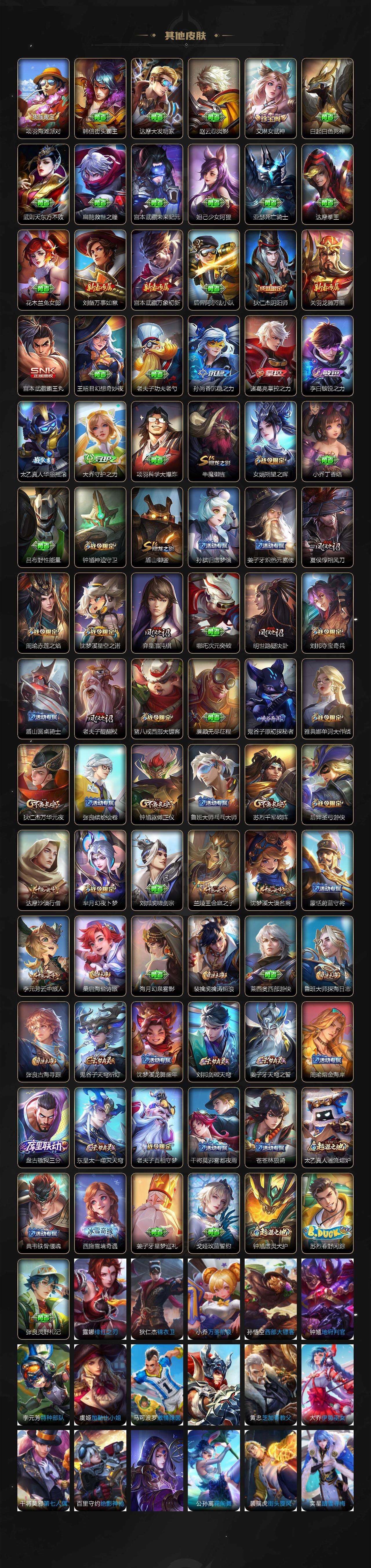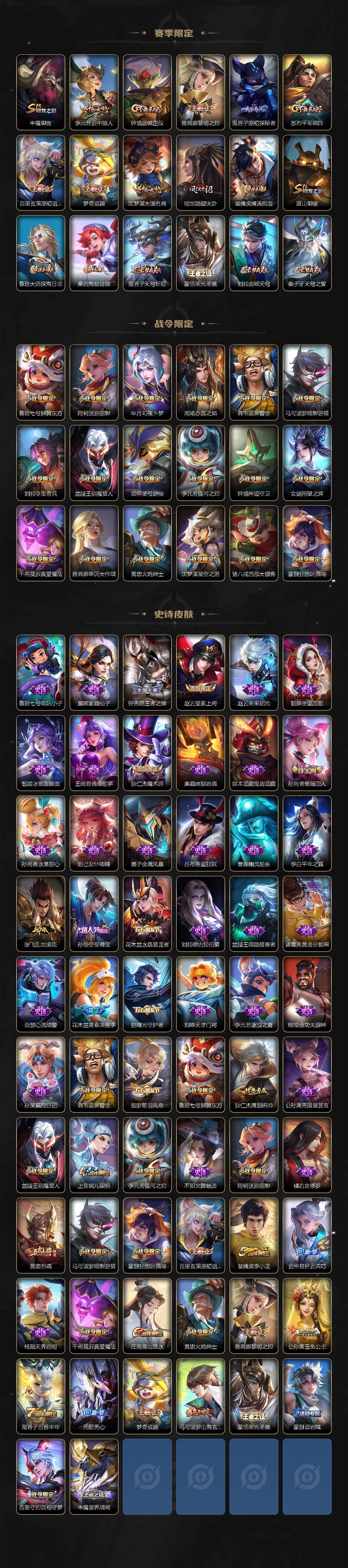 【限定皮肤】:蒙犽顽岩魄,姜子牙天穹之誓,狄仁杰阴阳师,赵云皇家上将,孙尚香蔷薇恋人,鲁班七号狮舞东方,庄周高山流水,阿轲迷踪丽影,钟无艳王者之锤,芈月幻夜卜梦,周瑜赤莲之焰,元歌无心,夏侯惇朔风刀,典韦蓝屏警告,马可波罗暗影游猎,马可波罗山海玄木吟,狄仁杰魔术师,狄仁杰万华元夜,达摩沙漠行僧,项羽海滩派对,老夫子醍醐杖,关羽武圣,刘邦夺宝奇兵,兰陵王驯魔猎人,兰陵王金庭之子,花木兰青春决赛季,孙悟空至尊宝,牛魔御旌,后羿圣弓游侠,李元芳银河之约,李元芳云中旅人,钟馗神迹守卫,钟馗驱傩正仪,女娲朔望之晖,干将莫邪真爱魔法,雅典娜单词大作战,雅典娜黎明之约,太乙真人华丽摇滚,鬼谷子原初探秘者,鬼谷子五谷丰年,诸葛亮武陵仙君,黄忠烈魂,黄忠火炮绅士,苏烈千军破阵,百里玄策原初追逐者,弈星混沌棋,梦奇顽趣,公孙离玉兔公主,沈梦溪星空之诺,沈梦溪大漠名商,明世隐疑决卦,裴擒虎李小龙,裴擒虎擒涛扼浪,云中君纤云弄巧,盾山御銮,猪八戒西部大镖客,上官婉儿梁祝,蒙犽狂想玩偶喵,鲁班大师探海日志,桑启海盐诗旅,艾琳女武神,张良古海寻踪,蒙恬荣光圣徽,鬼谷子天穹祈灯,沈梦溪龙舞盛年,刘邦剑破天穹,周瑜熔金海岸
