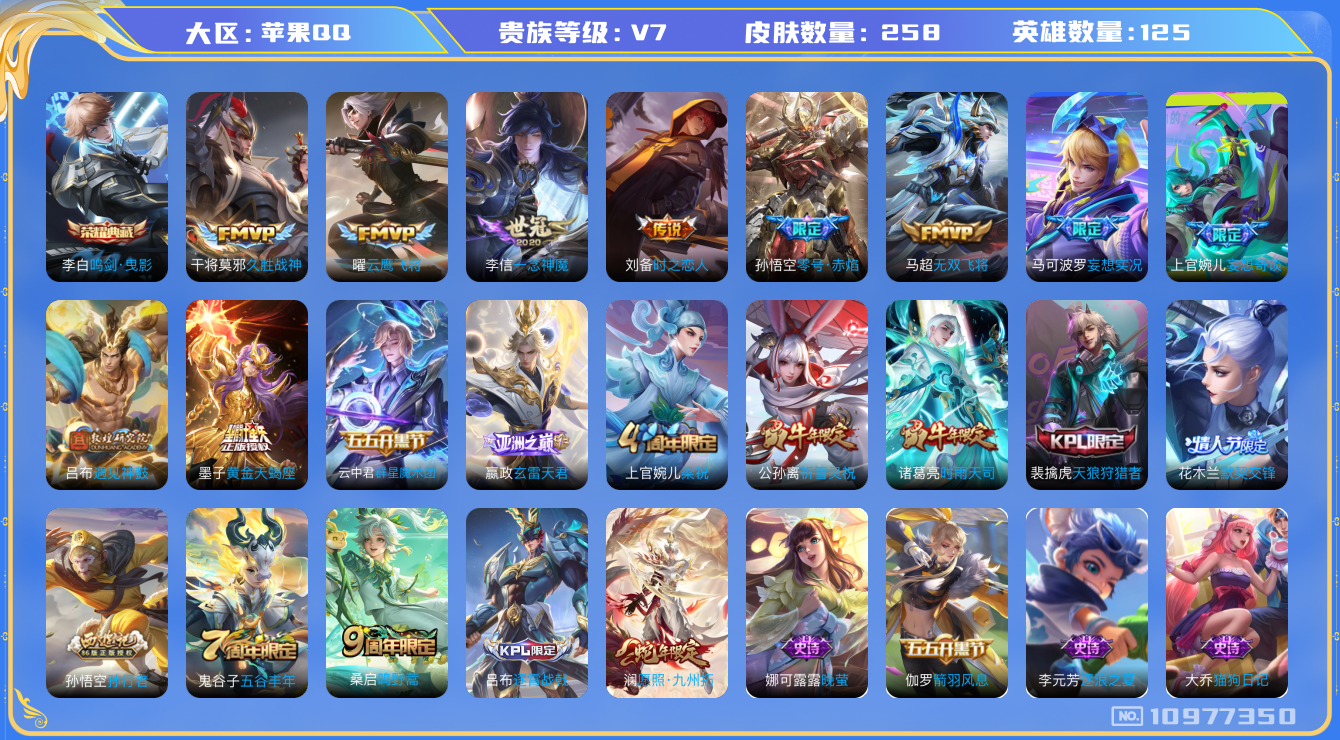 [10977350]【商品标题】:苹果Q-V7-最强王者段位-125英雄-258皮肤-1典藏-0珍品无双-0无双-0珍品传说-17传说-86史诗