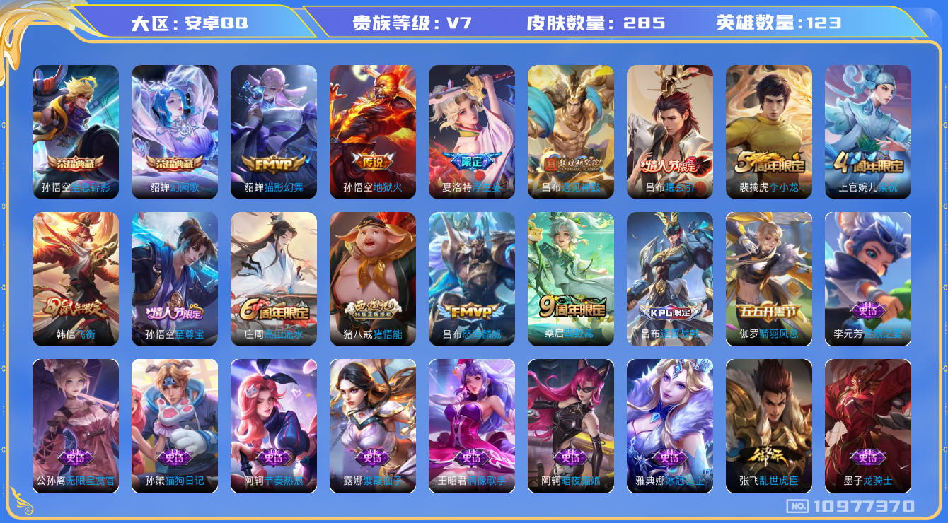[10977370]【商品标题】:安卓Q-V6-至尊星耀I段位-123英雄-285皮肤-2典藏-0珍品无双-0无双-0珍品传说-7传说-72史诗