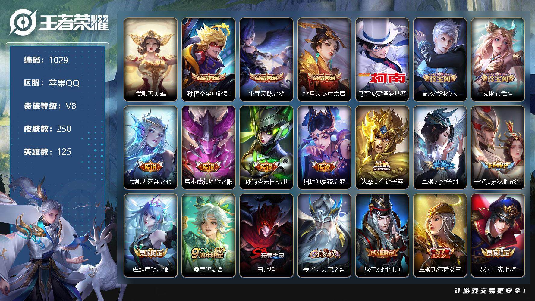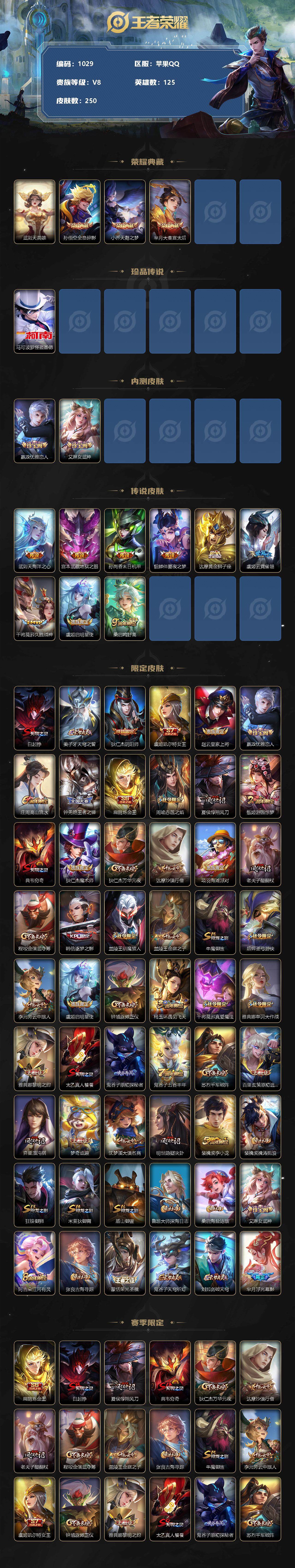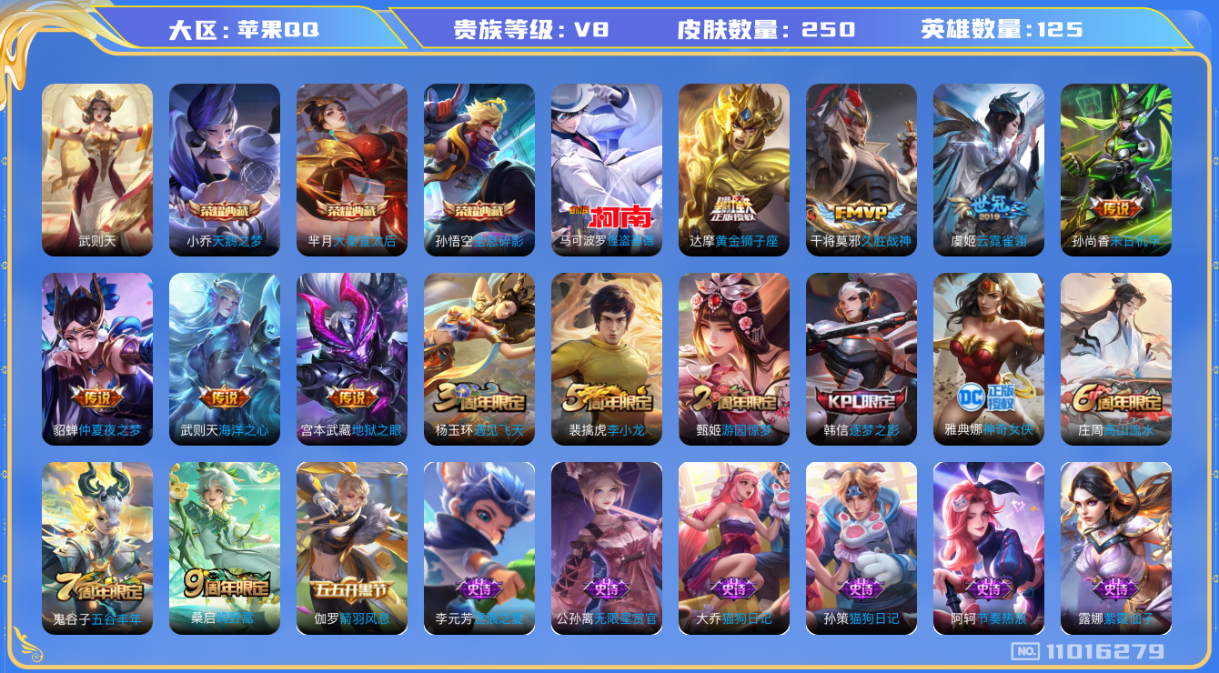 [11016279]【商品标题】:苹果Q-V7-至尊星耀III段位-125英雄-250皮肤-3典藏-0珍品无双-0无双-1珍品传说-9传说-57史诗