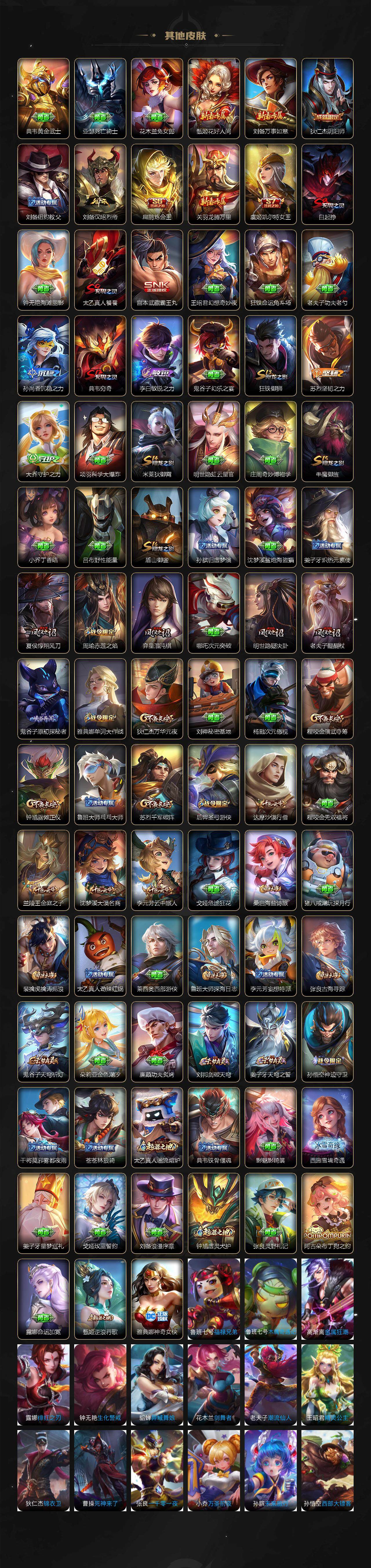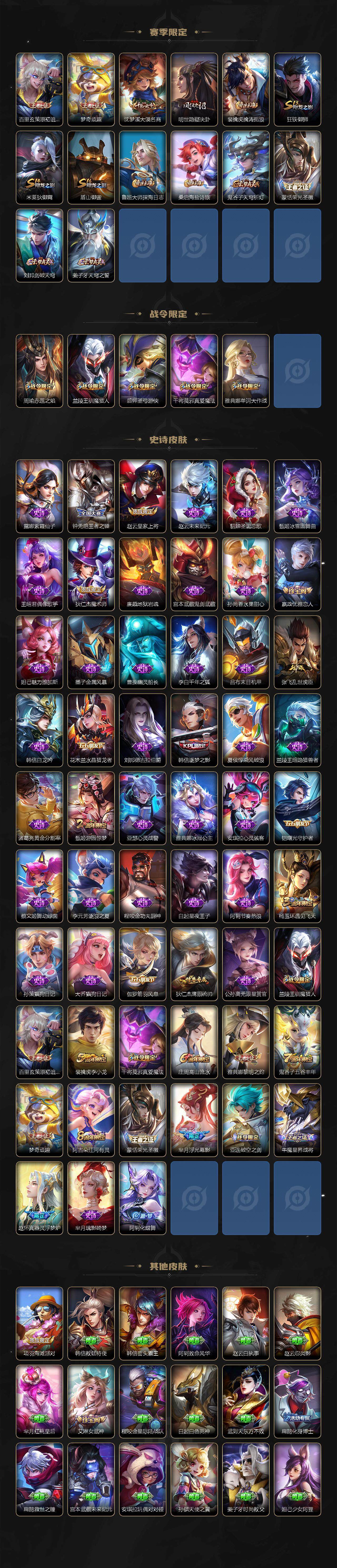 【赛季限定】:扁鹊炼金王,白起狰,夏侯惇朔风刀,典韦穷奇,狄仁杰万华元夜,达摩沙漠行僧,老夫子醍醐杖,程咬金演武夺筹,兰陵王金庭之子,张良古海寻踪,牛魔御旌,李元芳云中旅人,虞姬凯尔特女王,钟馗驱傩正仪,雅典娜黎明之约,太乙真人饕餮,鬼谷子原初探秘者,苏烈千军破阵,百里玄策原初追逐者,弈星混沌棋,梦奇顽趣,沈梦溪大漠名商,明世隐疑决卦,裴擒虎擒涛扼浪,狂铁御狮,米莱狄御霄,盾山御銮,鲁班大师探海日志,桑启海盐诗旅,鬼谷子天穹祈灯,蒙恬荣光圣徽,刘邦剑破天穹,姜子牙天穹之誓