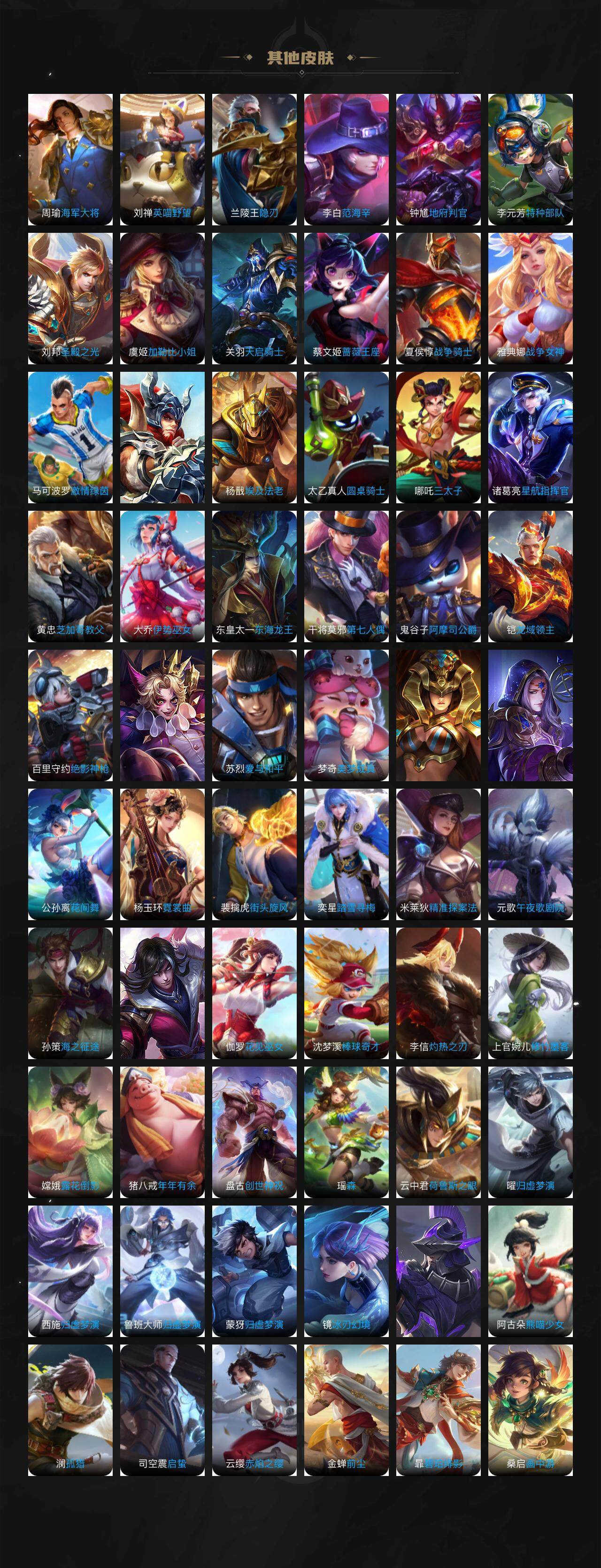 扁鹊炼金王,虞姬凯尔特女王,白起狰,太乙真人饕餮,典韦穷奇,狂铁御狮,米莱狄御霄,牛魔御旌,盾山御銮,夏侯惇朔风刀,明世隐疑决卦,老夫子醍醐杖,鬼谷子原初探秘者,狄仁杰万华元夜,程咬金演武夺筹,钟馗驱傩正仪,苏烈千军破阵,弈星混沌棋,达摩沙漠行僧,兰陵王金庭之子,沈梦溪大漠名商,李元芳云中旅人,桑启海盐诗旅,裴擒虎擒涛扼浪,鲁班大师探海日志,张良古海寻踪