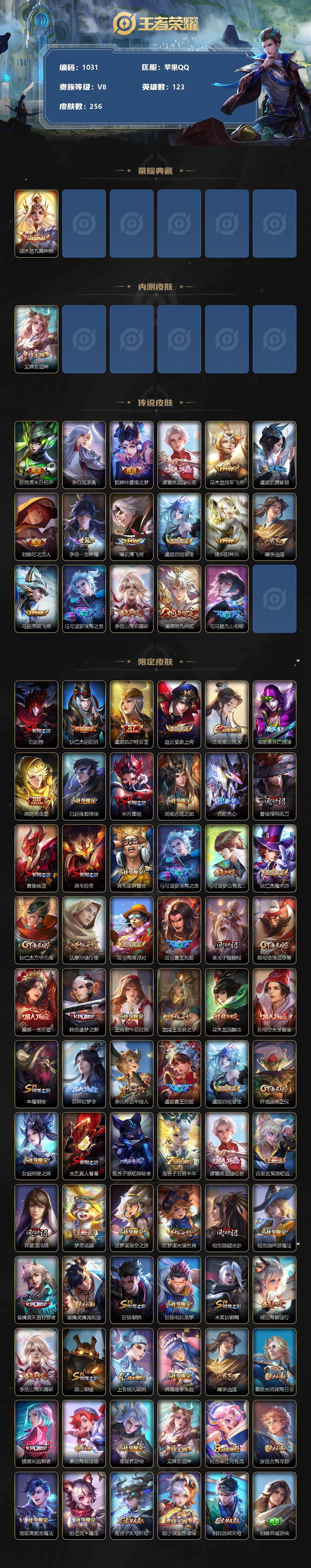 [11016389]【商品标题】:苹果Q-V8-至尊星耀V段位-123英雄-256皮肤-1典藏-0珍品无双-0无双-0珍品传说-17传说-68史诗 【荣耀典藏】:花木兰九霄神辉 【内测皮肤】:艾琳女武神 【传说皮肤】:孙尚香末日机甲,李白凤求凰,貂蝉仲夏夜之梦,诸葛亮武陵仙君,花木兰冠军飞将,虞姬云霓雀翎,刘备时之恋人,李信一念神魔,曜云鹰飞将,虞姬启明星使,镜炽阳神光,曜李逍遥 ,马超无双飞将,马可波罗深海之息,李信山海炽霜斩,澜愿照九州拓,司马懿九山相柳 【限定皮肤】:白起狰,狄仁杰阴阳师,虞姬凯尔特女王,赵云皇家上将,庄周高山流水,高渐离死亡摇滚,扁鹊炼金王,白起夜都怪侠,芈月重明,周瑜赤莲之焰,元歌无心,夏侯惇朔风刀,曹操烛龙,典韦穷奇,典韦蓝屏警告,马可波罗深海之息,马可波罗山海玄木吟,狄仁杰魔术师,狄仁杰万华元夜,达摩沙漠行僧,项羽海滩派对,项羽霸王别姬,老夫子醍醐杖,程咬金演武夺筹,露娜一生所爱,韩信逐梦之影,王昭君午后时光,兰陵王金庭之子,花木兰瑞麟志,孙悟空大圣娶亲,牛魔御旌,后羿如梦令,李元芳云中旅人,虞姬霸王别姬,虞姬启明星使,钟馗驱傩正仪,女娲朔望之晖,太乙真人饕餮,鬼谷子原初探秘者,鬼谷子五谷丰年,诸葛亮武陵仙君,百里玄策原初追逐者,弈星混沌棋,梦奇顽趣,沈梦溪星空之诺,沈梦溪大漠名商,明世隐疑决卦,明世隐吟游魔法,裴擒虎天狼狩猎者,裴擒虎擒涛扼浪,狂铁御狮,狂铁电玩高手,米莱狄御霄,瑶山海碧波行,李信山海炽霜斩,盾山御銮,上官婉儿梁祝,嫦娥暖冬兔眠,曜李逍遥 ,鲁班大师探海日志,镜匿光追影者,桑启海盐诗旅,暃星界游侠,艾琳女武神,阿古朵江河有灵,张良古海寻踪,高渐离燃音魔法,妲己灵卜魔法,鬼谷子天穹祈灯,姬小满妄想食味,刘邦剑破天穹,刘备异域游侠 【年限皮肤】:花木兰瑞麟志,李白凤求凰,瑶山海碧波行,马可波罗山海玄木吟,李信山海炽霜斩 【赛季限定】:扁鹊炼金王,白起狰,芈月重明,夏侯惇朔风刀,曹操烛龙,典韦穷奇,狄仁杰万华元夜,达摩沙漠行僧,老夫子醍醐杖,程咬金演武夺筹,兰陵王金庭之子,张良古海寻踪,牛魔御旌,李元芳云中旅人,虞姬凯尔特女王,钟馗驱傩正仪,太乙真人饕餮,鬼谷子原初探秘者,百里玄策原初追逐者,弈星混沌棋,梦奇顽趣,沈梦溪大漠名商,明世隐疑决卦,裴擒虎擒涛扼浪,狂铁御狮,米莱狄御霄,盾山御銮,鲁班大师探海日志,桑启海盐诗旅,鬼谷子天穹祈灯,刘邦