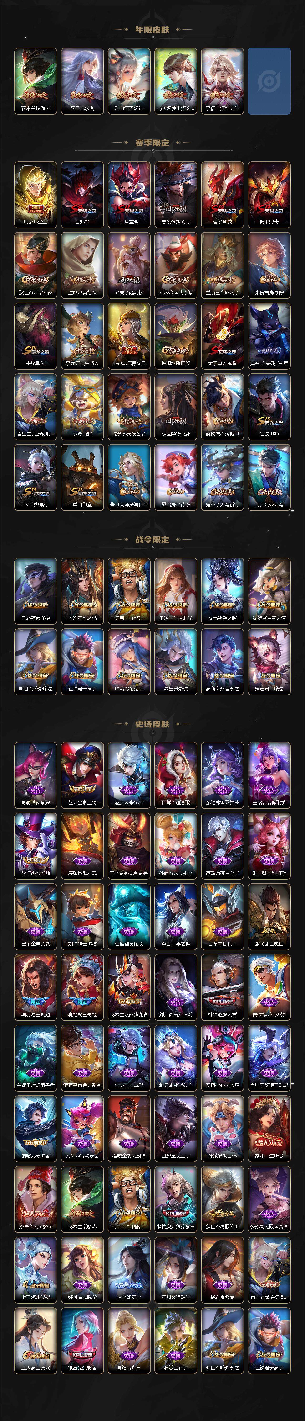 【赛季限定】:扁鹊炼金王,白起狰,芈月重明,夏侯惇朔风刀,曹操烛龙,典韦穷奇,狄仁杰万华元夜,达摩沙漠行僧,老夫子醍醐杖,程咬金演武夺筹,兰陵王金庭之子,张良古海寻踪,牛魔御旌,李元芳云中旅人,虞姬凯尔特女王,钟馗驱傩正仪,太乙真人饕餮,鬼谷子原初探秘者,百里玄策原初追逐者,弈星混沌棋,梦奇顽趣,沈梦溪大漠名商,明世隐疑决卦,裴擒虎擒涛扼浪,狂铁御狮,米莱狄御霄,盾山御銮,鲁班大师探海日志,桑启海盐诗旅,鬼谷子天穹祈灯,刘邦