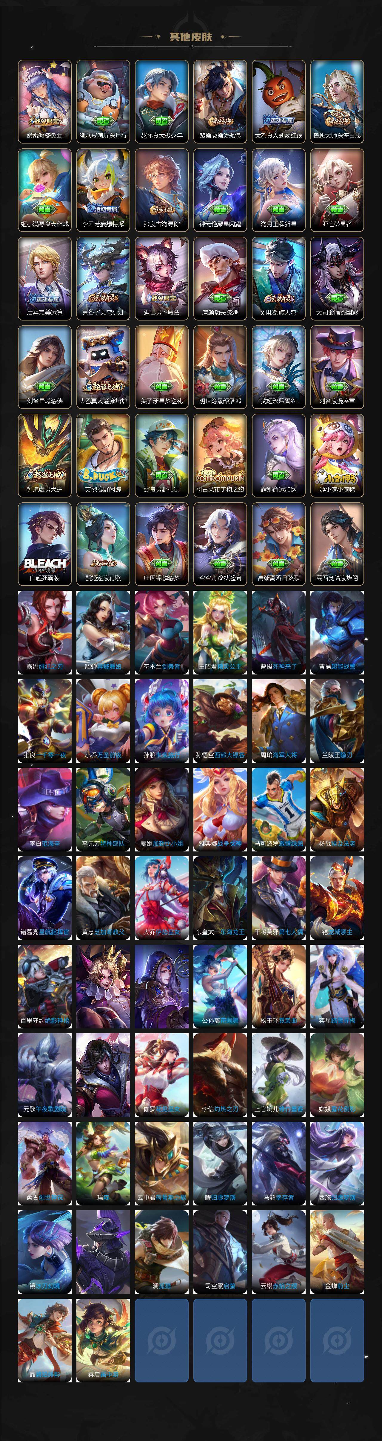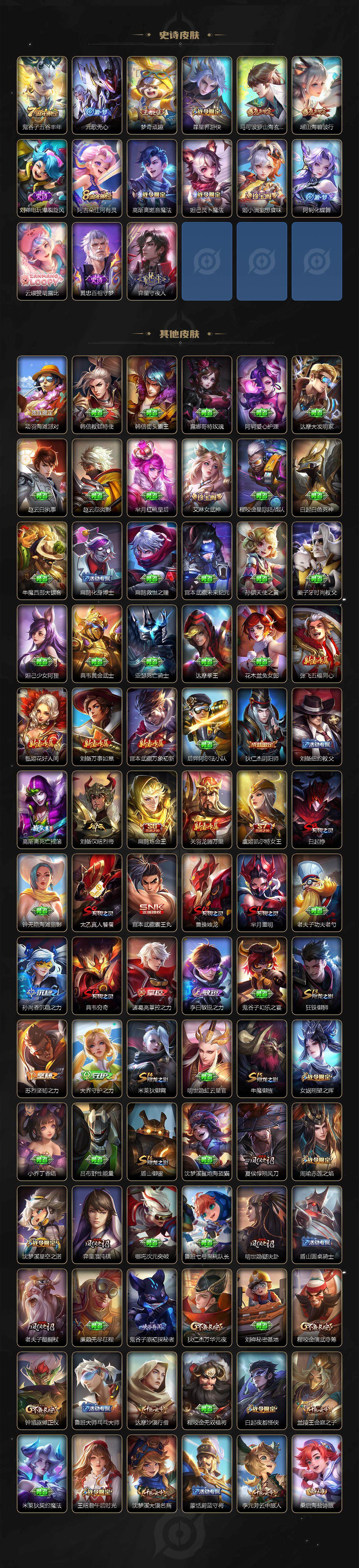 【限定皮肤】:白起狰,狄仁杰阴阳师,虞姬凯尔特女王,赵云皇家上将,庄周高山流水,高渐离死亡摇滚,扁鹊炼金王,白起夜都怪侠,芈月重明,周瑜赤莲之焰,元歌无心,夏侯惇朔风刀,曹操烛龙,典韦穷奇,典韦蓝屏警告,马可波罗深海之息,马可波罗山海玄木吟,狄仁杰魔术师,狄仁杰万华元夜,达摩沙漠行僧,项羽海滩派对,项羽霸王别姬,老夫子醍醐杖,程咬金演武夺筹,露娜一生所爱,韩信逐梦之影,王昭君午后时光,兰陵王金庭之子,花木兰瑞麟志,孙悟空大圣娶亲,牛魔御旌,后羿如梦令,李元芳云中旅人,虞姬霸王别姬,虞姬启明星使,钟馗驱傩正仪,女娲朔望之晖,太乙真人饕餮,鬼谷子原初探秘者,鬼谷子五谷丰年,诸葛亮武陵仙君,百里玄策原初追逐者,弈星混沌棋,梦奇顽趣,沈梦溪星空之诺,沈梦溪大漠名商,明世隐疑决卦,明世隐吟游魔法,裴擒虎天狼狩猎者,裴擒虎擒涛扼浪,狂铁御狮,狂铁电玩高手,米莱狄御霄,瑶山海碧波行,李信山海炽霜斩,盾山御銮,上官婉儿梁祝,嫦娥暖冬兔眠,曜李逍遥 ,鲁班大师探海日志,镜匿光追影者,桑启海盐诗旅,暃星界游侠,艾琳女武神,阿古朵江河有灵,张良古海寻踪,高渐离燃音魔法,妲己灵卜魔法,鬼谷子天穹祈灯,姬小满妄想食味,刘邦剑破天穹,刘备异域游侠