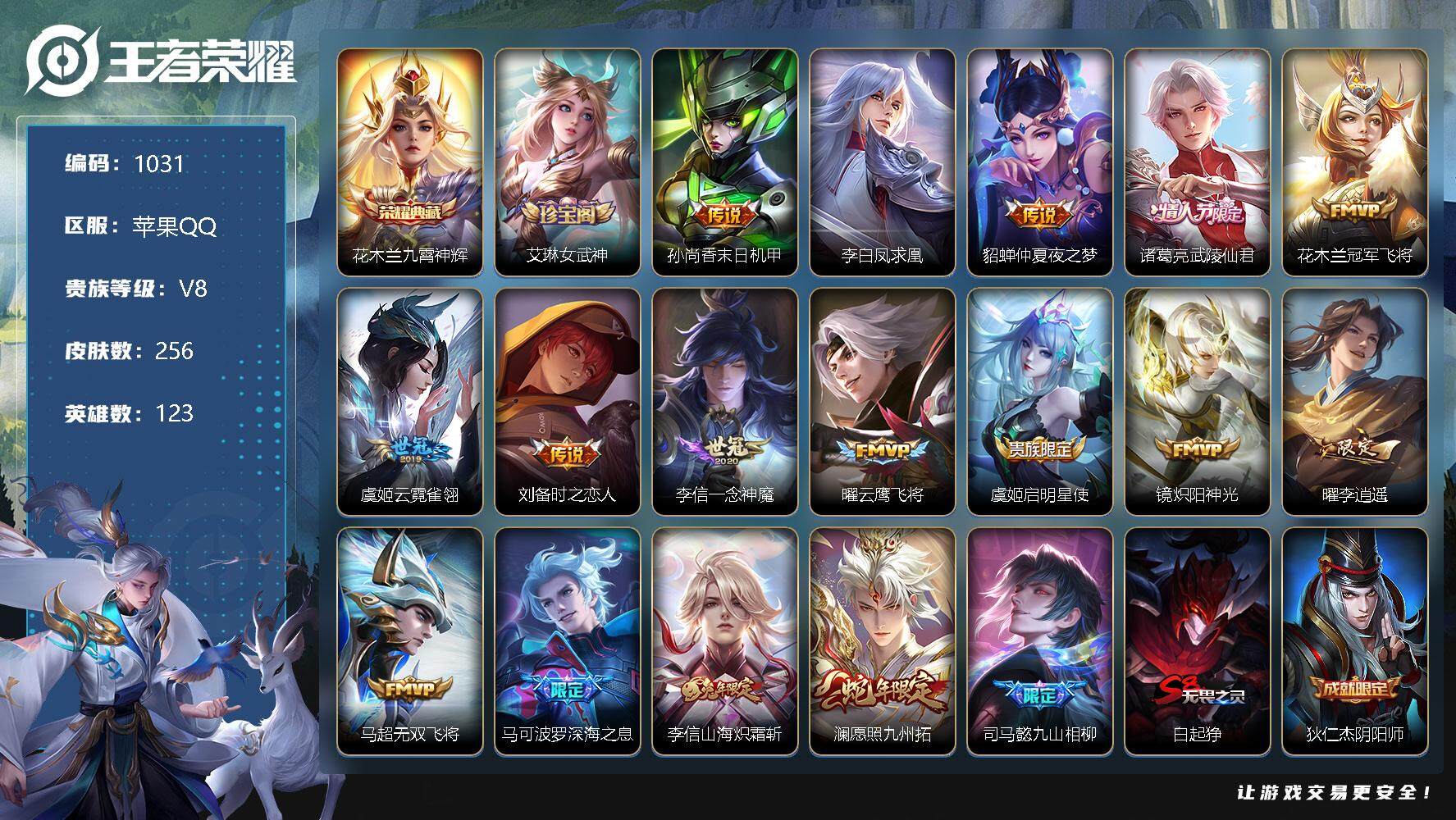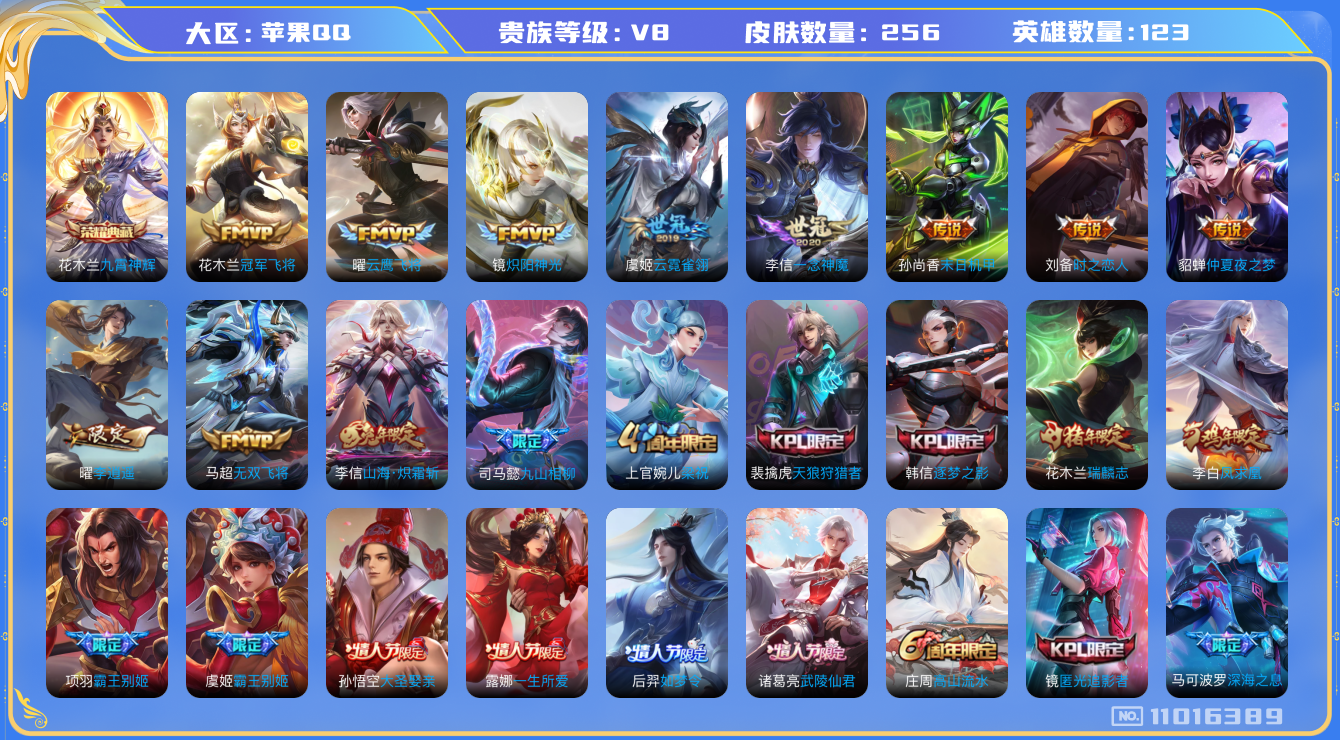 [11016389]【商品标题】:苹果Q-V8-至尊星耀V段位-123英雄-256皮肤-1典藏-0珍品无双-0无双-0珍品传说-17传说-68史诗