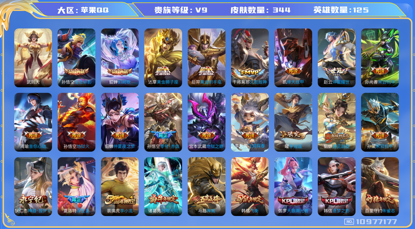 [10977177]【商品标题】:苹果Q-V9-至尊星耀IV段位-125英雄-344皮肤-2典藏-0珍品无双-0无双-0珍品传说-25传说-102史诗
