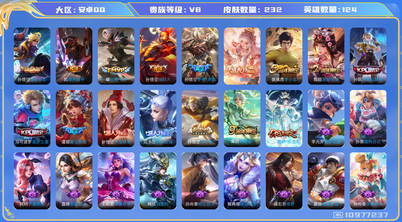 [10977237]【商品标题】:安卓Q-V8-永恒钻石III段位-124英雄-232皮肤-1典藏-0珍品无双-0无双-0珍品传说-8传说-54史诗