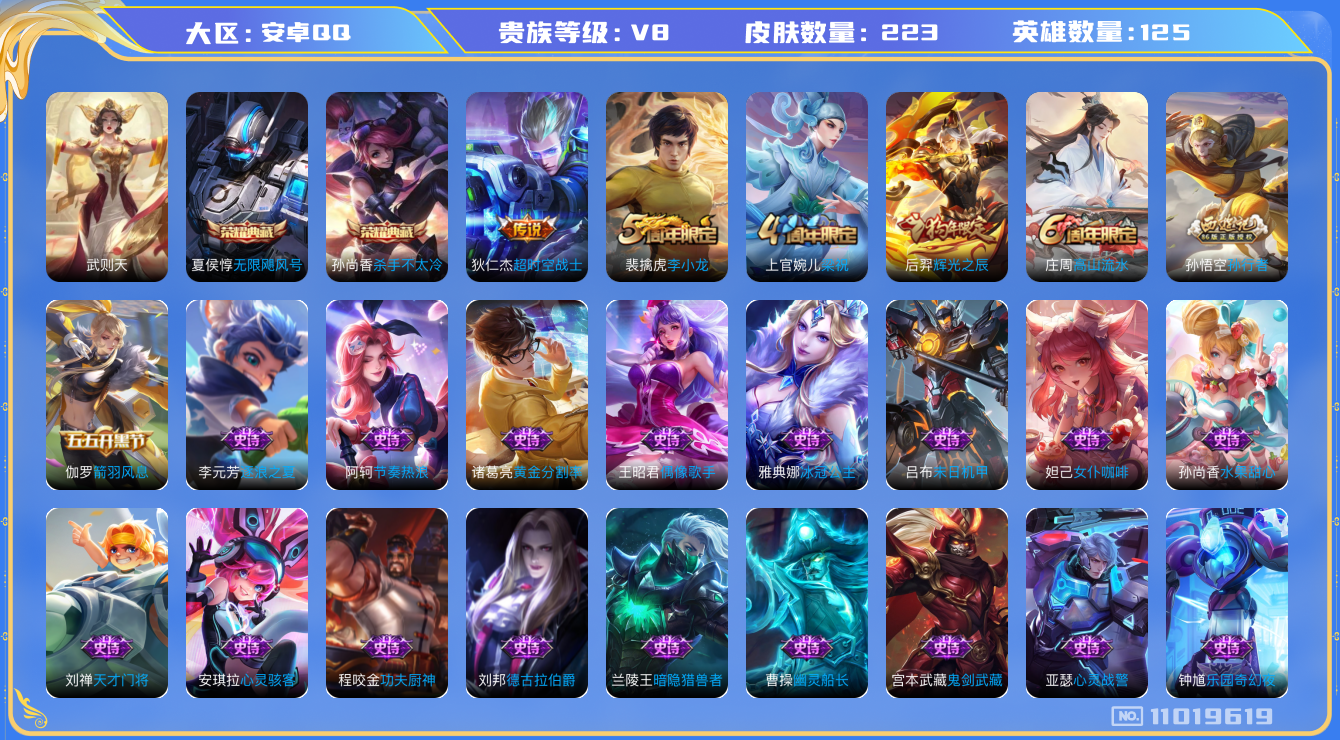 [11019619]【商品标题】:安卓Q-V8-最强王者段位-125英雄-223皮肤-2典藏-0珍品无双-0无双-0珍品传说-2传说-51史诗