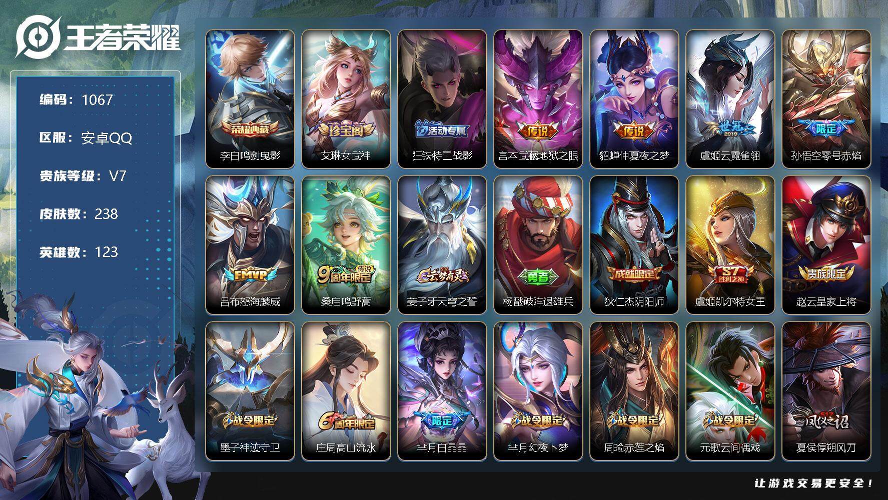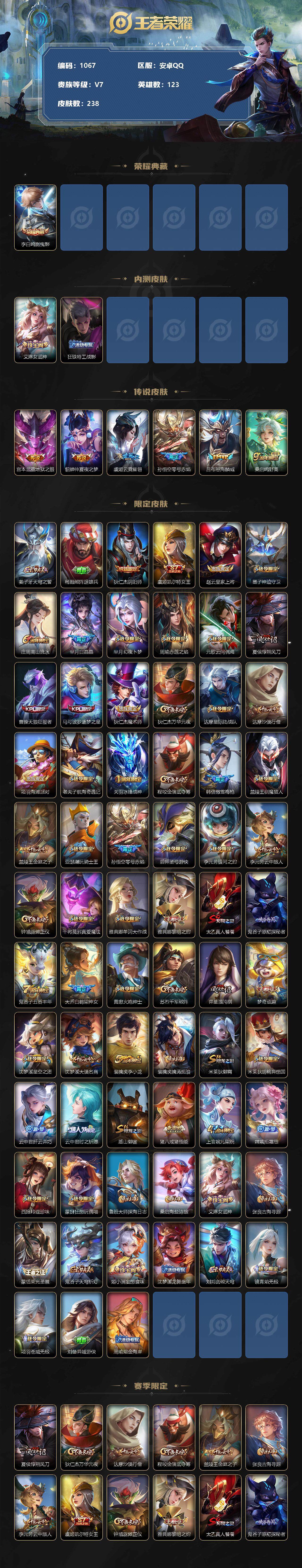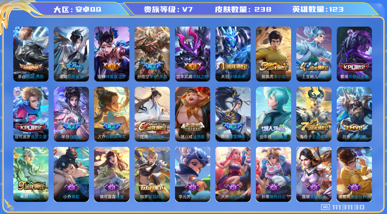 [11131130]【商品标题】:安卓Q-V2-尊贵铂金III段位-123英雄-238皮肤-1典藏-0珍品无双-0无双-0珍品传说-6传说-68史诗