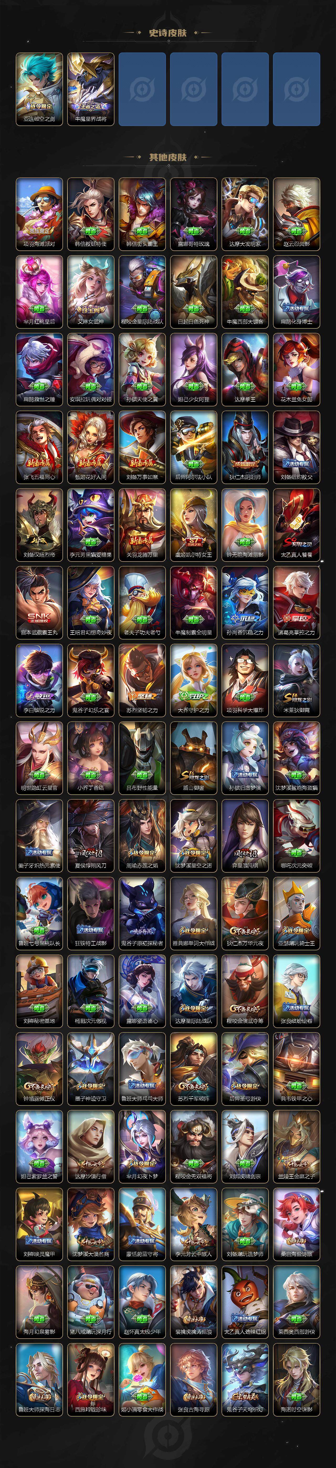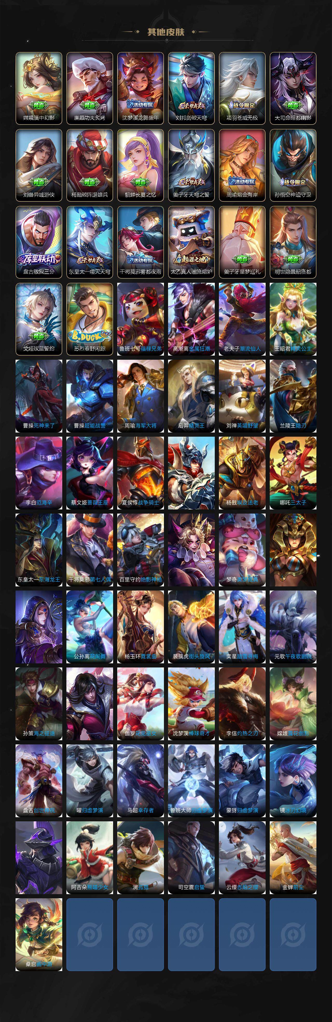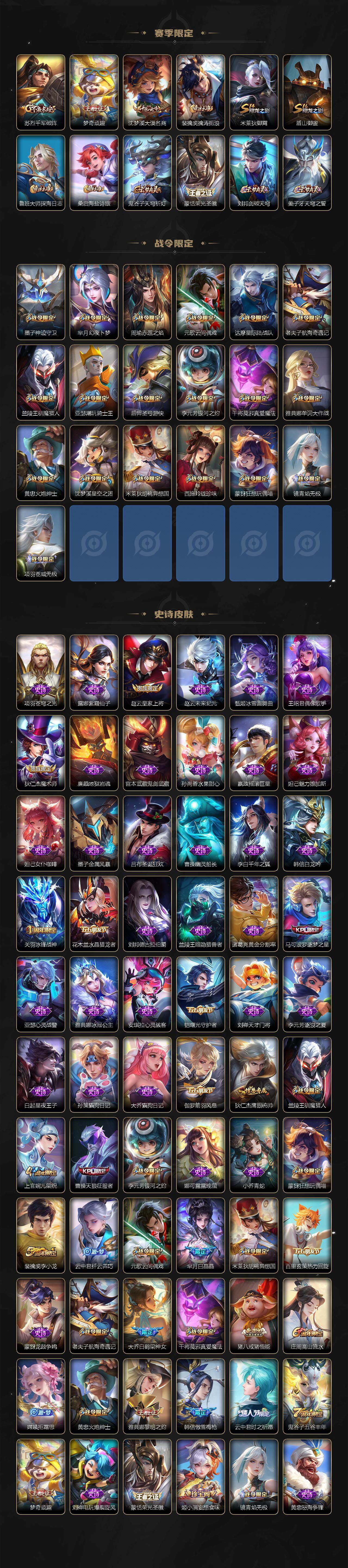 【限定皮肤】:姜子牙天穹之誓,杨戬破阵退雄兵,狄仁杰阴阳师,虞姬凯尔特女王,赵云皇家上将,墨子神迹守卫,庄周高山流水,芈月白晶晶,芈月幻夜卜梦,周瑜赤莲之焰,元歌云间偶戏,夏侯惇朔风刀,曹操天狼征服者,马可波罗逐梦之星,狄仁杰魔术师,狄仁杰万华元夜,达摩星际陆战队,达摩沙漠行僧,项羽海滩派对,老夫子航海奇遇记,关羽冰锋战神,程咬金演武夺筹,韩信傲雪梅枪,兰陵王驯魔猎人,兰陵王金庭之子,亚瑟潮玩骑士王,孙悟空零号赤焰,后羿圣弓游侠,李元芳银河之约,李元芳云中旅人,钟馗驱傩正仪,干将莫邪真爱魔法,雅典娜单词大作战,雅典娜黎明之约,太乙真人饕餮,鬼谷子原初探秘者,鬼谷子五谷丰年,大乔白鹤梁神女,黄忠火炮绅士,苏烈千军破阵,弈星混沌棋,梦奇顽趣,沈梦溪星空之诺,沈梦溪大漠名商,裴擒虎李小龙,裴擒虎擒涛扼浪,米莱狄御霄,米莱狄胡桃异想国,云中君纤云弄巧,云中君时之祈愿,盾山御銮,猪八戒猪悟能,上官婉儿梁祝,嫦娥拒霜思,西施玲珑珍味,蒙犽狂想玩偶喵,鲁班大师探海日志,桑启海盐诗旅,艾琳女武神,张良古海寻踪,蒙恬荣光圣徽,鬼谷子天穹祈灯,姬小满妄想食味,沈梦溪龙舞盛年,刘邦剑破天穹,镜青焰无极,项羽苍威无极,刘备异域游侠,周瑜熔金海岸