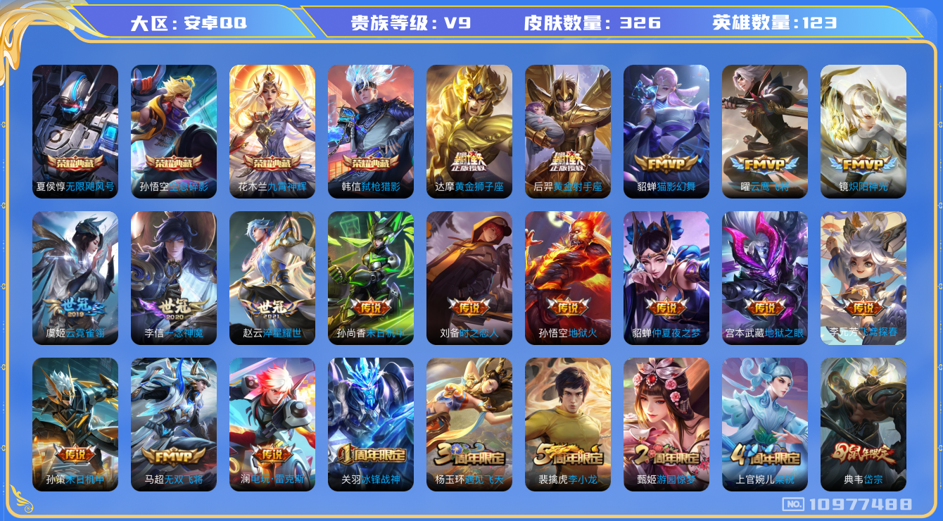 [10977488]【商品标题】:安卓Q-V7-永恒钻石V段位-123英雄-326皮肤-4典藏-0珍品无双-0无双-0珍品传说-23传说-98史诗