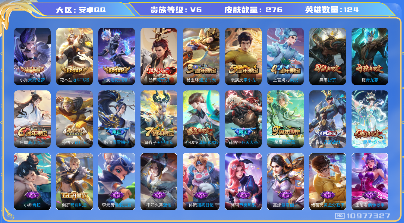 [10977327]【商品标题】:安卓Q-V6-至尊星耀II段位-124英雄-276皮肤-1典藏-0珍品无双-0无双-0珍品传说-6传说-79史诗