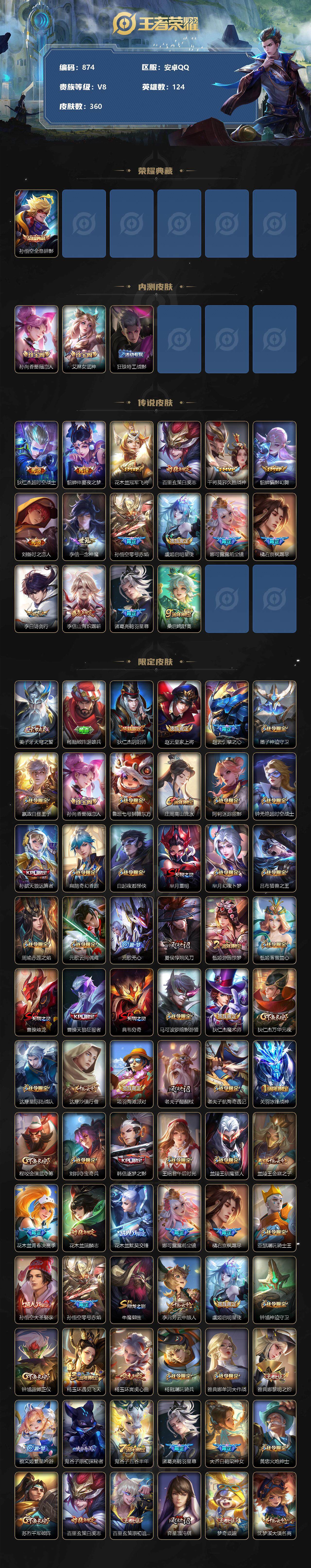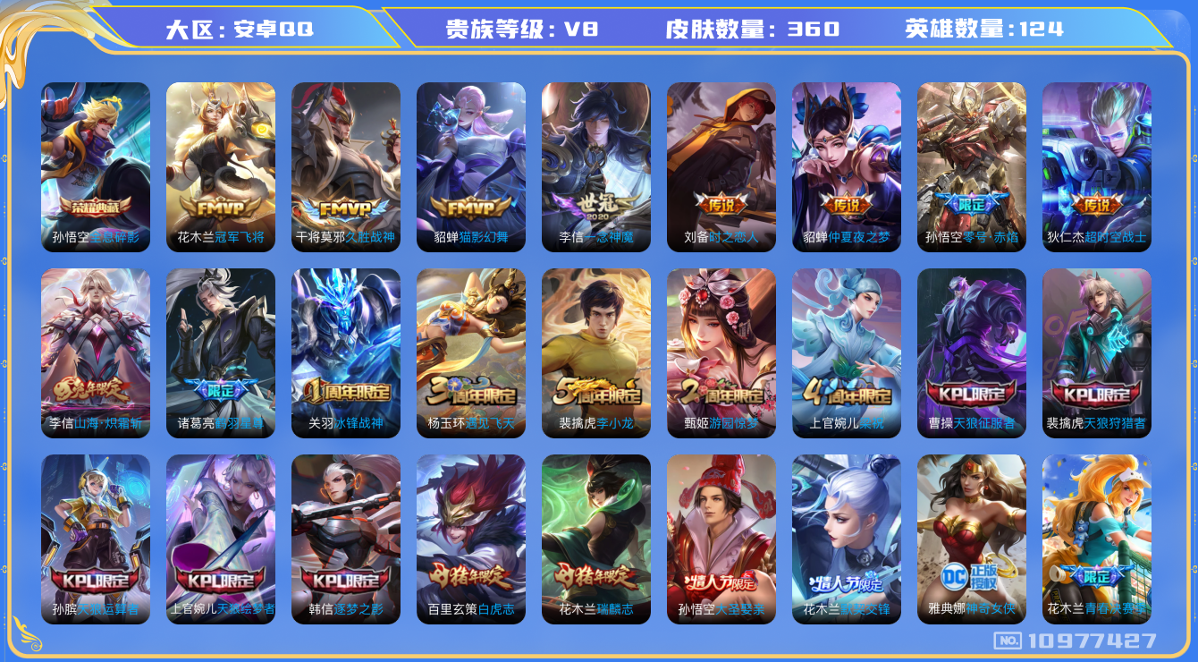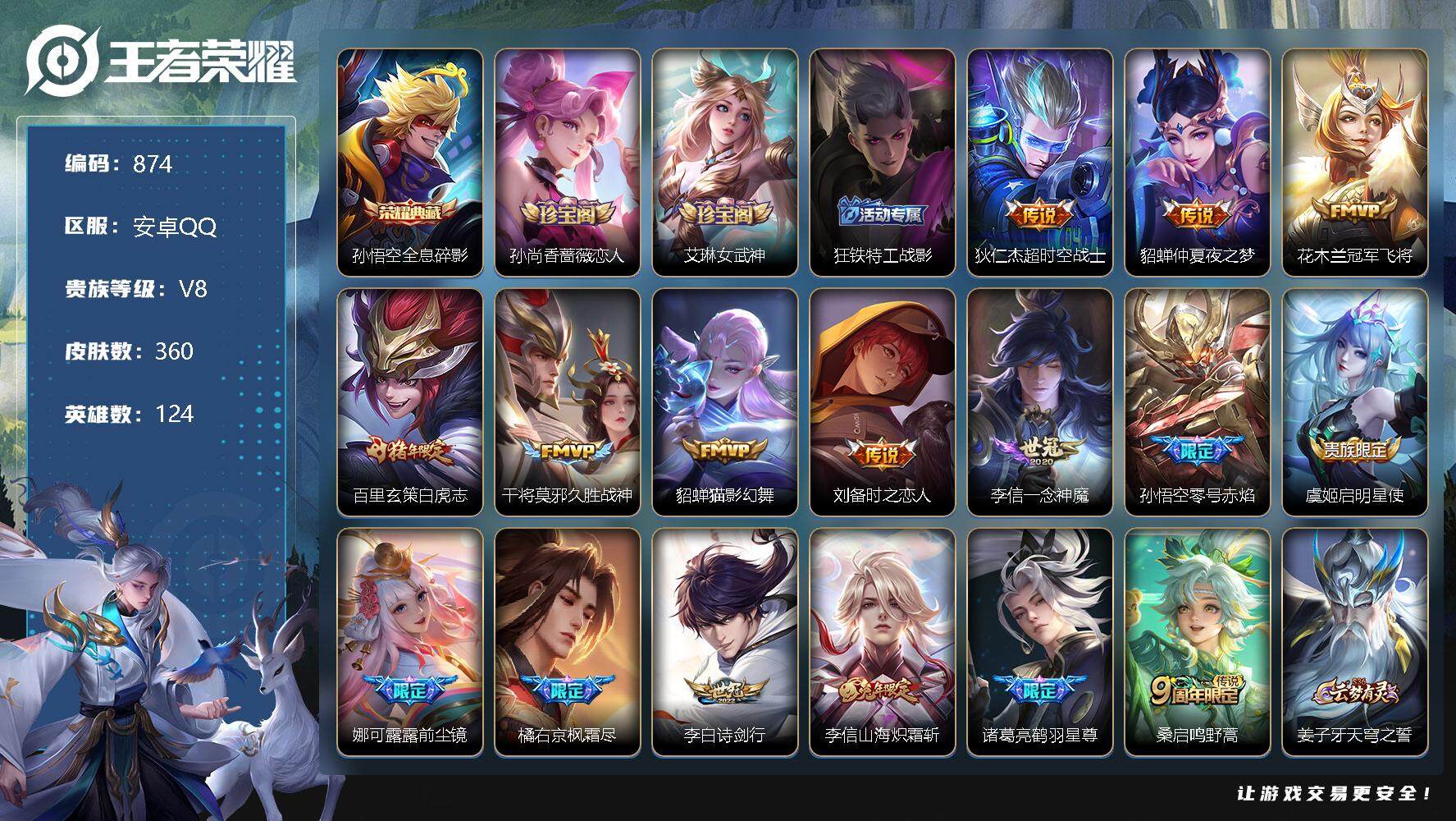 [10977427]【商品标题】:安卓Q-V8-永恒钻石II段位-124英雄-360皮肤-1典藏-0珍品无双-0无双-0珍品传说-16传说-105史诗