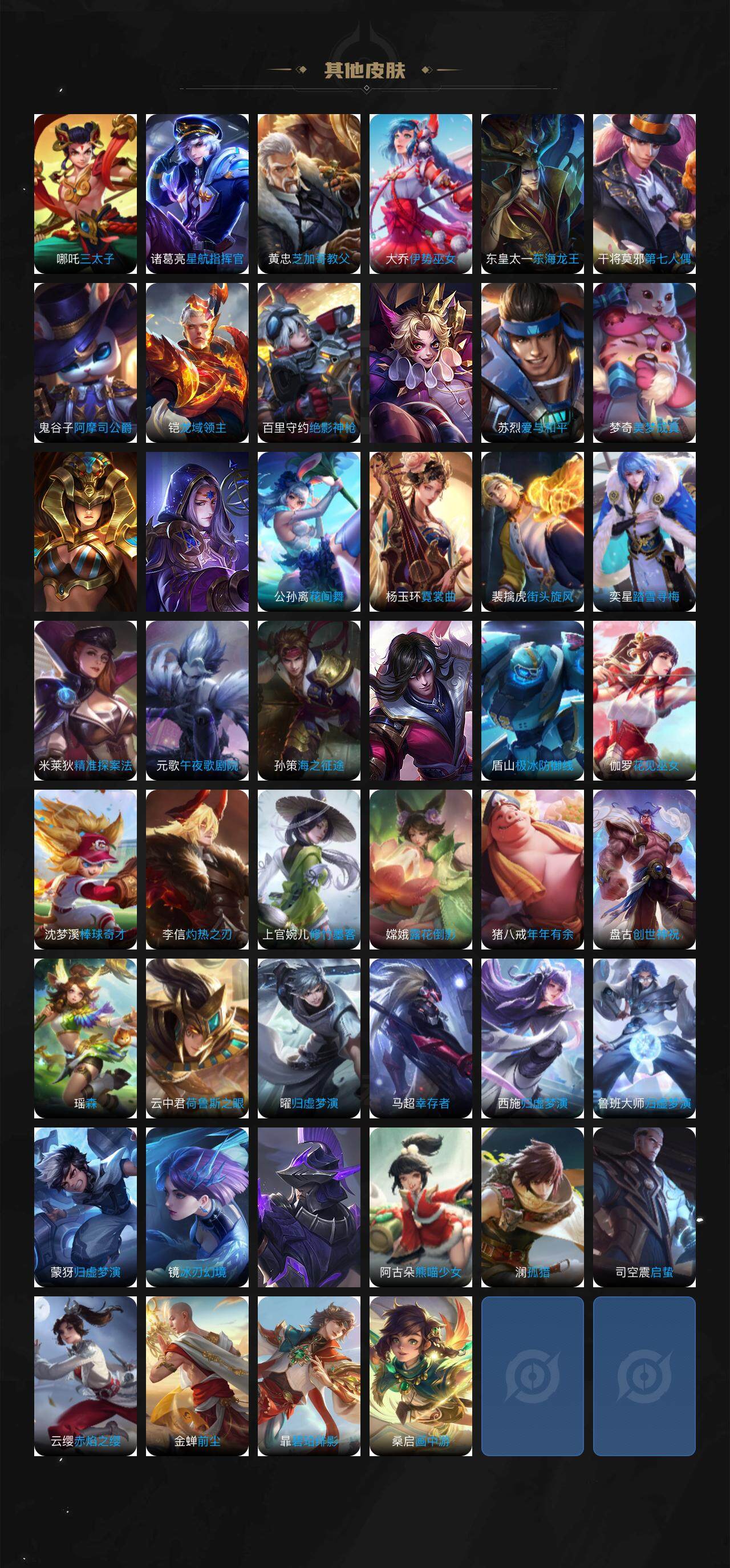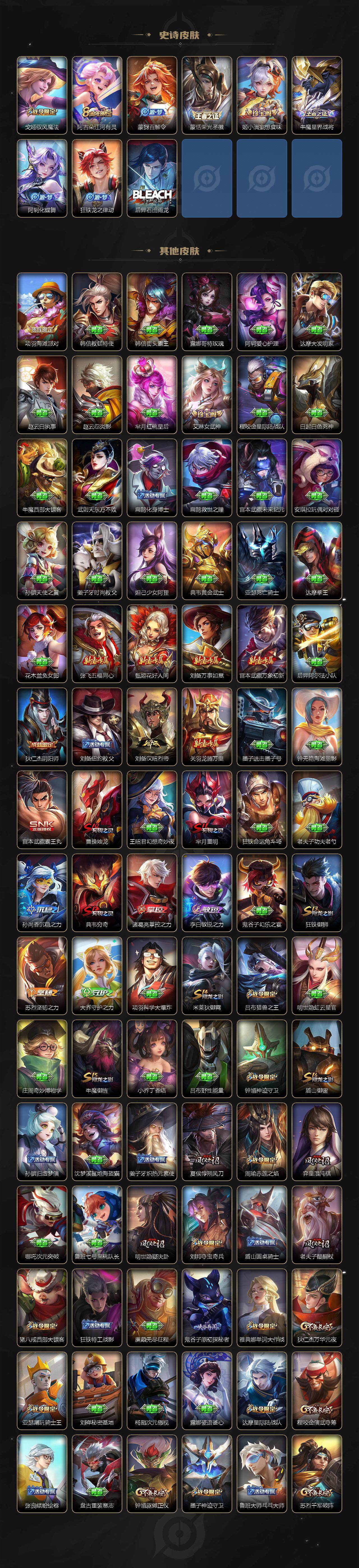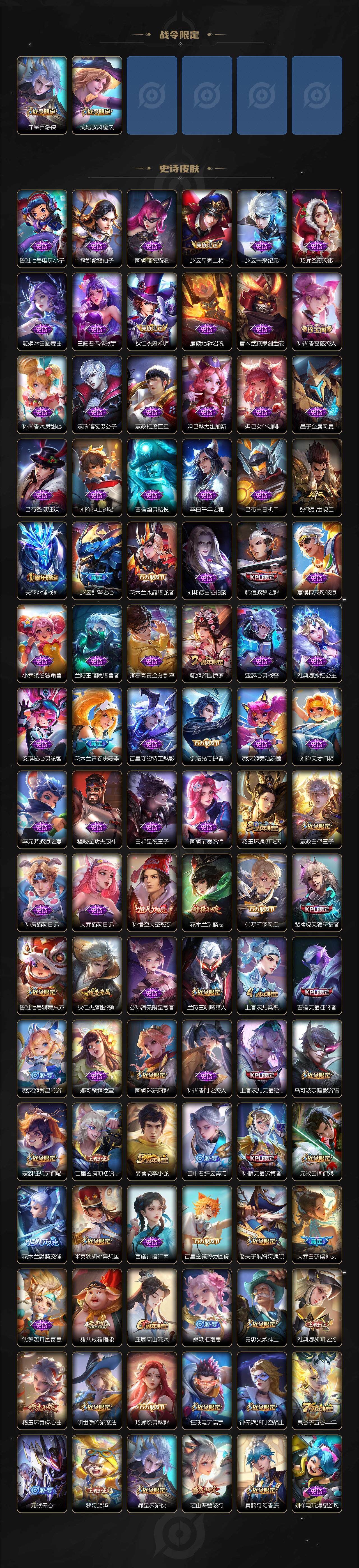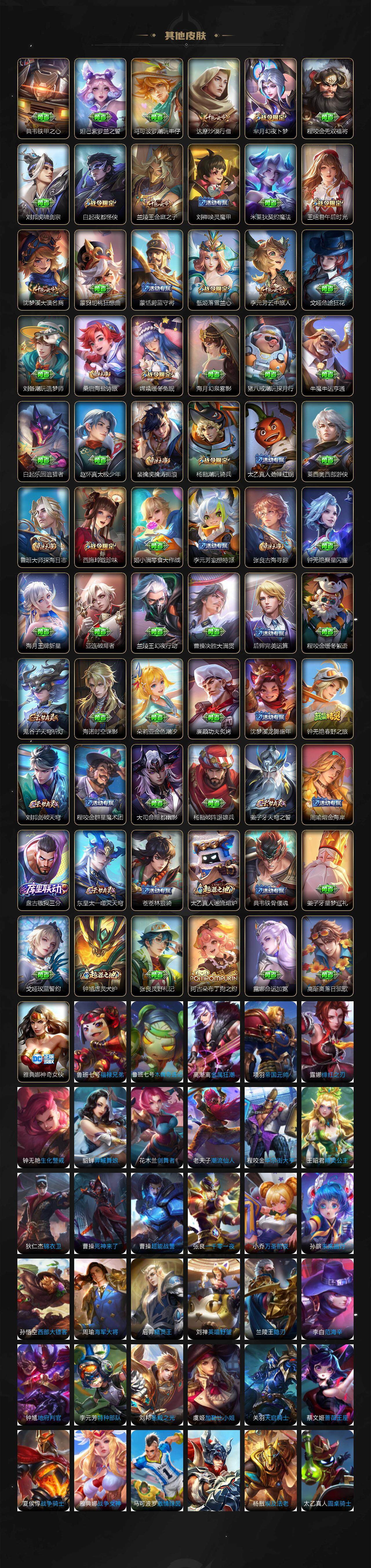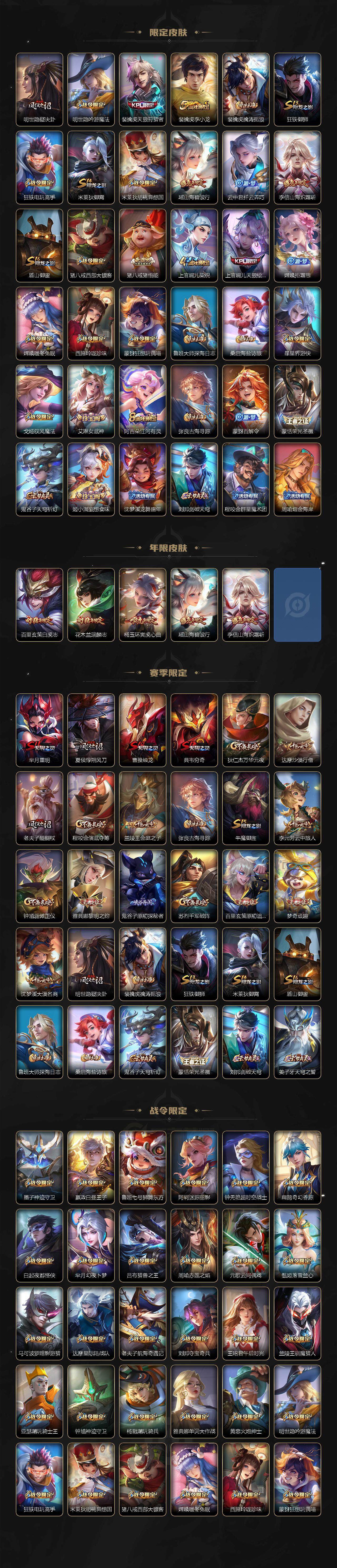 【限定皮肤】:姜子牙天穹之誓,杨戬破阵退雄兵,狄仁杰阴阳师,赵云皇家上将,赵云引擎之心,墨子神迹守卫,嬴政白昼王子,孙尚香蔷薇恋人,鲁班七号狮舞东方,庄周高山流水,阿轲迷踪丽影,钟无艳超时空战士,孙膑天狼运算者,扁鹊奇幻香踪,白起夜都怪侠,芈月重明,芈月幻夜卜梦,吕布猎兽之王,周瑜赤莲之焰,元歌云间偶戏,元歌无心,夏侯惇朔风刀,甄姬游园惊梦,甄姬落雪兰心,曹操烛龙,曹操天狼征服者,典韦穷奇,马可波罗暗影游猎,狄仁杰魔术师,狄仁杰万华元夜,达摩星际陆战队,达摩沙漠行僧,项羽海滩派对,老夫子醍醐杖,老夫子航海奇遇记,关羽冰锋战神,程咬金演武夺筹,刘邦夺宝奇兵,韩信逐梦之影,王昭君午后时光,兰陵王驯魔猎人,兰陵王金庭之子,花木兰青春决赛季,花木兰瑞麟志,花木兰默契交锋,娜可露露前尘镜,橘右京枫霜尽,亚瑟潮玩骑士王,孙悟空大圣娶亲,孙悟空零号赤焰,牛魔御旌,李元芳云中旅人,虞姬启明星使,钟馗神迹守卫,钟馗驱傩正仪,杨玉环遇见飞天,杨玉环寅虎心曲,杨戬潮玩骑兵,雅典娜单词大作战,雅典娜黎明之约,蔡文姬繁星吟游,鬼谷子原初探秘者,鬼谷子五谷丰年,诸葛亮鹤羽星尊,大乔白鹤梁神女,黄忠火炮绅士,苏烈千军破阵,百里玄策白虎志,百里玄策原初追逐者,弈星混沌棋,梦奇顽趣,沈梦溪大漠名商,明世隐疑决卦,明世隐吟游魔法,裴擒虎天狼狩猎者,裴擒虎李小龙,裴擒虎擒涛扼浪,狂铁御狮,狂铁电玩高手,米莱狄御霄,米莱狄胡桃异想国,瑶山海碧波行,云中君纤云弄巧,李信山海炽霜斩,盾山御銮,猪八戒西部大镖客,猪八戒猪悟能,上官婉儿梁祝,上官婉儿天狼绘梦者,嫦娥拒霜思,嫦娥暖冬兔眠,西施玲珑珍味,蒙犽狂想玩偶喵,鲁班大师探海日志,桑启海盐诗旅,暃星界游侠,戈娅驭风魔法,艾琳女武神,阿古朵江河有灵,张良古海寻踪,蒙犽百解令,蒙恬荣光圣徽,鬼谷子