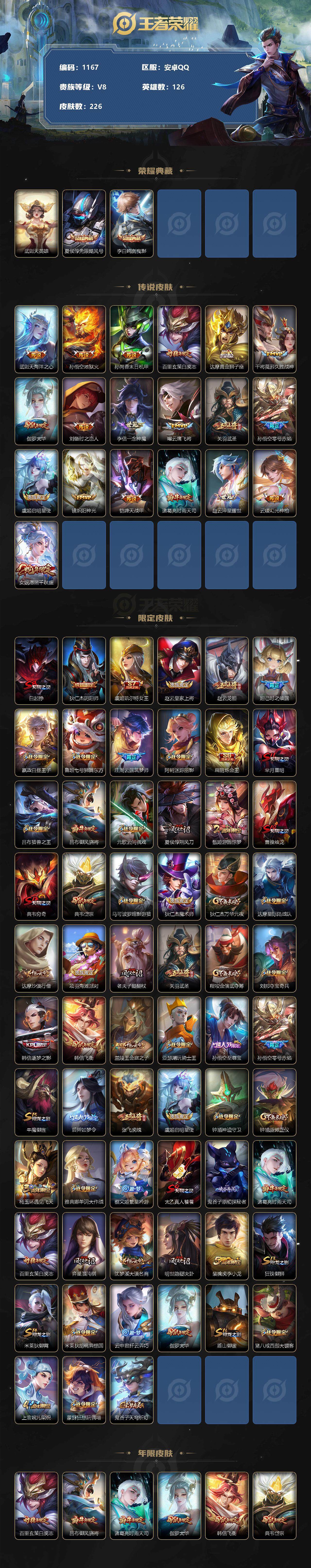 [11232570]【商品标题】:安卓Q-V8-至尊星耀II段位-126英雄-226皮肤-2典藏-0珍品无双-0无双-0珍品传说-19传说-66史诗 【荣耀典藏】:武则天英雄,夏侯惇无限飓风号,李白鸣剑曳影 【传说皮肤】:武则天海洋之心,孙悟空地狱火,孙尚香末日机甲,百里玄策白虎志,达摩黄金狮子座,干将莫邪久胜战神,伽罗太华,刘备时之恋人,李信一念神魔,曜云鹰飞将,关羽武圣,孙悟空零号赤焰,虞姬启明星使,镜炽阳神光,铠绛天战甲,诸葛亮时雨天司,赵云淬星耀世,云缨幻光神枪,女娲愿照千秋盛 【限定皮肤】:白起狰,狄仁杰阴阳师,虞姬凯尔特女王,赵云皇家上将,赵云龙胆,妲己时之彼端,嬴政白昼王子,鲁班七号狮舞东方,庄周云端筑梦师,阿轲迷踪丽影,扁鹊炼金王,芈月重明,吕布猎兽之王,吕布御风骁将,元歌云间偶戏,夏侯惇朔风刀,甄姬游园惊梦,曹操烛龙,典韦穷奇,典韦岱宗,马可波罗暗影游猎,狄仁杰魔术师,狄仁杰万华元夜,达摩星际陆战队,达摩沙漠行僧,项羽海滩派对,老夫子醍醐杖,关羽武圣,程咬金演武夺筹,刘邦夺宝奇兵,韩信逐梦之影,韩信飞衡,兰陵王金庭之子,亚瑟潮玩骑士王,孙悟空至尊宝,孙悟空零号赤焰,牛魔御旌,后羿如梦令,张飞虎魄,虞姬启明星使,钟馗神迹守卫,钟馗驱傩正仪,杨玉环遇见飞天,雅典娜单词大作战,蔡文姬繁星吟游,太乙真人饕餮,鬼谷子原初探秘者,诸葛亮时雨天司,百里玄策白虎志,弈星混沌棋,沈梦溪大漠名商,明世隐疑决卦,裴擒虎李小龙,狂铁御狮,米莱狄御霄,米莱狄胡桃异想国,云中君纤云弄巧,伽罗太华,盾山御銮,猪八戒西部大镖客,上官婉儿梁祝,蒙犽狂想玩偶喵,鬼谷子天穹祈灯 【年限皮肤】:百里玄策白虎志,吕布御风骁将,诸葛亮时雨天司,伽罗太华,韩信飞衡,典韦岱宗,马超神威,关羽武圣,张飞虎魄,赵云龙胆 【赛季限定】:扁鹊炼金王,白起狰,芈月重明,夏侯惇朔风刀,曹操烛龙,典韦穷奇,狄仁杰万华元夜,达摩沙漠行僧,老夫子醍醐杖,程咬金演武夺筹,兰陵王金庭之子,牛魔御旌,虞姬凯尔特女王,钟馗驱傩正仪,太乙真人饕餮,鬼谷子原初探秘者,弈星混沌棋,沈梦溪大漠名商,明世隐疑决卦,狂铁御狮,米莱狄御霄,盾山御銮,鬼谷子天穹祈灯 【战令限定】:嬴政白昼王子,鲁班七号狮舞东方,阿轲迷踪丽影,吕布猎兽之王,元歌云间偶戏,马可波罗暗影游猎,达摩星际陆战队,刘邦夺宝奇兵,亚瑟潮玩骑士王,钟馗神迹守卫,雅典娜单词大作战,米莱狄