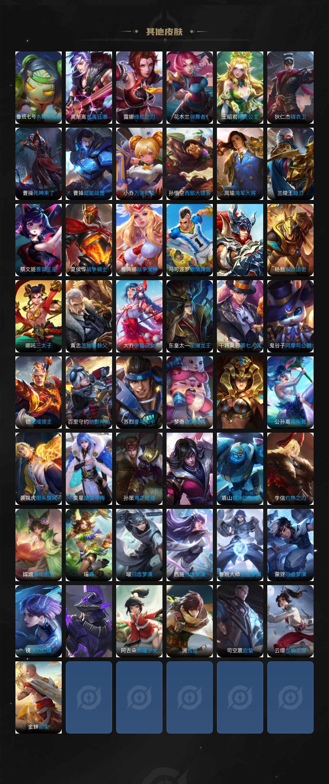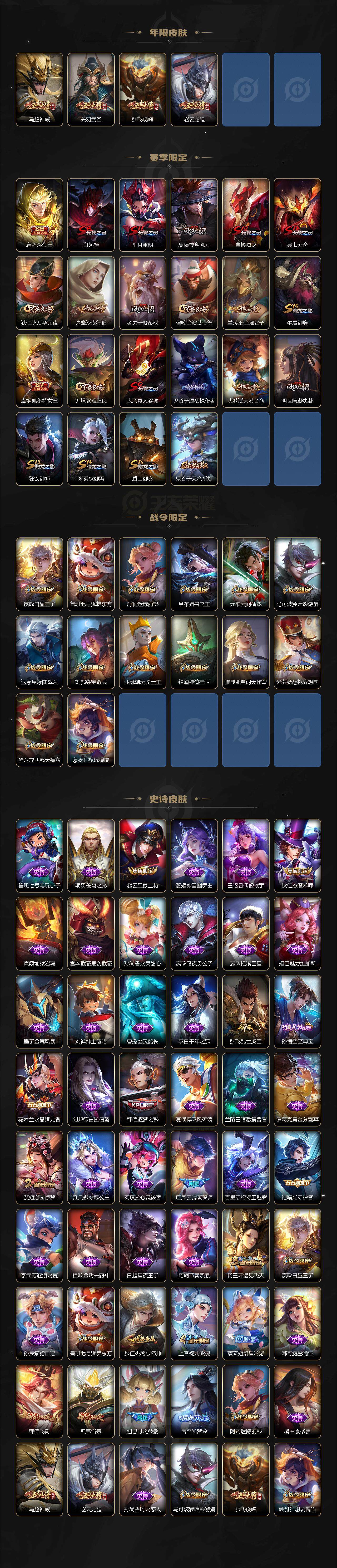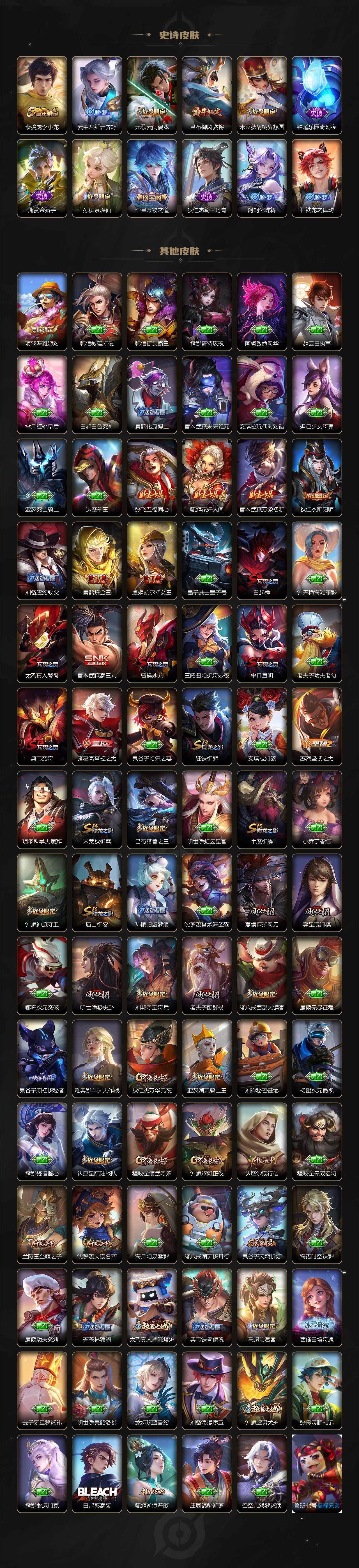【限定皮肤】:白起狰,狄仁杰阴阳师,虞姬凯尔特女王,赵云皇家上将,赵云龙胆,妲己时之彼端,嬴政白昼王子,鲁班七号狮舞东方,庄周云端筑梦师,阿轲迷踪丽影,扁鹊炼金王,芈月重明,吕布猎兽之王,吕布御风骁将,元歌云间偶戏,夏侯惇朔风刀,甄姬游园惊梦,曹操烛龙,典韦穷奇,典韦岱宗,马可波罗暗影游猎,狄仁杰魔术师,狄仁杰万华元夜,达摩星际陆战队,达摩沙漠行僧,项羽海滩派对,老夫子醍醐杖,关羽武圣,程咬金演武夺筹,刘邦夺宝奇兵,韩信逐梦之影,韩信飞衡,兰陵王金庭之子,亚瑟潮玩骑士王,孙悟空至尊宝,孙悟空零号赤焰,牛魔御旌,后羿如梦令,张飞虎魄,虞姬启明星使,钟馗神迹守卫,钟馗驱傩正仪,杨玉环遇见飞天,雅典娜单词大作战,蔡文姬繁星吟游,太乙真人饕餮,鬼谷子原初探秘者,诸葛亮时雨天司,百里玄策白虎志,弈星混沌棋,沈梦溪大漠名商,明世隐疑决卦,裴擒虎李小龙,狂铁御狮,米莱狄御霄,米莱狄胡桃异想国,云中君纤云弄巧,伽罗太华,盾山御銮,猪八戒西部大镖客,上官婉儿梁祝,蒙犽狂想玩偶喵,鬼谷子天穹祈灯