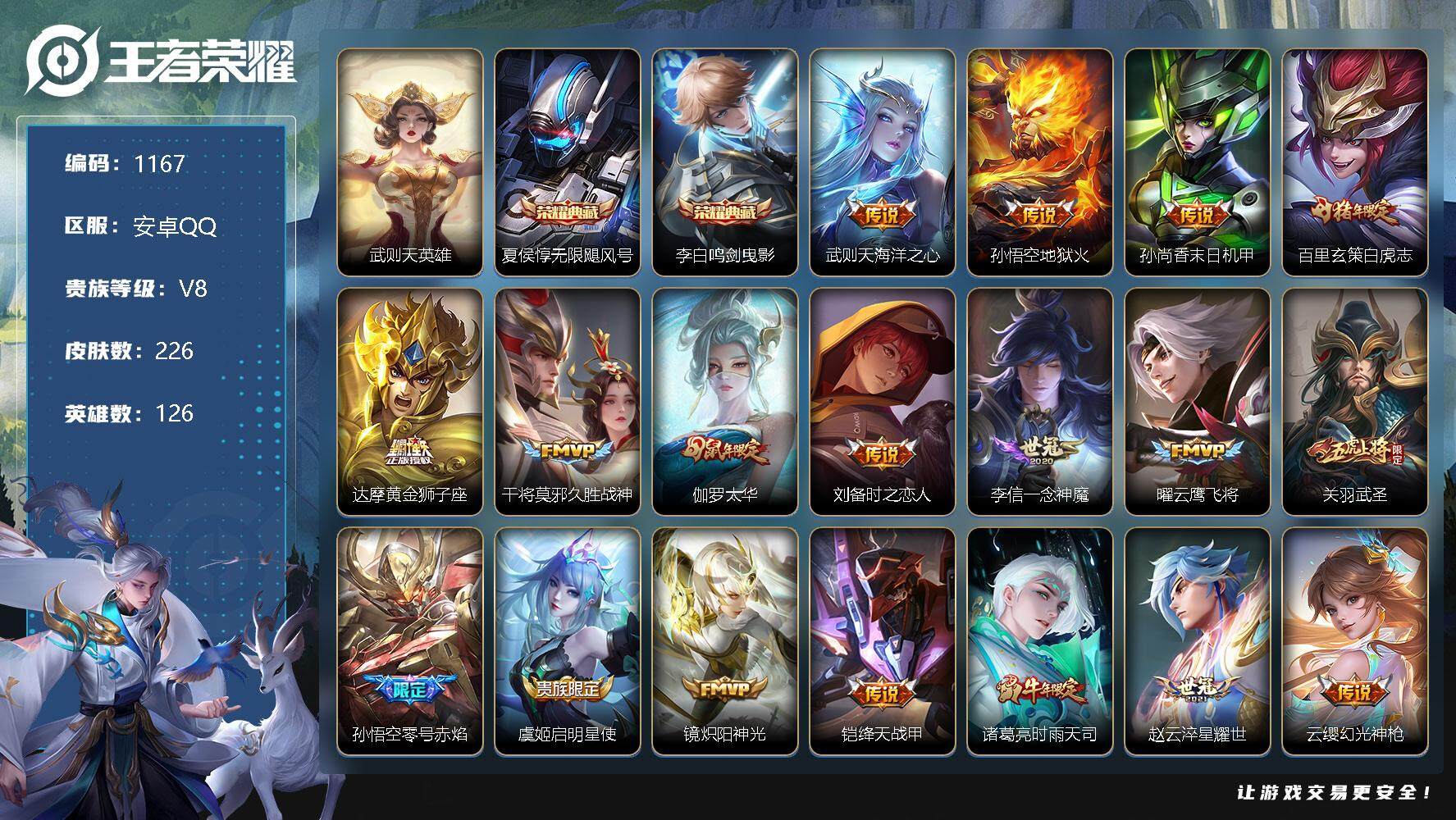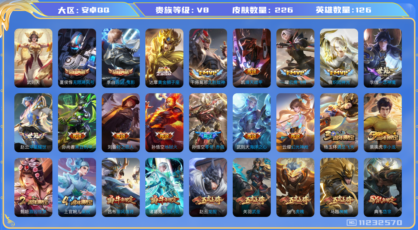 [11232570]【商品标题】:安卓Q-V8-至尊星耀II段位-126英雄-226皮肤-2典藏-0珍品无双-0无双-0珍品传说-19传说-66史诗