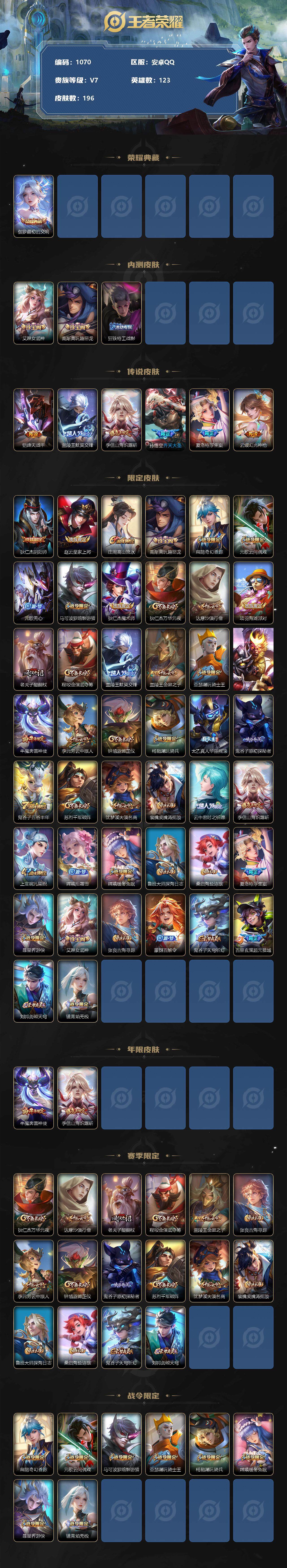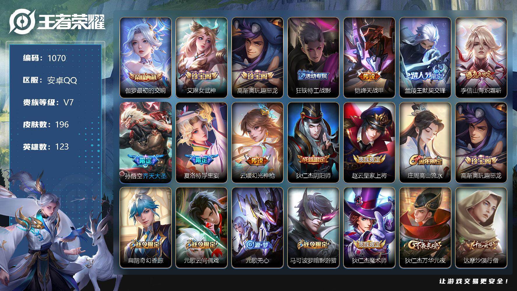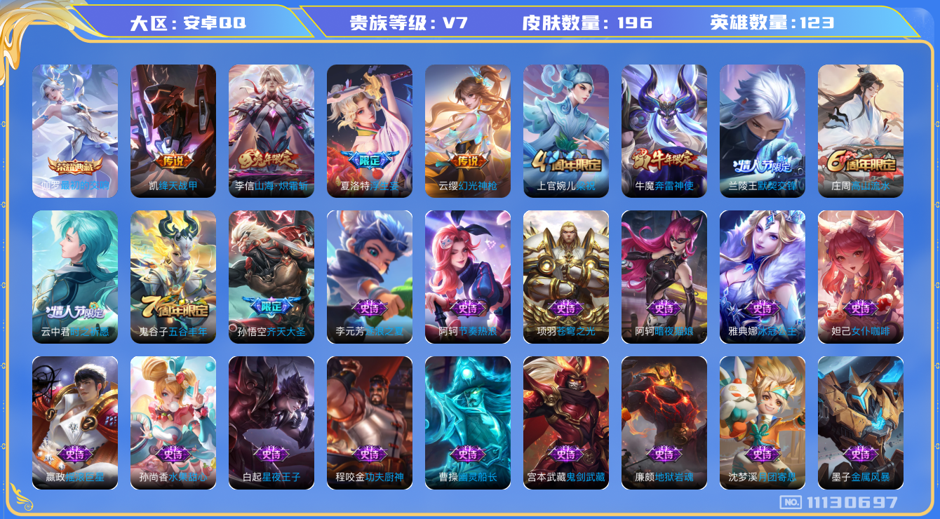 [11130697]【商品标题】:安卓Q-V7-最强王者段位-123英雄-196皮肤-1典藏-0珍品无双-0无双-0珍品传说-6传说-44史诗