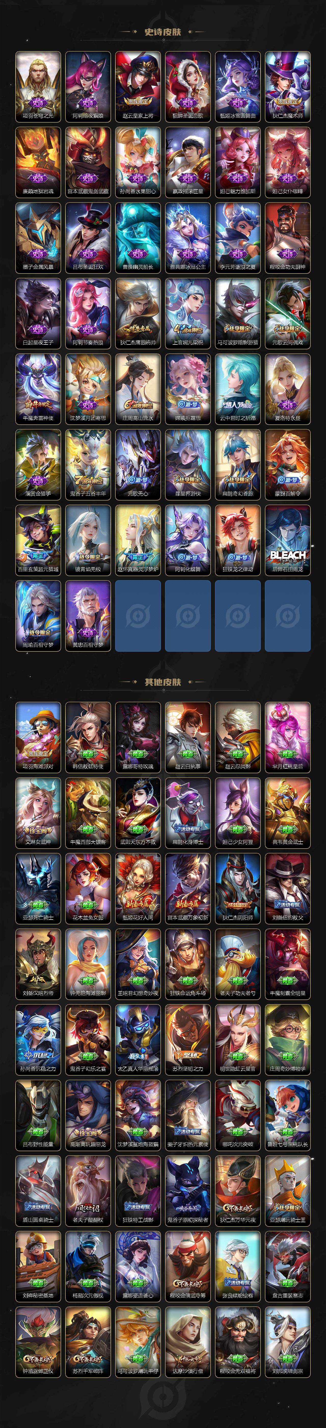 【史诗皮肤】:项羽苍穹之光,阿轲暗夜猫娘,赵云皇家上将,貂蝉圣诞恋歌,甄姬冰雪圆舞曲,狄仁杰魔术师,廉颇地狱岩魂,宫本武藏鬼剑武藏,孙尚香水果甜心,嬴政摇滚巨星,妲己魅力维加斯,妲己女仆咖啡,墨子金属风暴,吕布圣诞狂欢,曹操幽灵船长,雅典娜冰冠公主,李元芳逐浪之夏,程咬金功夫厨神,白起星夜王子,阿轲节奏热浪,狄仁杰鹰眼统帅,上官婉儿梁祝,马可波罗暗影游猎,元歌云间偶戏,牛魔奔雷神使,沈梦溪月团寄思,庄周高山流水,嫦娥拒霜思,云中君时之祈愿,夏洛特永昼,澜赏金猎手,鬼谷子五谷丰年,元歌无心,暃星界游侠,扁鹊奇幻香踪,蒙犽百解令,百里玄策超元猎域,镜青焰无极,赵怀真器灵浮梦炉,阿轲化蝶舞