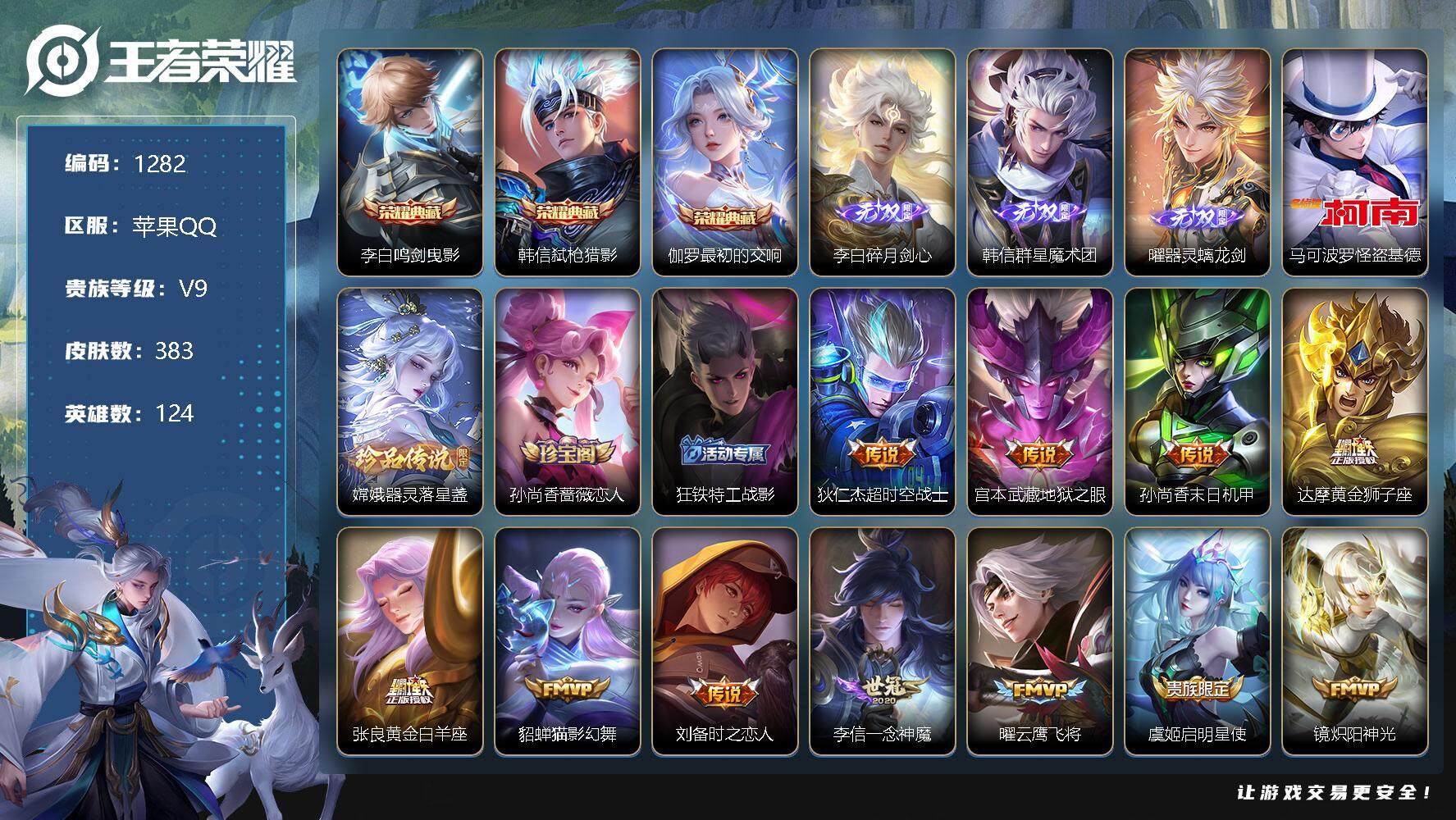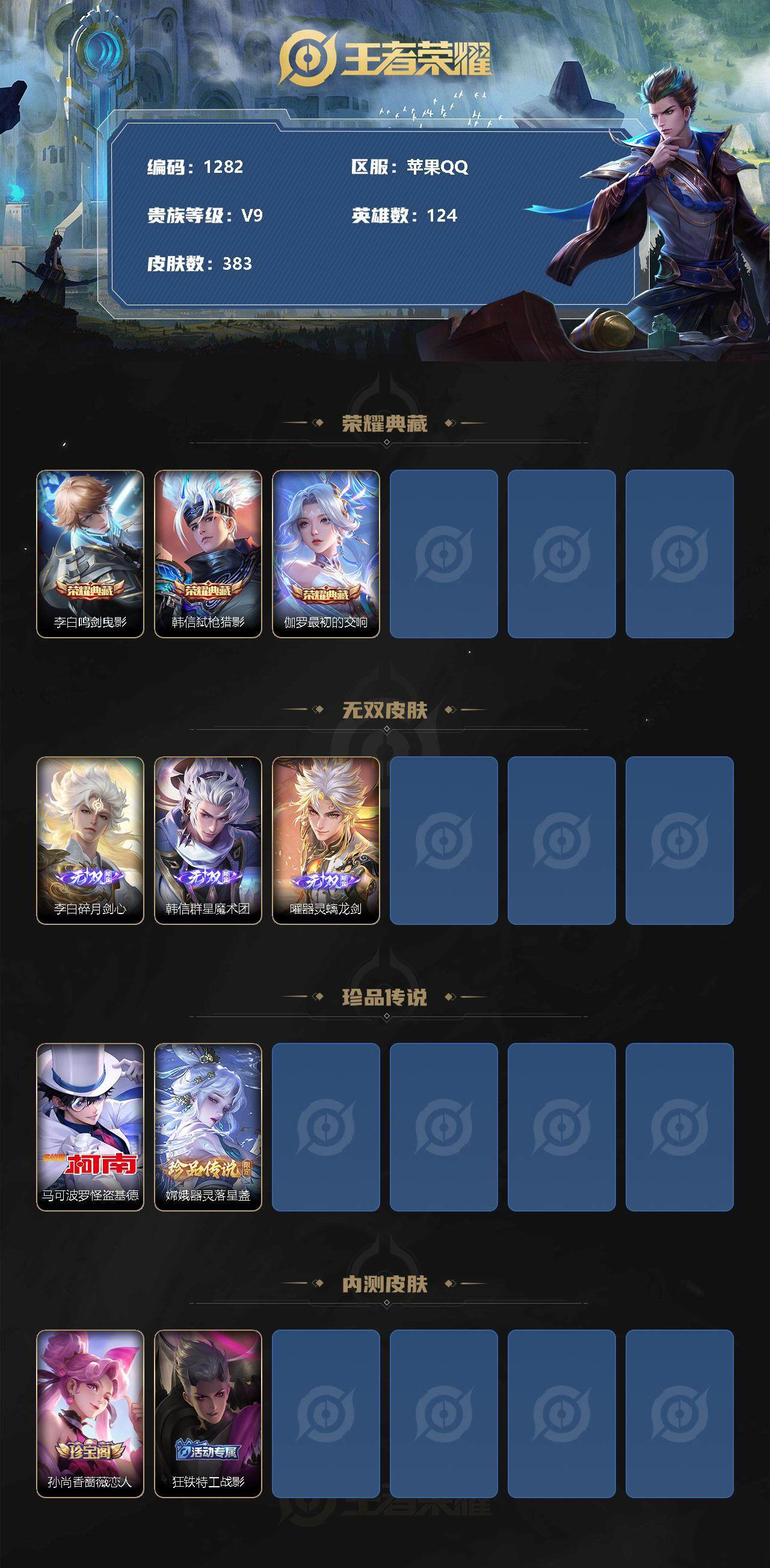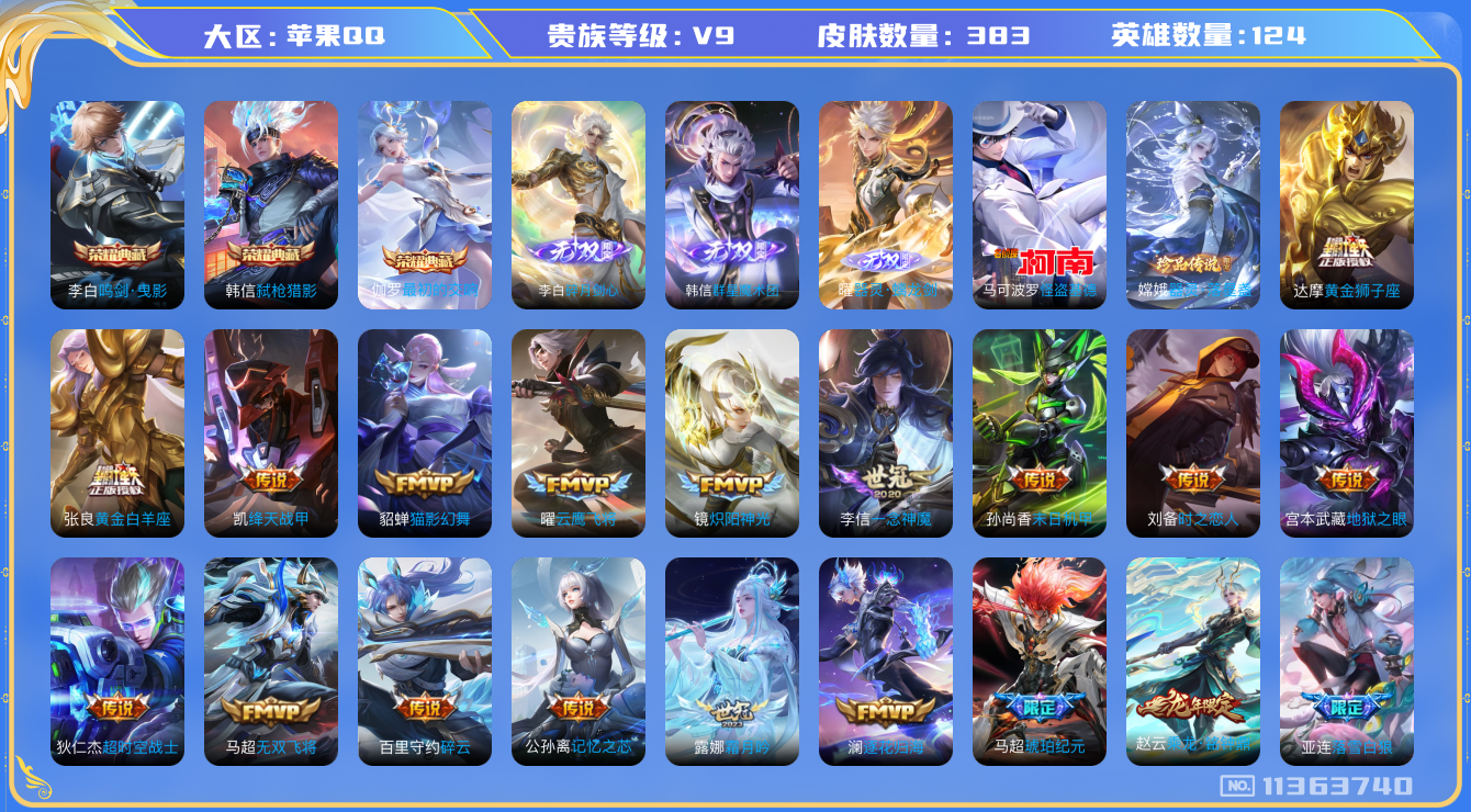 [11363740]【商品标题】:苹果Q-V9-最强王者段位-124英雄-383皮肤-3典藏-0珍品无双-3无双-2珍品传说-31传说-114史诗