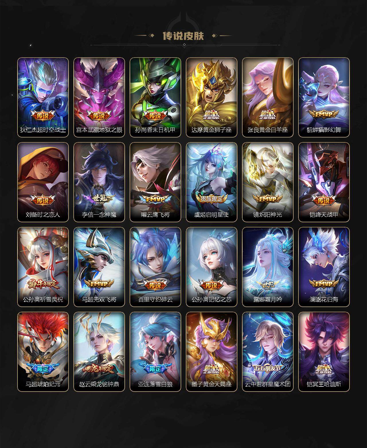 【传说皮肤】:后羿千劫归真,司空震愿照山河定,澜愿照九州拓,云缨幻光神枪,裴擒虎祥瑞亨通,桑启鸣野蒿,夏侯惇霜北刀,铠冥王哈迪斯,云中君群星魔术团,墨子黄金天蝎座,亚连落雪白狼,赵云乘龙铭钟鼎,马超琥珀纪元,澜逐花归海,露娜霜月吟,公孙离记忆之芯,百里守约碎云,马超无双飞将,公孙离祈雪灵祝,铠绛天战甲,镜炽阳神光,虞姬启明星使,曜云鹰飞将,李信一念神魔,刘备时之恋人,貂蝉猫影幻舞,张良黄金白羊座,达摩黄金狮子座,孙尚香末日机甲,宫本武藏地狱之眼,狄仁杰超时空战士
