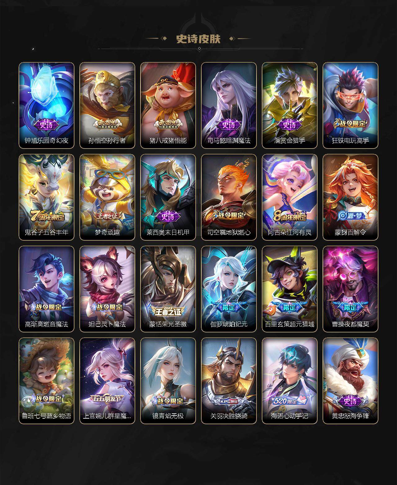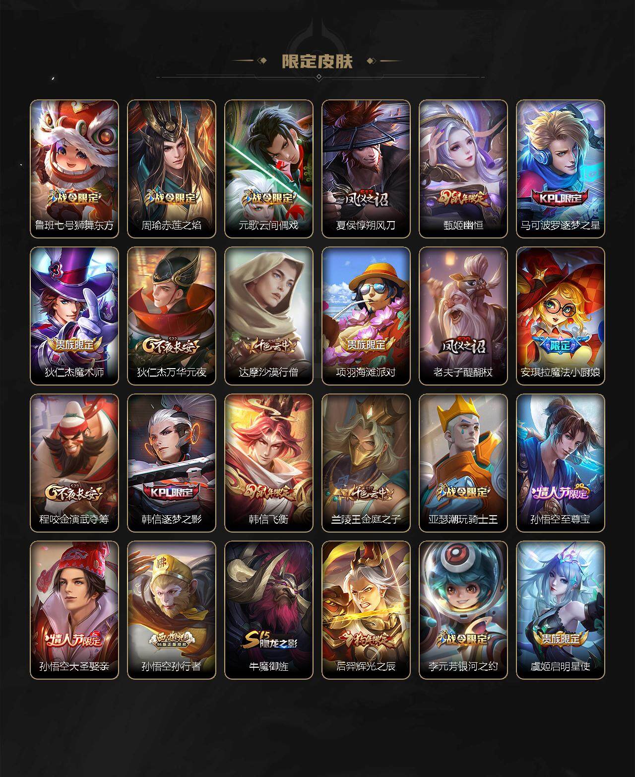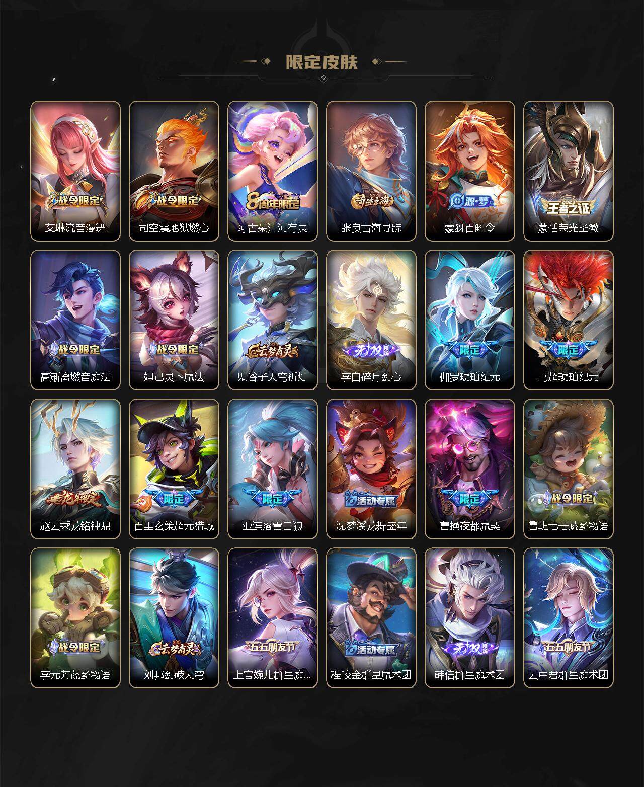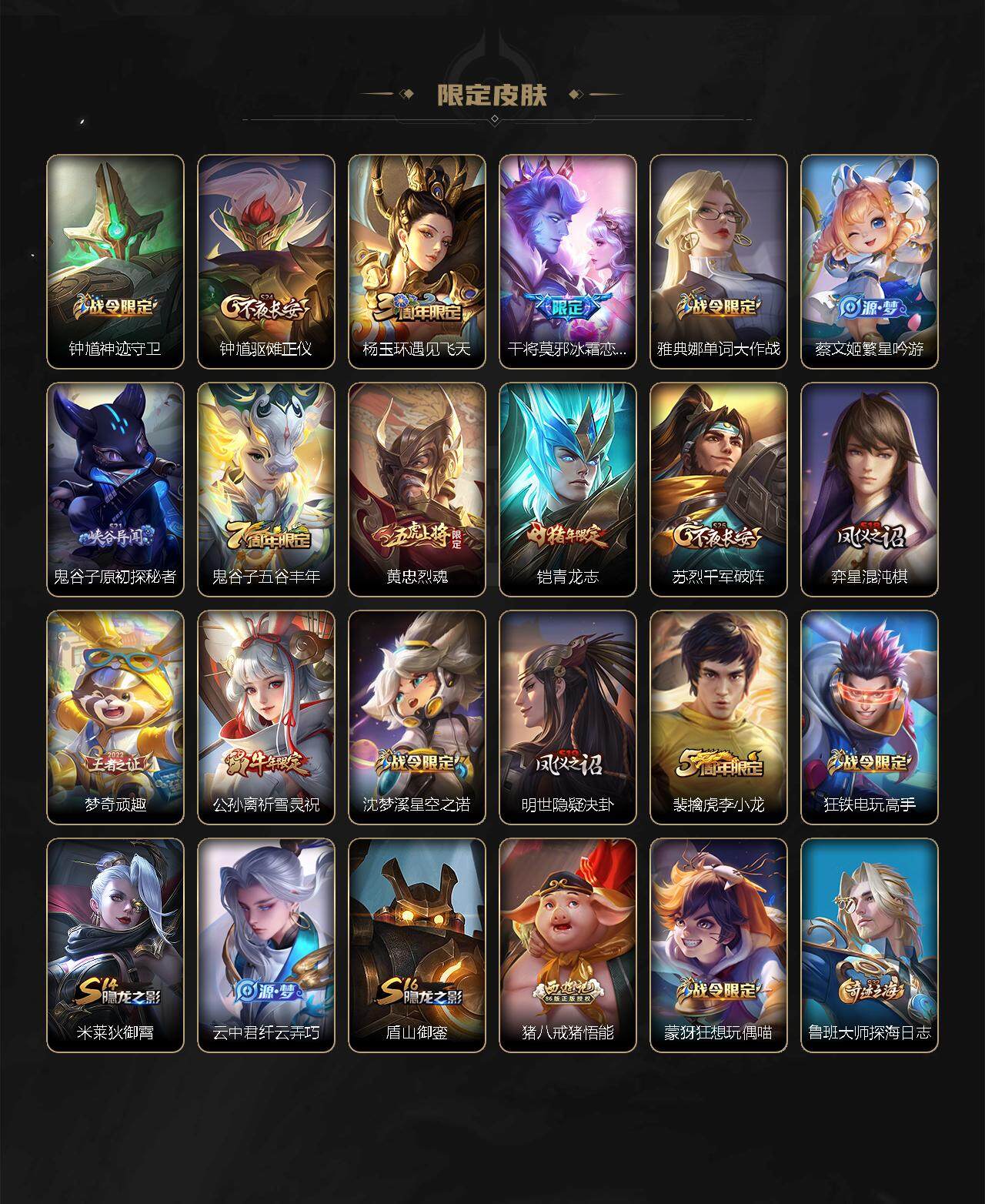 【限定皮肤】:夏侯惇霜北刀,铠冥王哈迪斯,暃埋骨钱,蒙犽顽岩魄,蔡文姬夏日便利店,大乔绒语心约,虞姬夏日便利店,姜子牙天穹之誓,杨戬破阵退雄兵,狄仁杰阴阳师,赵云皇家上将,孙尚香蔷薇恋人,鲁班七号狮舞东方,周瑜赤莲之焰,元歌云间偶戏,夏侯惇朔风刀,甄姬幽恒,马可波罗逐梦之星,狄仁杰魔术师,狄仁杰万华元夜,达摩沙漠行僧,项羽海滩派对,老夫子醍醐杖,安琪拉魔法小厨娘,程咬金演武夺筹,韩信逐梦之影,韩信飞衡,兰陵王金庭之子,亚瑟潮玩骑士王,孙悟空至尊宝,孙悟空大圣娶亲,孙悟空孙行者,牛魔御旌,后羿辉光之辰,李元芳银河之约,虞姬启明星使,钟馗神迹守卫,钟馗驱傩正仪,杨玉环遇见飞天,干将莫邪冰霜恋舞曲,雅典娜单词大作战,蔡文姬繁星吟游,鬼谷子原初探秘者,鬼谷子五谷丰年,黄忠烈魂,铠青龙志,苏烈千军破阵,弈星混沌棋,梦奇顽趣,公孙离祈雪灵祝,沈梦溪星空之诺,明世隐疑决卦,裴擒虎李小龙,狂铁电玩高手,米莱狄御霄,云中君纤云弄巧,盾山御銮,猪八戒猪悟能,蒙犽狂想玩偶喵,鲁班大师探海日志,艾琳流音漫舞,司空震地狱燃心,阿古朵江河有灵,张良古海寻踪,蒙犽百解令,蒙恬荣光圣徽,高渐离燃音魔法,妲己灵卜魔法,鬼谷子天穹祈灯,李白碎月剑心,伽罗琥珀纪元,马超琥珀纪元,赵云乘龙铭钟鼎,百里玄策超元猎域,亚连落雪白狼,沈梦溪龙舞盛年,曹操夜都魔契,鲁班七号蔬乡物语,李元芳蔬乡物语,刘邦剑破天穹,上官婉儿群星魔术团,程咬金群星魔术团,韩信群星魔术团,