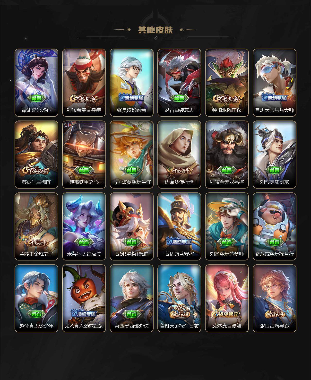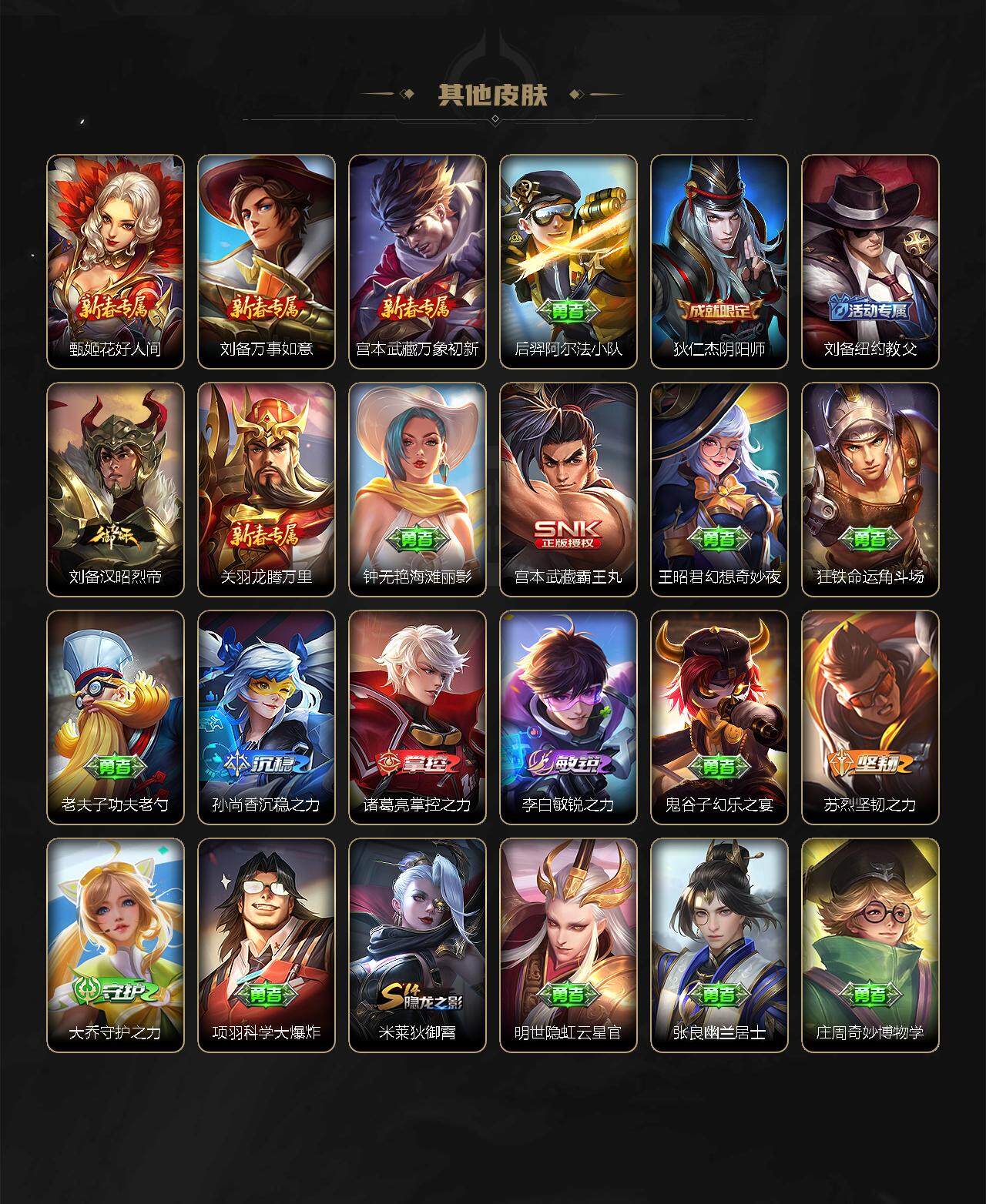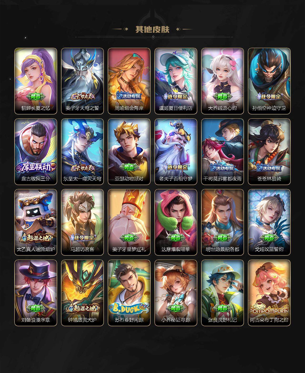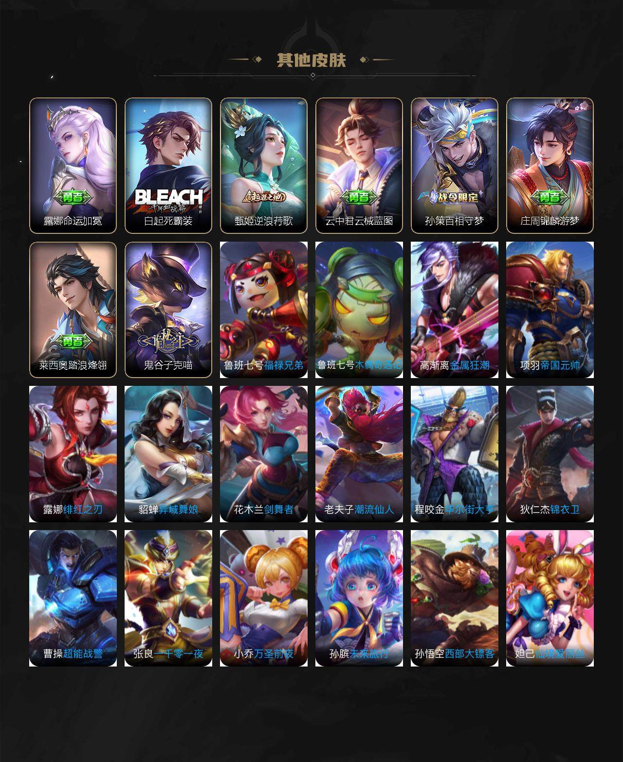 【限定皮肤】:夏侯惇霜北刀,铠冥王哈迪斯,暃埋骨钱,蒙犽顽岩魄,蔡文姬夏日便利店,大乔绒语心约,虞姬夏日便利店,姜子牙天穹之誓,杨戬破阵退雄兵,狄仁杰阴阳师,赵云皇家上将,孙尚香蔷薇恋人,鲁班七号狮舞东方,周瑜赤莲之焰,元歌云间偶戏,夏侯惇朔风刀,甄姬幽恒,马可波罗逐梦之星,狄仁杰魔术师,狄仁杰万华元夜,达摩沙漠行僧,项羽海滩派对,老夫子醍醐杖,安琪拉魔法小厨娘,程咬金演武夺筹,韩信逐梦之影,韩信飞衡,兰陵王金庭之子,亚瑟潮玩骑士王,孙悟空至尊宝,孙悟空大圣娶亲,孙悟空孙行者,牛魔御旌,后羿辉光之辰,李元芳银河之约,虞姬启明星使,钟馗神迹守卫,钟馗驱傩正仪,杨玉环遇见飞天,干将莫邪冰霜恋舞曲,雅典娜单词大作战,蔡文姬繁星吟游,鬼谷子原初探秘者,鬼谷子五谷丰年,黄忠烈魂,铠青龙志,苏烈千军破阵,弈星混沌棋,梦奇顽趣,公孙离祈雪灵祝,沈梦溪星空之诺,明世隐疑决卦,裴擒虎李小龙,狂铁电玩高手,米莱狄御霄,云中君纤云弄巧,盾山御銮,猪八戒猪悟能,蒙犽狂想玩偶喵,鲁班大师探海日志,艾琳流音漫舞,司空震地狱燃心,阿古朵江河有灵,张良古海寻踪,蒙犽百解令,蒙恬荣光圣徽,高渐离燃音魔法,妲己灵卜魔法,鬼谷子天穹祈灯,李白碎月剑心,伽罗琥珀纪元,马超琥珀纪元,赵云乘龙铭钟鼎,百里玄策超元猎域,亚连落雪白狼,沈梦溪龙舞盛年,曹操夜都魔契,鲁班七号蔬乡物语,李元芳蔬乡物语,刘邦剑破天穹,上官婉儿群星魔术团,程咬金群星魔术团,韩信群星魔术团,
