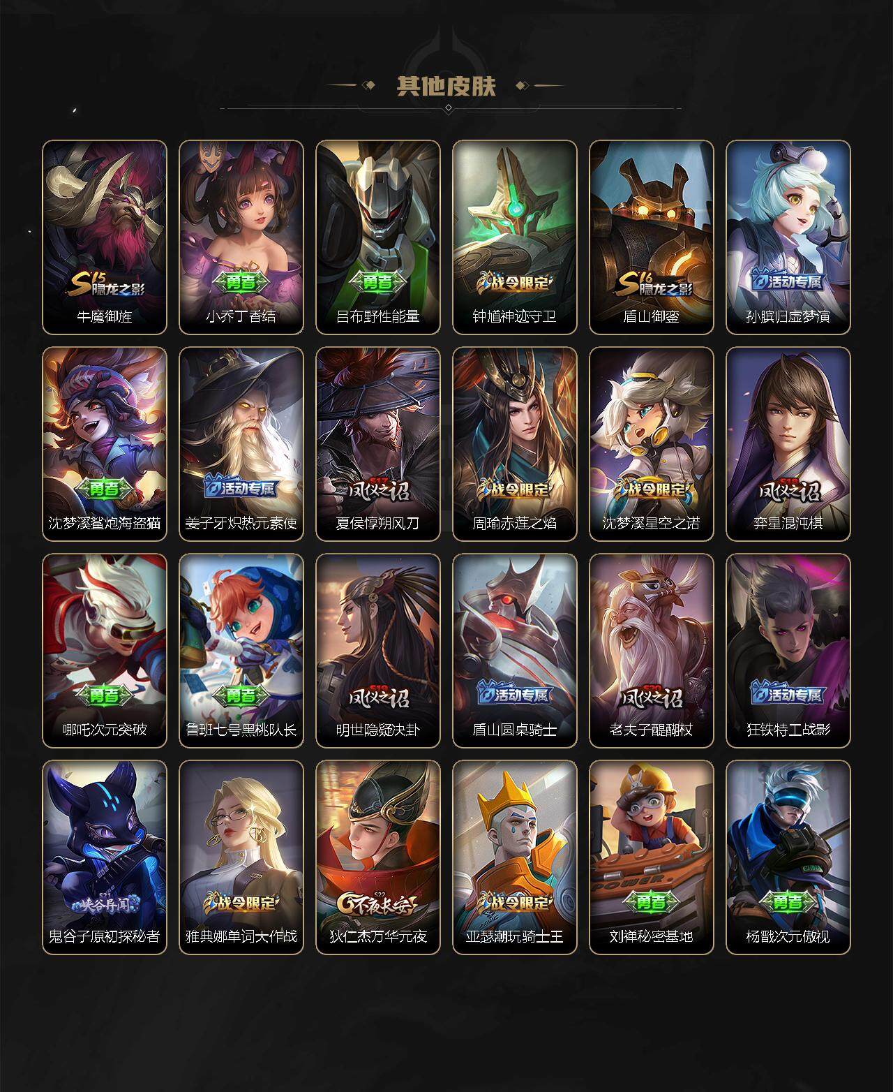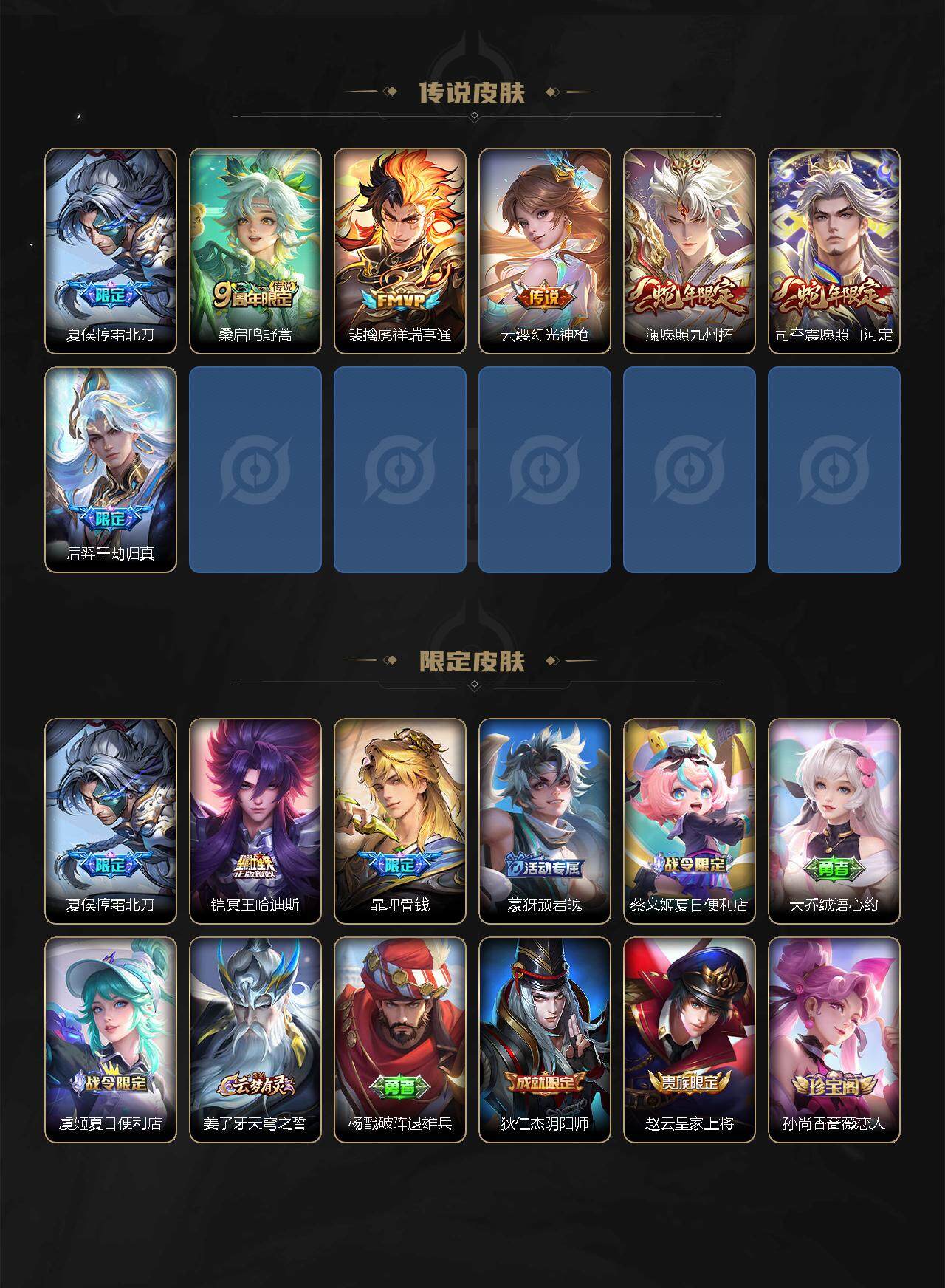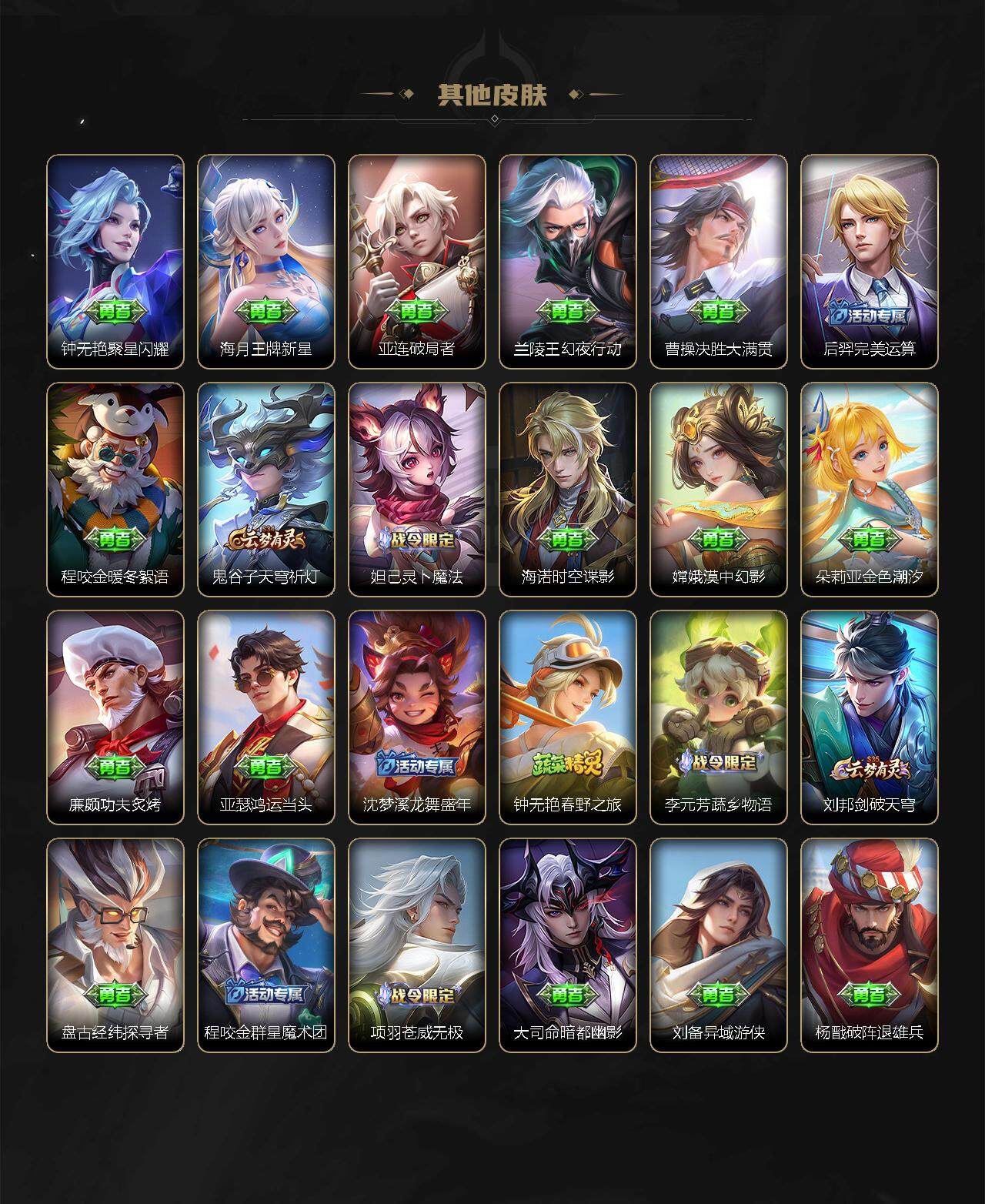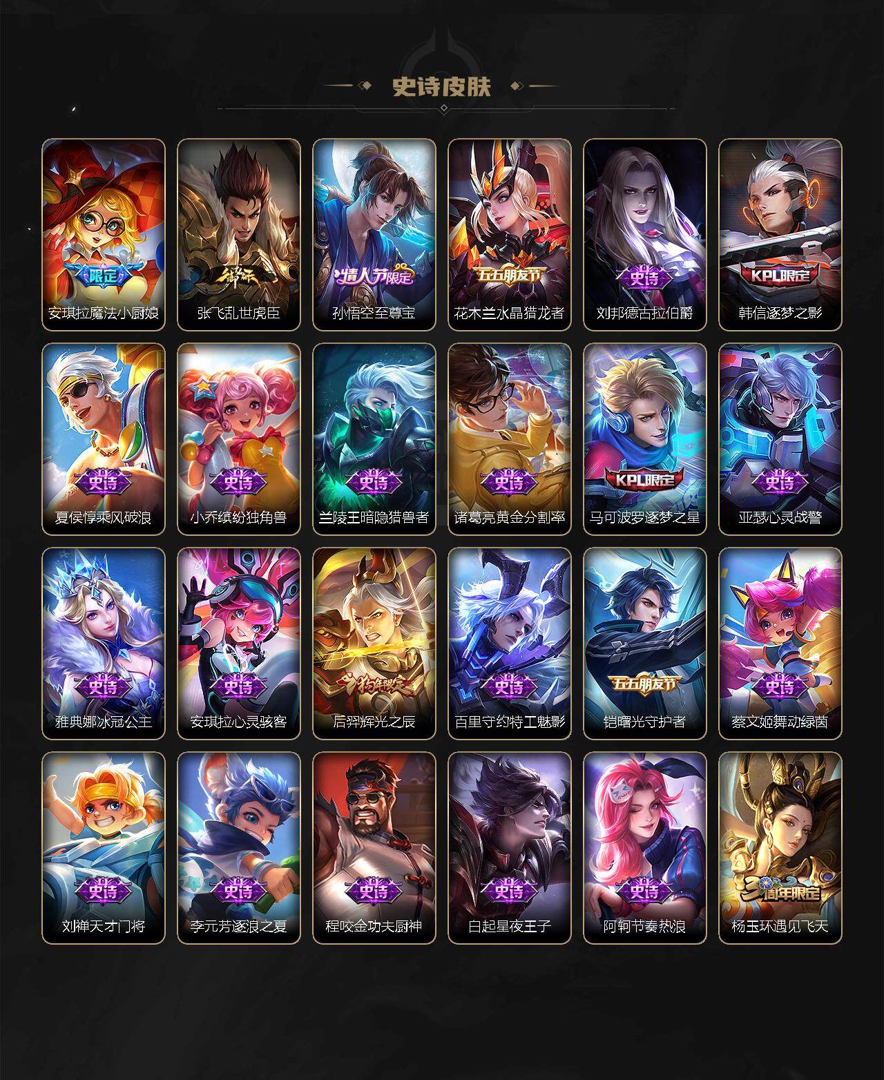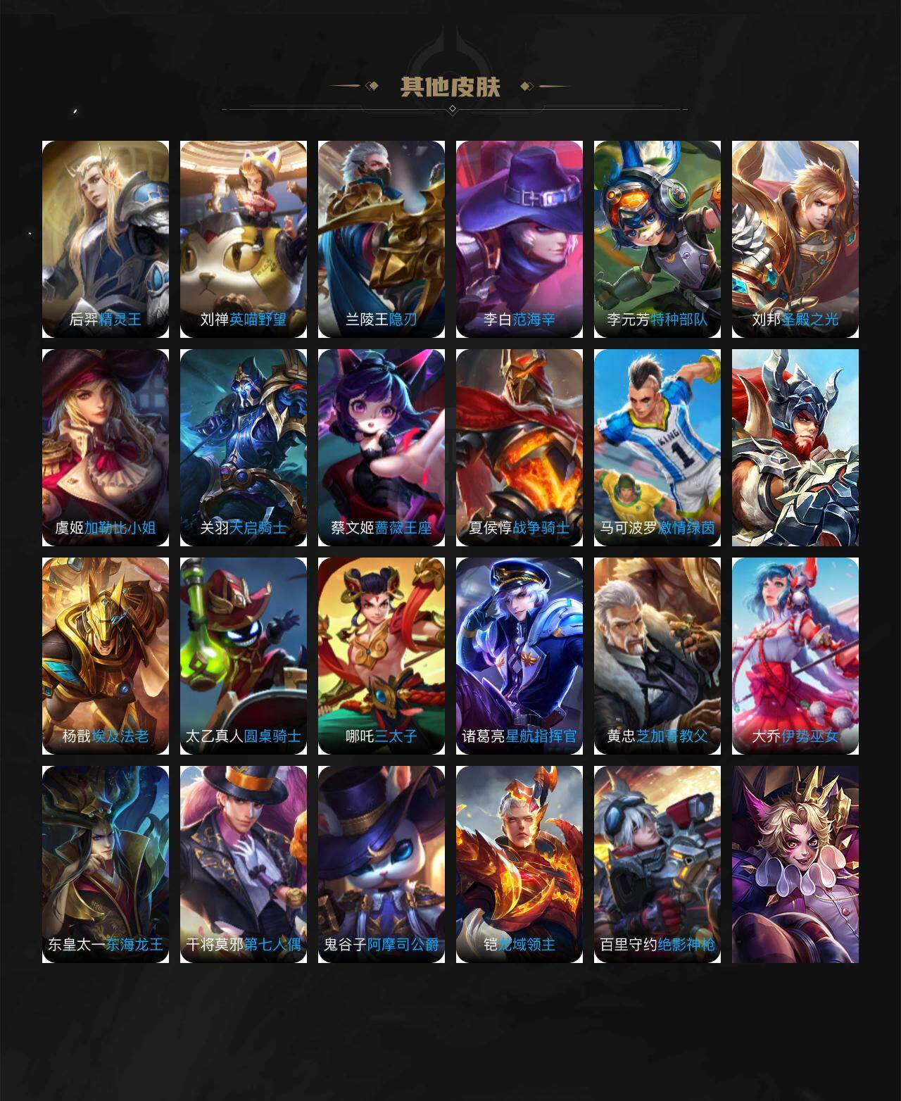 【限定皮肤】:夏侯惇霜北刀,铠冥王哈迪斯,暃埋骨钱,蒙犽顽岩魄,蔡文姬夏日便利店,大乔绒语心约,虞姬夏日便利店,姜子牙天穹之誓,杨戬破阵退雄兵,狄仁杰阴阳师,赵云皇家上将,孙尚香蔷薇恋人,鲁班七号狮舞东方,周瑜赤莲之焰,元歌云间偶戏,夏侯惇朔风刀,甄姬幽恒,马可波罗逐梦之星,狄仁杰魔术师,狄仁杰万华元夜,达摩沙漠行僧,项羽海滩派对,老夫子醍醐杖,安琪拉魔法小厨娘,程咬金演武夺筹,韩信逐梦之影,韩信飞衡,兰陵王金庭之子,亚瑟潮玩骑士王,孙悟空至尊宝,孙悟空大圣娶亲,孙悟空孙行者,牛魔御旌,后羿辉光之辰,李元芳银河之约,虞姬启明星使,钟馗神迹守卫,钟馗驱傩正仪,杨玉环遇见飞天,干将莫邪冰霜恋舞曲,雅典娜单词大作战,蔡文姬繁星吟游,鬼谷子原初探秘者,鬼谷子五谷丰年,黄忠烈魂,铠青龙志,苏烈千军破阵,弈星混沌棋,梦奇顽趣,公孙离祈雪灵祝,沈梦溪星空之诺,明世隐疑决卦,裴擒虎李小龙,狂铁电玩高手,米莱狄御霄,云中君纤云弄巧,盾山御銮,猪八戒猪悟能,蒙犽狂想玩偶喵,鲁班大师探海日志,艾琳流音漫舞,司空震地狱燃心,阿古朵江河有灵,张良古海寻踪,蒙犽百解令,蒙恬荣光圣徽,高渐离燃音魔法,妲己灵卜魔法,鬼谷子天穹祈灯,李白碎月剑心,伽罗琥珀纪元,马超琥珀纪元,赵云乘龙铭钟鼎,百里玄策超元猎域,亚连落雪白狼,沈梦溪龙舞盛年,曹操夜都魔契,鲁班七号蔬乡物语,李元芳蔬乡物语,刘邦剑破天穹,上官婉儿群星魔术团,程咬金群星魔术团,韩信群星魔术团,
