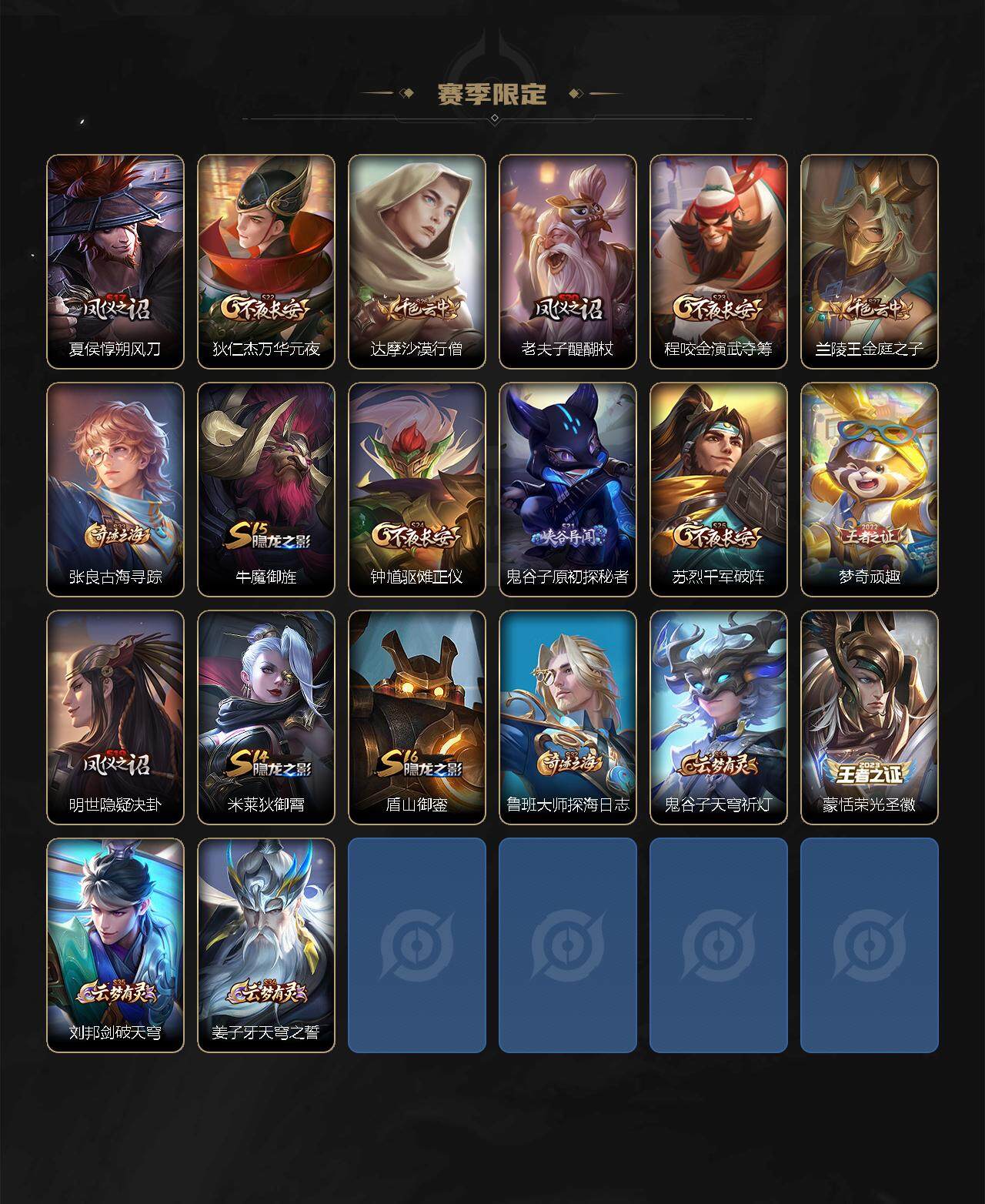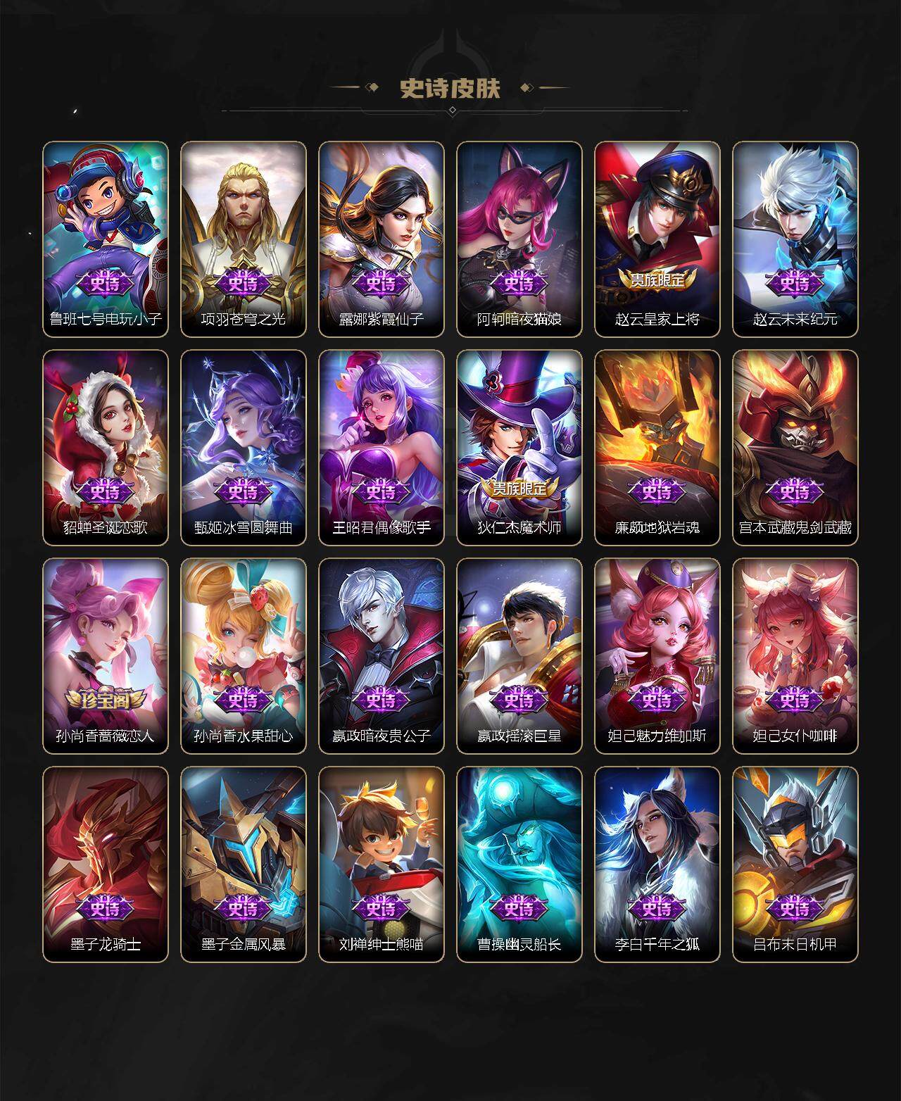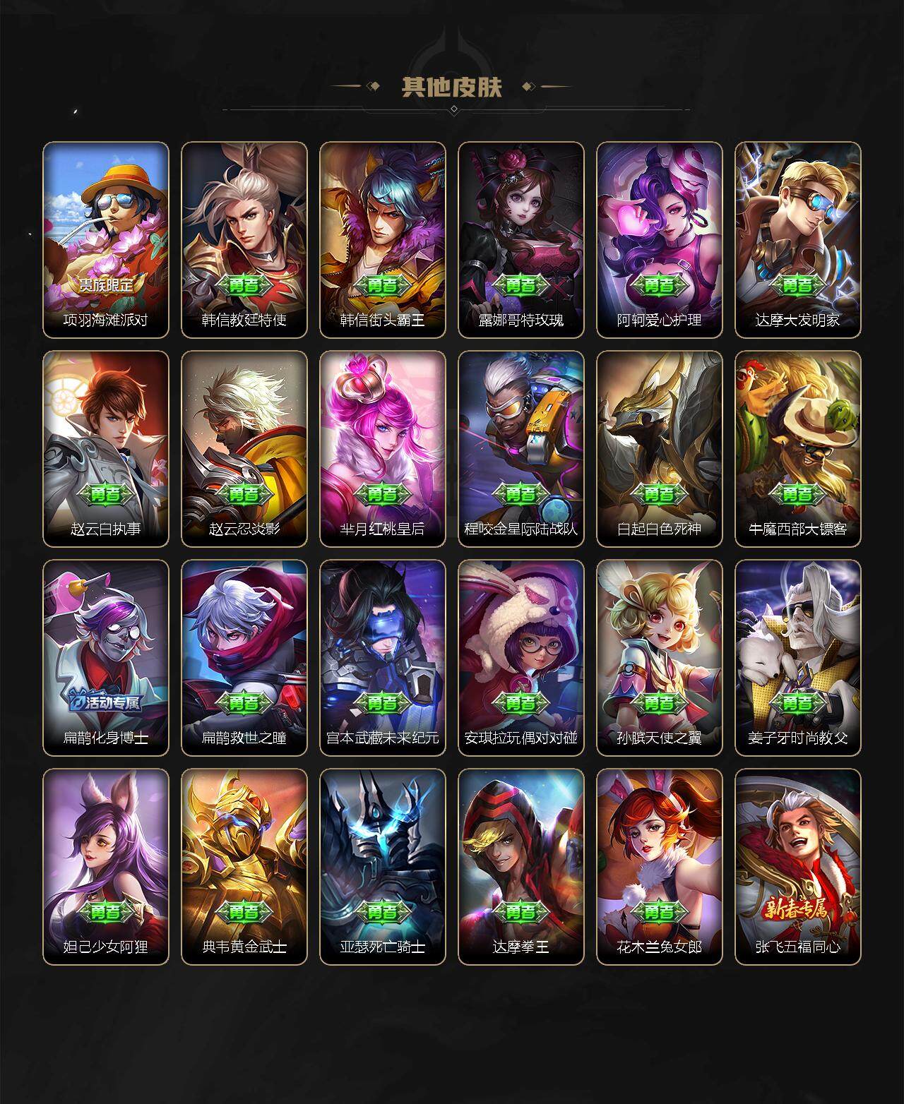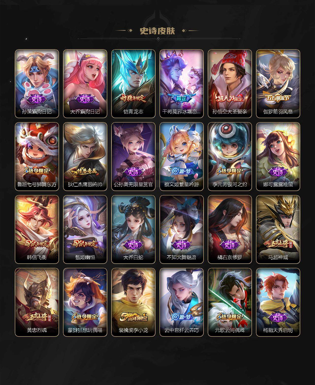 【限定皮肤】:夏侯惇霜北刀,铠冥王哈迪斯,暃埋骨钱,蒙犽顽岩魄,蔡文姬夏日便利店,大乔绒语心约,虞姬夏日便利店,姜子牙天穹之誓,杨戬破阵退雄兵,狄仁杰阴阳师,赵云皇家上将,孙尚香蔷薇恋人,鲁班七号狮舞东方,周瑜赤莲之焰,元歌云间偶戏,夏侯惇朔风刀,甄姬幽恒,马可波罗逐梦之星,狄仁杰魔术师,狄仁杰万华元夜,达摩沙漠行僧,项羽海滩派对,老夫子醍醐杖,安琪拉魔法小厨娘,程咬金演武夺筹,韩信逐梦之影,韩信飞衡,兰陵王金庭之子,亚瑟潮玩骑士王,孙悟空至尊宝,孙悟空大圣娶亲,孙悟空孙行者,牛魔御旌,后羿辉光之辰,李元芳银河之约,虞姬启明星使,钟馗神迹守卫,钟馗驱傩正仪,杨玉环遇见飞天,干将莫邪冰霜恋舞曲,雅典娜单词大作战,蔡文姬繁星吟游,鬼谷子原初探秘者,鬼谷子五谷丰年,黄忠烈魂,铠青龙志,苏烈千军破阵,弈星混沌棋,梦奇顽趣,公孙离祈雪灵祝,沈梦溪星空之诺,明世隐疑决卦,裴擒虎李小龙,狂铁电玩高手,米莱狄御霄,云中君纤云弄巧,盾山御銮,猪八戒猪悟能,蒙犽狂想玩偶喵,鲁班大师探海日志,艾琳流音漫舞,司空震地狱燃心,阿古朵江河有灵,张良古海寻踪,蒙犽百解令,蒙恬荣光圣徽,高渐离燃音魔法,妲己灵卜魔法,鬼谷子天穹祈灯,李白碎月剑心,伽罗琥珀纪元,马超琥珀纪元,赵云乘龙铭钟鼎,百里玄策超元猎域,亚连落雪白狼,沈梦溪龙舞盛年,曹操夜都魔契,鲁班七号蔬乡物语,李元芳蔬乡物语,刘邦剑破天穹,上官婉儿群星魔术团,程咬金群星魔术团,韩信群星魔术团,