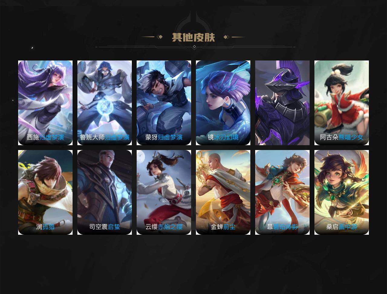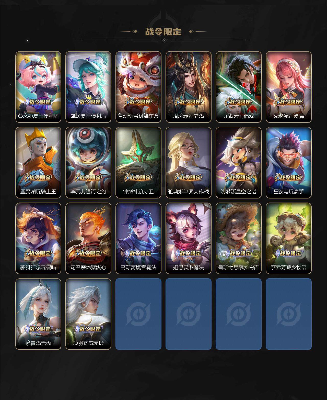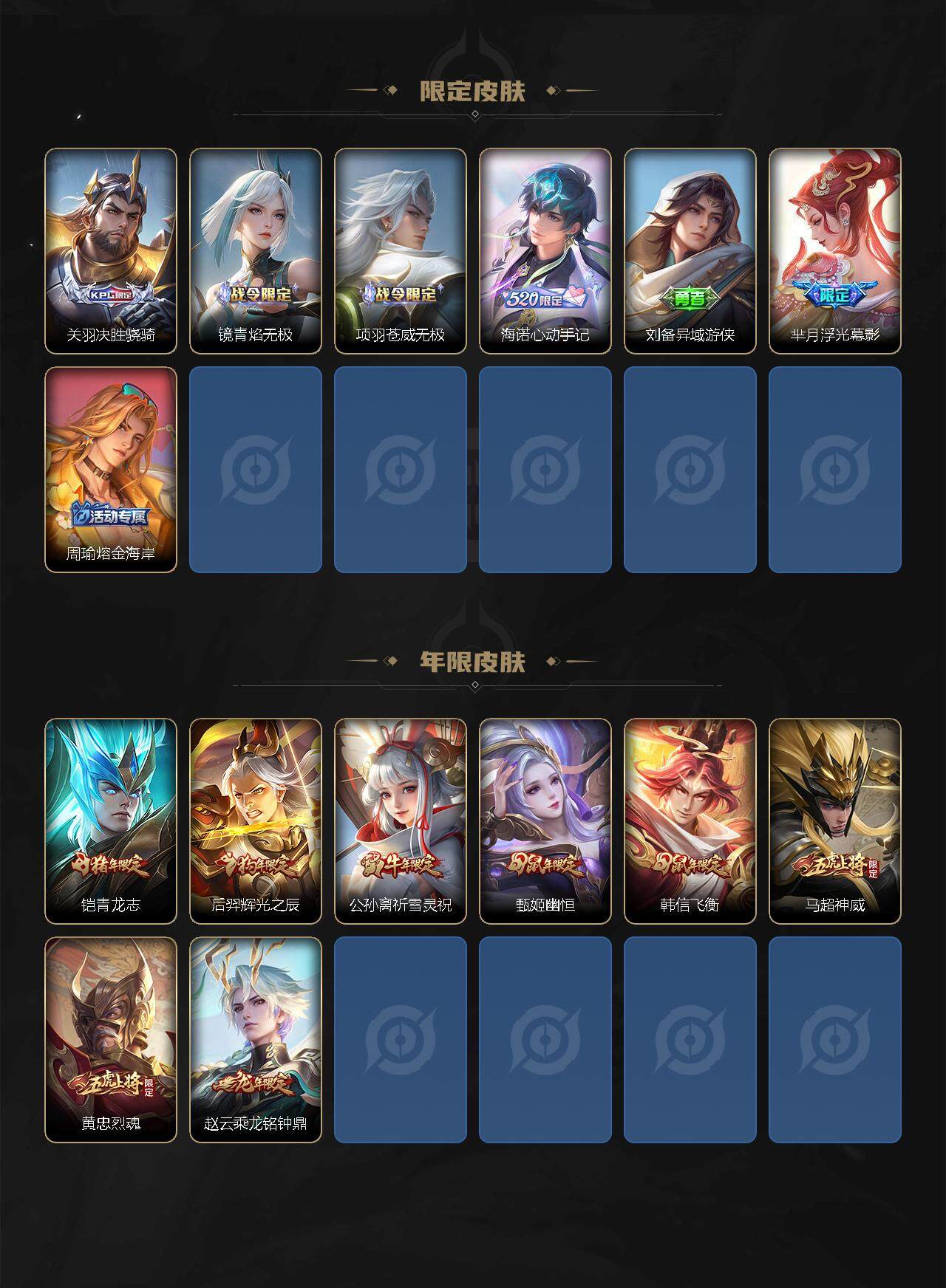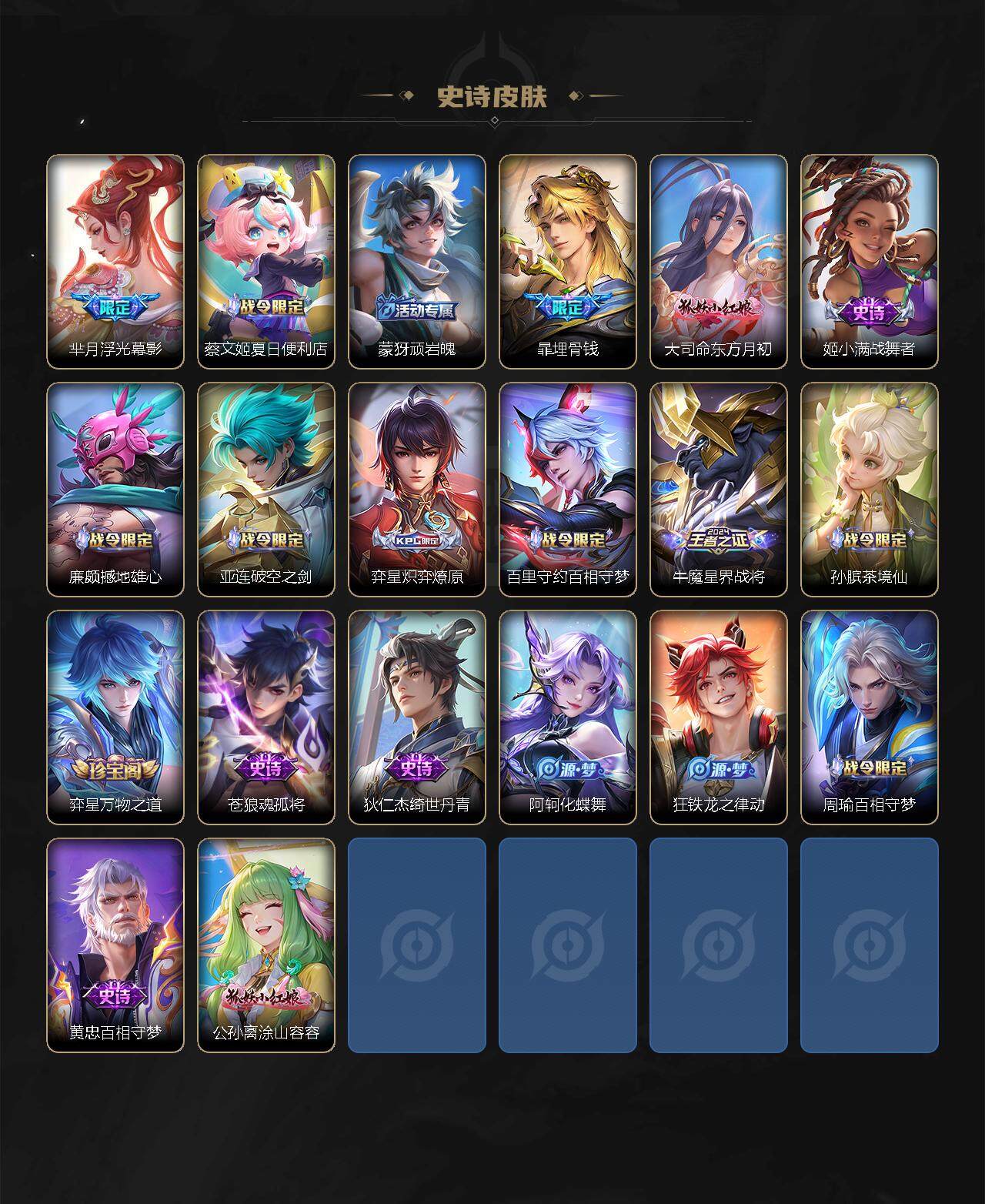 【限定皮肤】:夏侯惇霜北刀,铠冥王哈迪斯,暃埋骨钱,蒙犽顽岩魄,蔡文姬夏日便利店,大乔绒语心约,虞姬夏日便利店,姜子牙天穹之誓,杨戬破阵退雄兵,狄仁杰阴阳师,赵云皇家上将,孙尚香蔷薇恋人,鲁班七号狮舞东方,周瑜赤莲之焰,元歌云间偶戏,夏侯惇朔风刀,甄姬幽恒,马可波罗逐梦之星,狄仁杰魔术师,狄仁杰万华元夜,达摩沙漠行僧,项羽海滩派对,老夫子醍醐杖,安琪拉魔法小厨娘,程咬金演武夺筹,韩信逐梦之影,韩信飞衡,兰陵王金庭之子,亚瑟潮玩骑士王,孙悟空至尊宝,孙悟空大圣娶亲,孙悟空孙行者,牛魔御旌,后羿辉光之辰,李元芳银河之约,虞姬启明星使,钟馗神迹守卫,钟馗驱傩正仪,杨玉环遇见飞天,干将莫邪冰霜恋舞曲,雅典娜单词大作战,蔡文姬繁星吟游,鬼谷子原初探秘者,鬼谷子五谷丰年,黄忠烈魂,铠青龙志,苏烈千军破阵,弈星混沌棋,梦奇顽趣,公孙离祈雪灵祝,沈梦溪星空之诺,明世隐疑决卦,裴擒虎李小龙,狂铁电玩高手,米莱狄御霄,云中君纤云弄巧,盾山御銮,猪八戒猪悟能,蒙犽狂想玩偶喵,鲁班大师探海日志,艾琳流音漫舞,司空震地狱燃心,阿古朵江河有灵,张良古海寻踪,蒙犽百解令,蒙恬荣光圣徽,高渐离燃音魔法,妲己灵卜魔法,鬼谷子天穹祈灯,李白碎月剑心,伽罗琥珀纪元,马超琥珀纪元,赵云乘龙铭钟鼎,百里玄策超元猎域,亚连落雪白狼,沈梦溪龙舞盛年,曹操夜都魔契,鲁班七号蔬乡物语,李元芳蔬乡物语,刘邦剑破天穹,上官婉儿群星魔术团,程咬金群星魔术团,韩信群星魔术团,