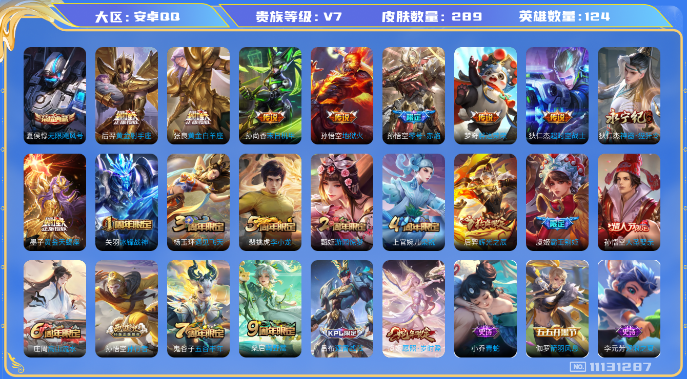 [11131287]【商品标题】:安卓Q-V6-最强王者段位-124英雄-289皮肤-1典藏-0珍品无双-0无双-0珍品传说-11传说-88史诗