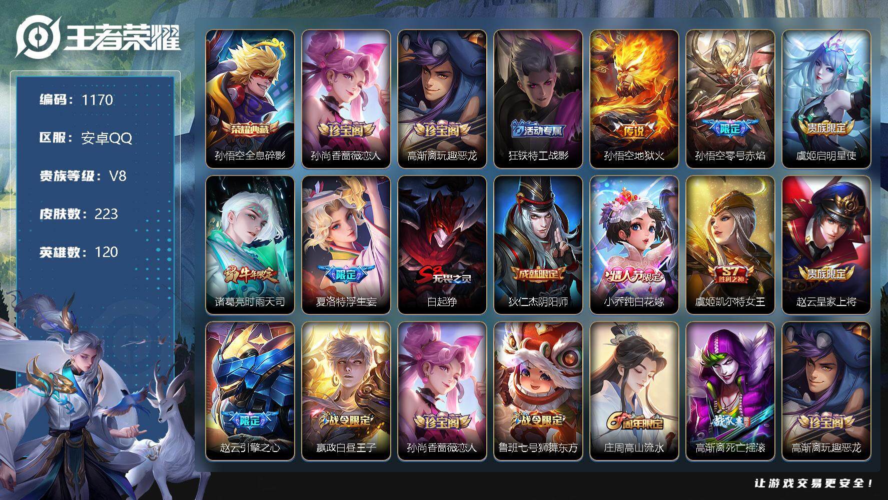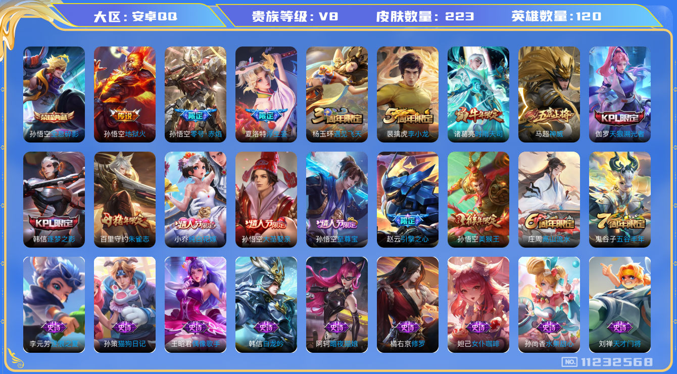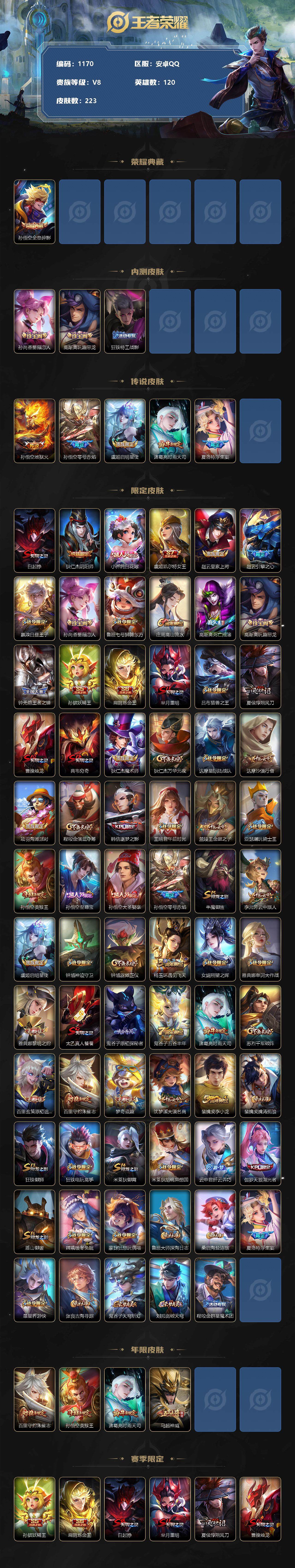 [11232568]【商品标题】:安卓Q-V8-荣耀黄金IV段位-120英雄-223皮肤-1典藏-0珍品无双-0无双-0珍品传说-5传说-52史诗