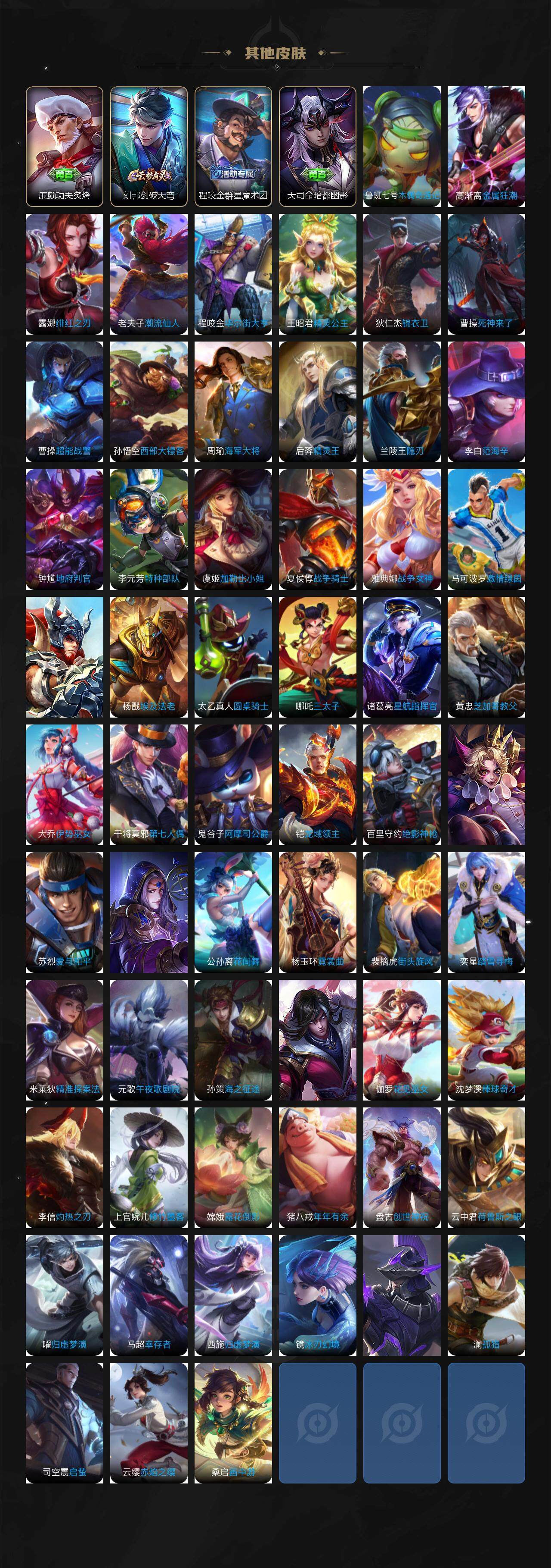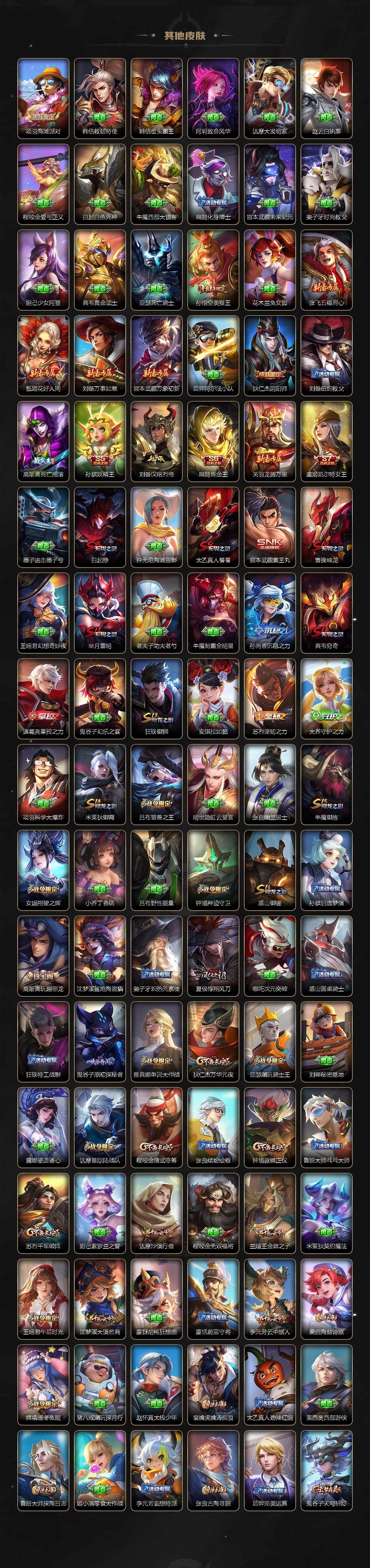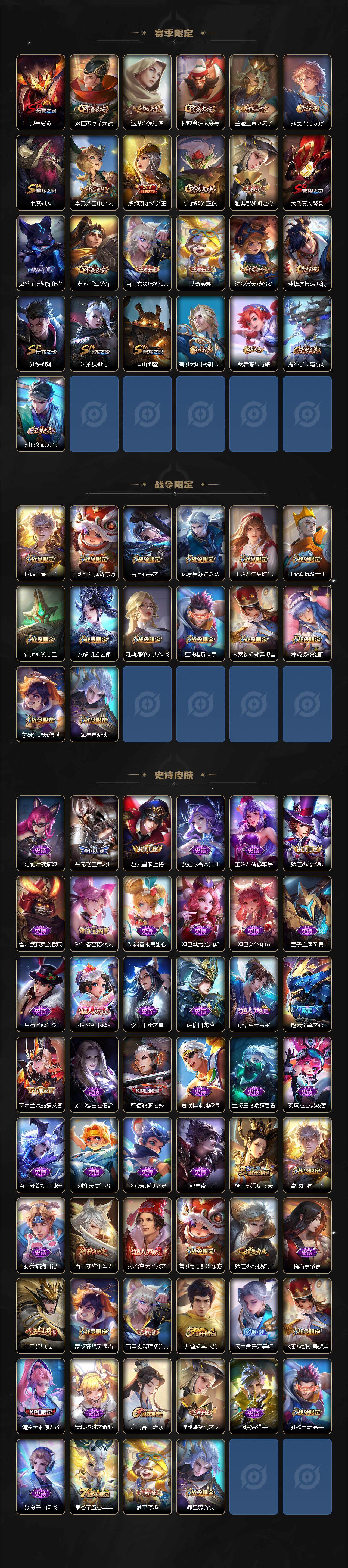 【限定皮肤】:白起狰,狄仁杰阴阳师,小乔纯白花嫁,虞姬凯尔特女王,赵云皇家上将,赵云引擎之心,嬴政白昼王子,孙尚香蔷薇恋人,鲁班七号狮舞东方,庄周高山流水,高渐离死亡摇滚,高渐离玩趣恶龙,钟无艳王者之锤,孙膑妖精王,扁鹊炼金王,芈月重明,吕布猎兽之王,夏侯惇朔风刀,曹操烛龙,典韦穷奇,狄仁杰魔术师,狄仁杰万华元夜,达摩星际陆战队,达摩沙漠行僧,项羽海滩派对,程咬金演武夺筹,韩信逐梦之影,王昭君午后时光,兰陵王金庭之子,亚瑟潮玩骑士王,孙悟空美猴王,孙悟空至尊宝,孙悟空大圣娶亲,孙悟空零号赤焰,牛魔御旌,李元芳云中旅人,虞姬启明星使,钟馗神迹守卫,钟馗驱傩正仪,杨玉环遇见飞天,女娲朔望之晖,雅典娜单词大作战,雅典娜黎明之约,太乙真人饕餮,鬼谷子原初探秘者,鬼谷子五谷丰年,诸葛亮时雨天司,苏烈千军破阵,百里玄策原初追逐者,百里守约朱雀志,梦奇顽趣,沈梦溪大漠名商,裴擒虎李小龙,裴擒虎擒涛扼浪,狂铁御狮,狂铁电玩高手,米莱狄御霄,米莱狄胡桃异想国,云中君纤云弄巧,伽罗天狼溯光者,盾山御銮,嫦娥暖冬兔眠,蒙犽狂想玩偶喵,鲁班大师探海日志,桑启海盐诗旅,夏洛特浮生妄,暃星界游侠,张良古海寻踪,鬼谷子天穹祈灯,刘邦剑破天穹,程咬金群星魔术团