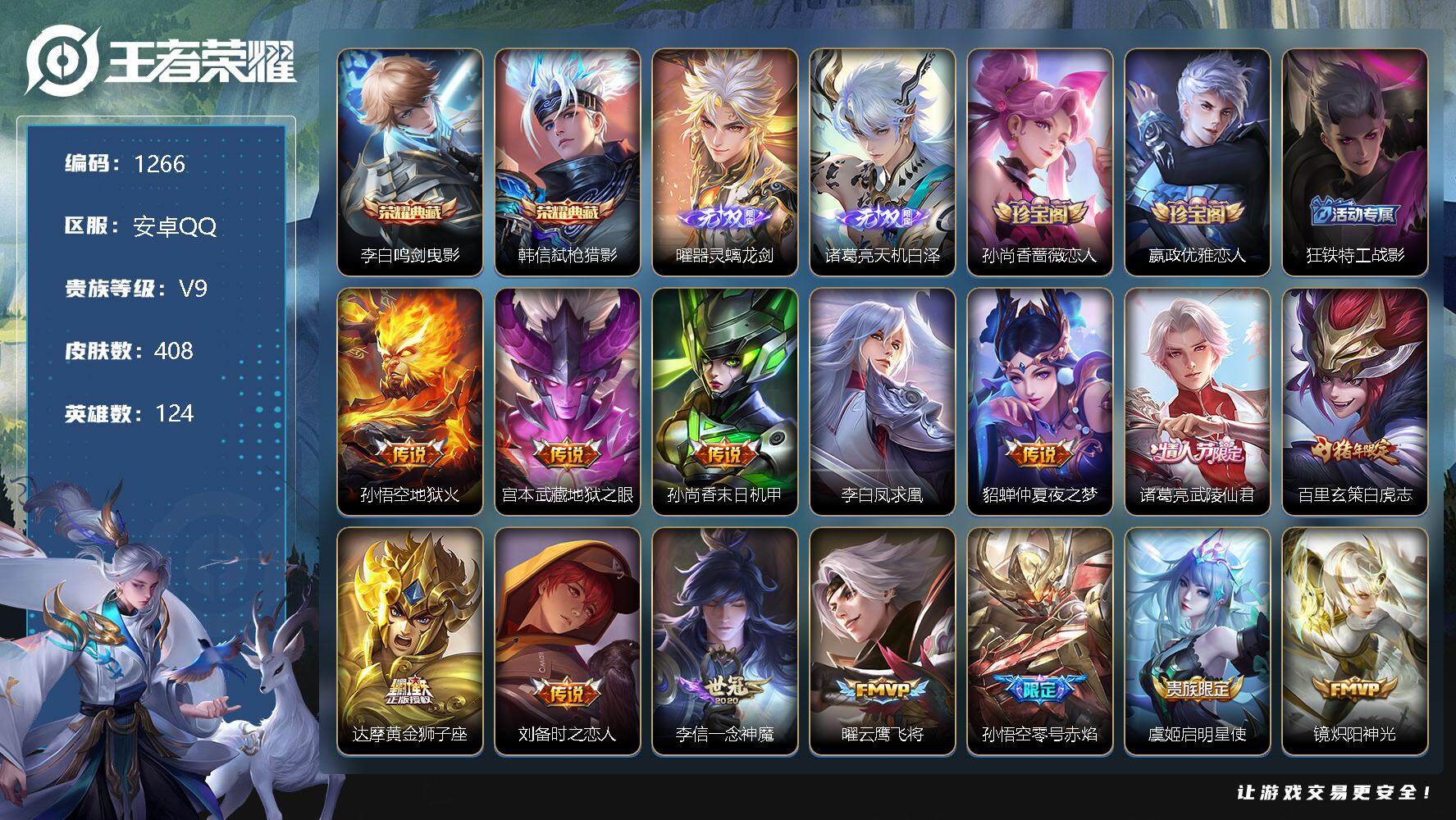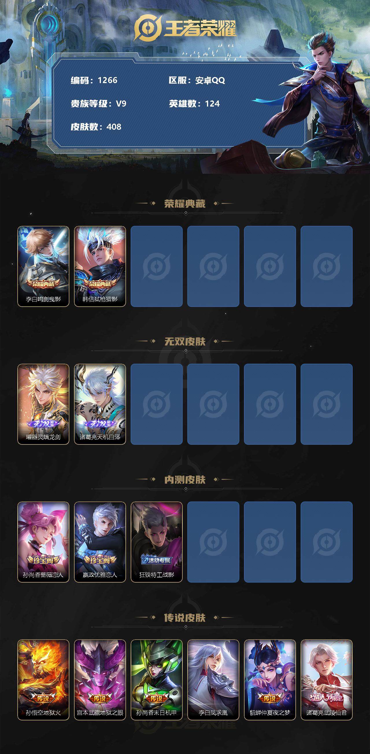 [11362869]【商品标题】:安卓Q-V9-永恒钻石IV段位-124英雄-408皮肤-2典藏-0珍品无双-2无双-0珍品传说-39传说-128史诗