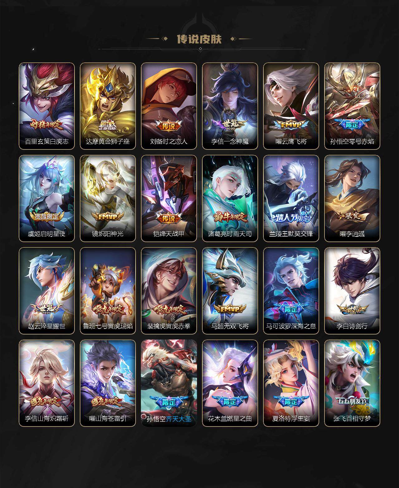 【传说皮肤】:公孙离云诺千山,司空震愿照山河定,澜愿照九州拓,铠冥王哈迪斯,典韦战鼓燎原,澜逐花归海,露娜霜月吟,宫本武藏惊梅引,澜电玩雷克斯,张飞百相守梦,夏洛特浮生妄,花木兰燃星之曲,孙悟空齐天大圣,曜山海苍雷引,李信山海炽霜斩,李白诗剑行,马可波罗深海之息,马超无双飞将,裴擒虎寅虎赤拳,鲁班七号寅虎瑞焰,赵云淬星耀世,曜李逍遥 ,兰陵王默契交锋,诸葛亮时雨天司,铠绛天战甲,镜炽阳神光,虞姬启明星使,孙悟空零号赤焰,曜云鹰飞将,李信一念神魔,刘备时之恋人,达摩黄金狮子座,百里玄策白虎志,诸葛亮武陵仙君,貂蝉仲夏夜之梦,李白凤求凰,孙尚香末日机甲,宫本武藏地狱之眼,孙悟空地狱火
